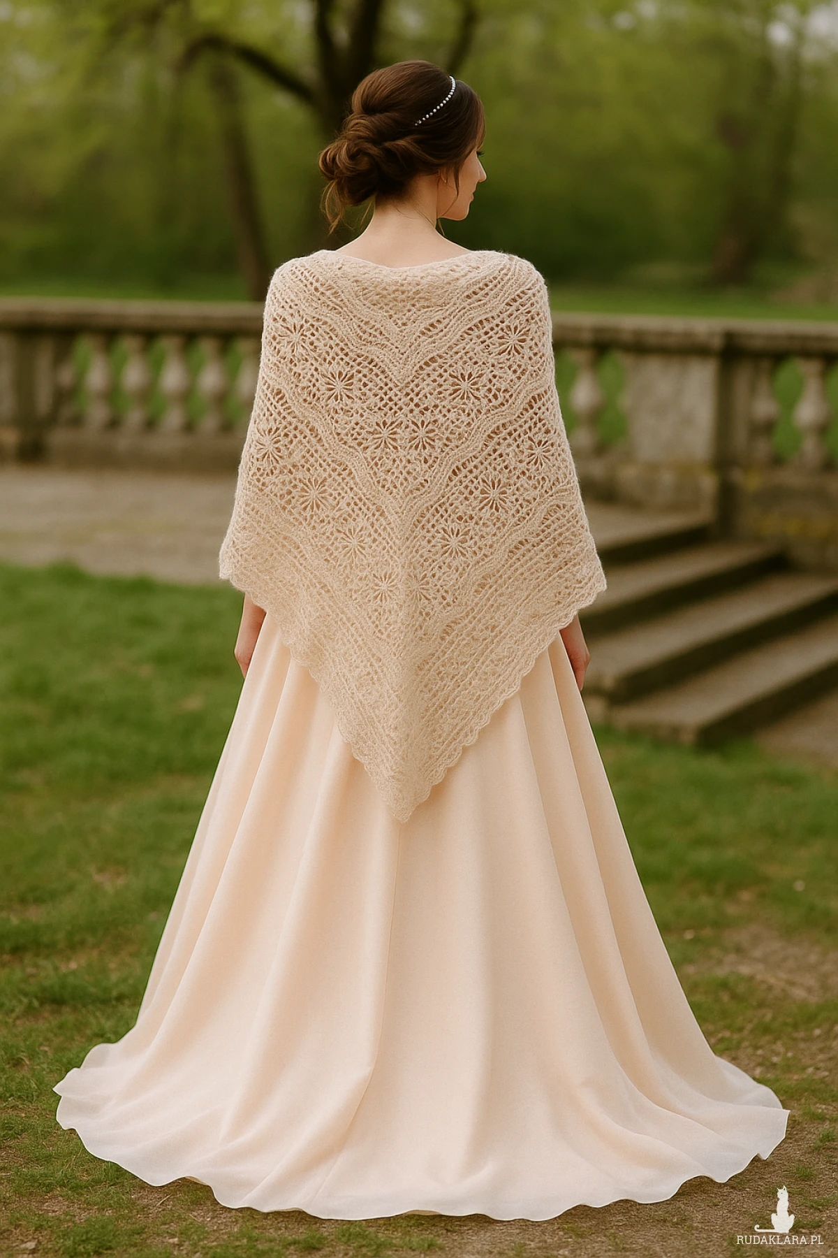 Ręcznie robiona chusta to artystyczne dopełnienie sukni ślubnej dodające jej uroku i romantyzmu. Wykonanie handmade sprawia, że jest niepowtarzalnym, wysokiej jakości dodatkiem, który uczyni ten dzień jeszcze bardziej niezapomnianym.