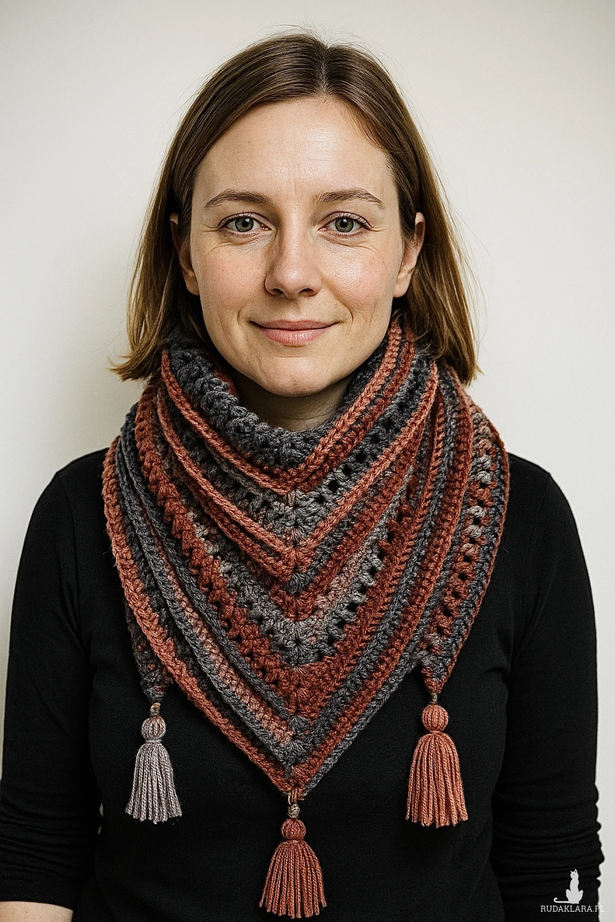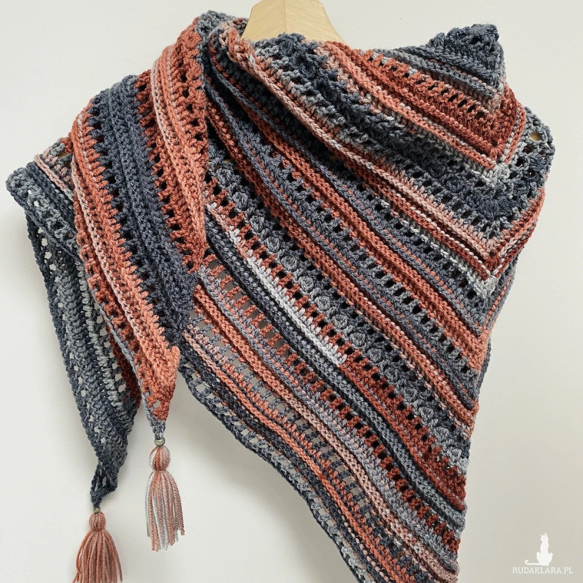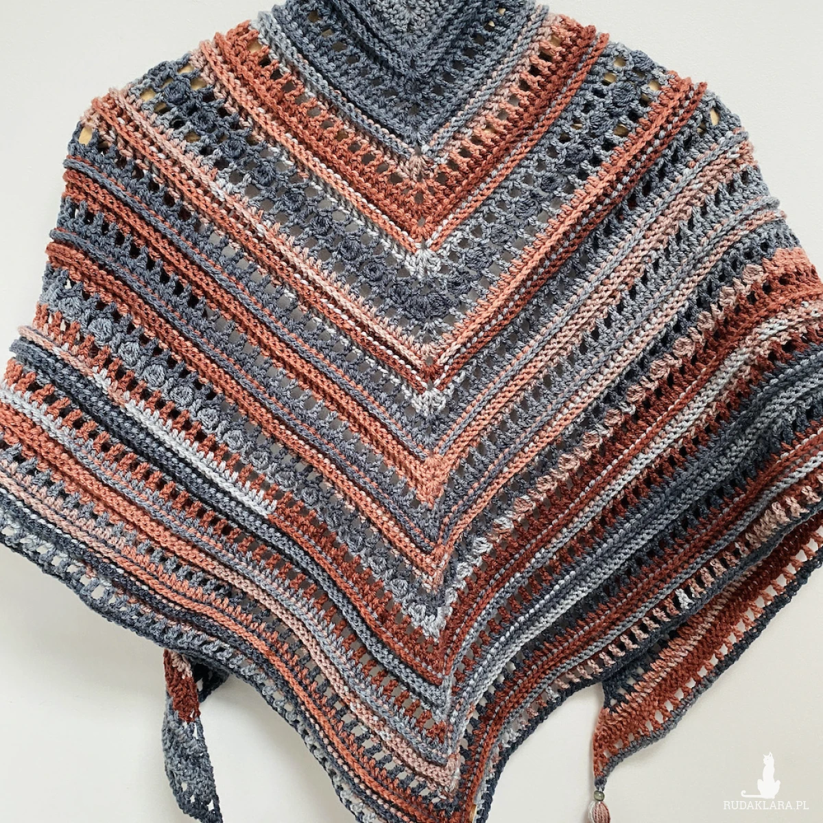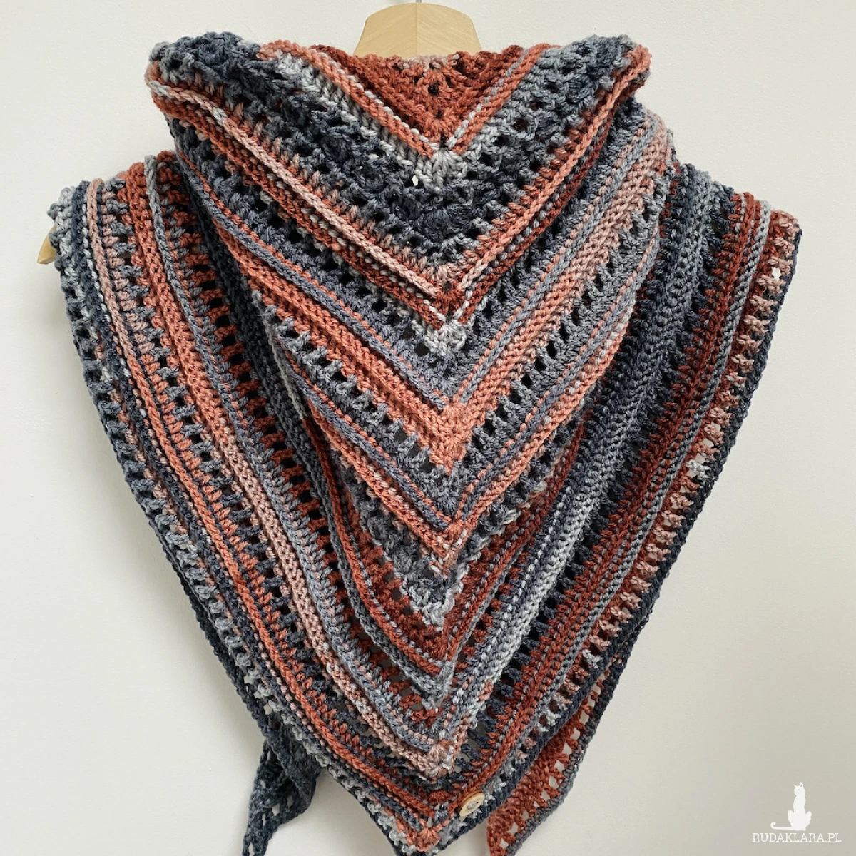 Chustę wykonałam na szydełku z miękkiej włóczki akrylowej, która zachwyca intensywnością koloru i delikatnością. Certyfikat OEKO-TEX® Standard 100 potwierdza, że jest bezpieczna dla a zdrowia materiały użyte do jej produkcji są wolne od szkodliwych substancji chemicznych.