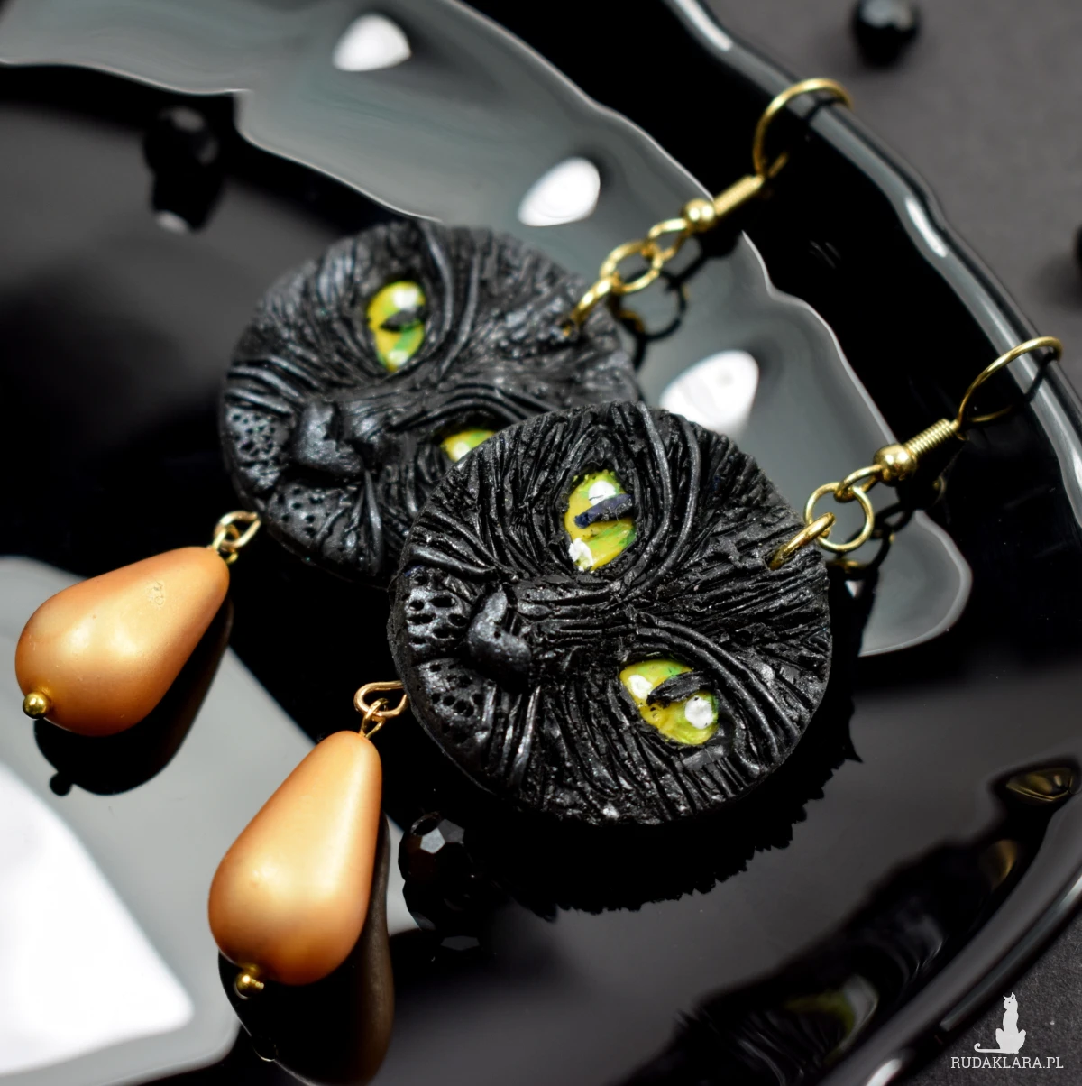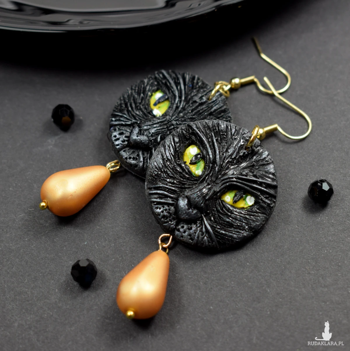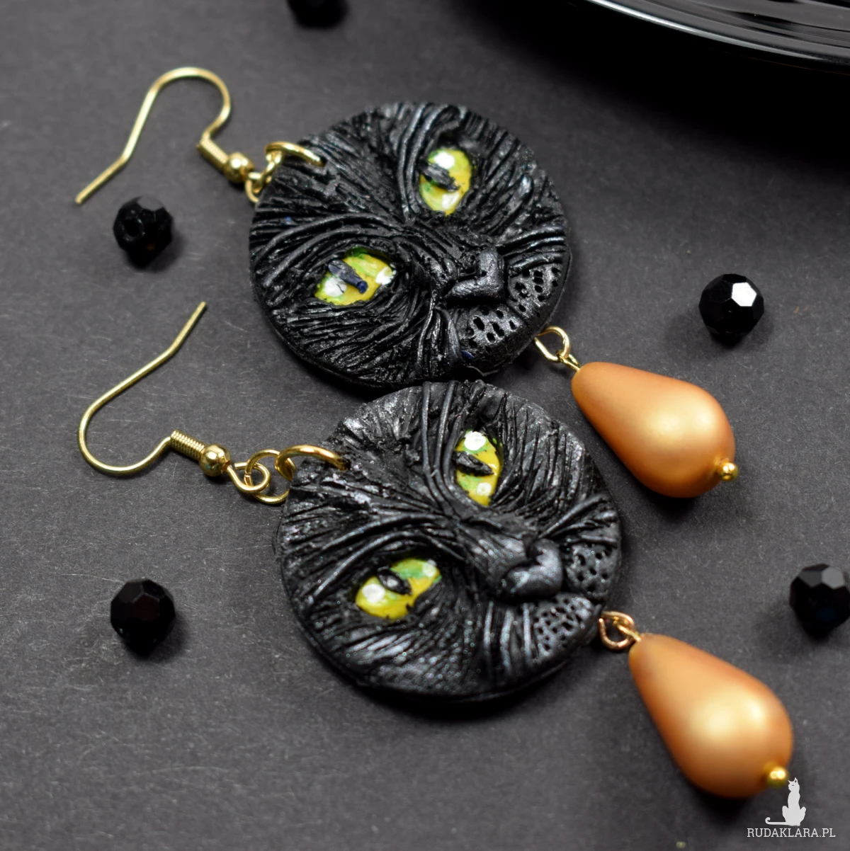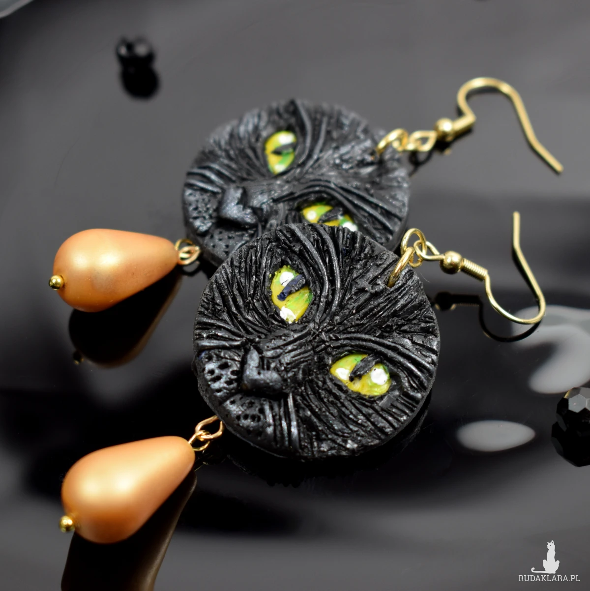 Czarny kot - długie kolczyki ze złotymi kropelkami - biżuteria z charakterem