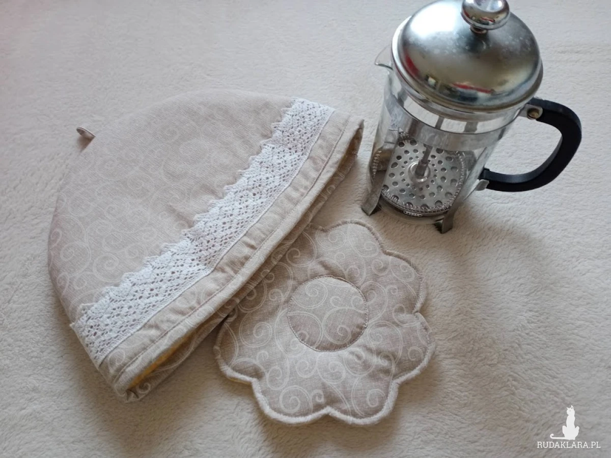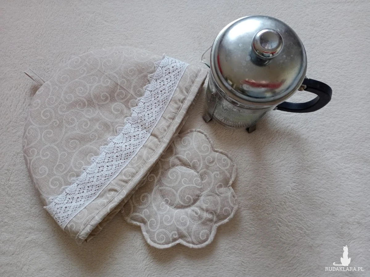 Już jesień, więc taki ocieplacz będzie bardzo przydatnym, a wręcz niezastąpionym gadżetem w Twoim domu. Wykonany z bawełny , ozdobiony bawełnianą koronką, podszewka z bawełny. Ocieplacz wewnątrz posiada wszytą ocieplinę dzięki której ma on właściwości izolujące. Utrzymuje stałą temperaturę ok. 2-3 godzin.. w komplecie podkładka pod dzbanek w kształcie kwiatka