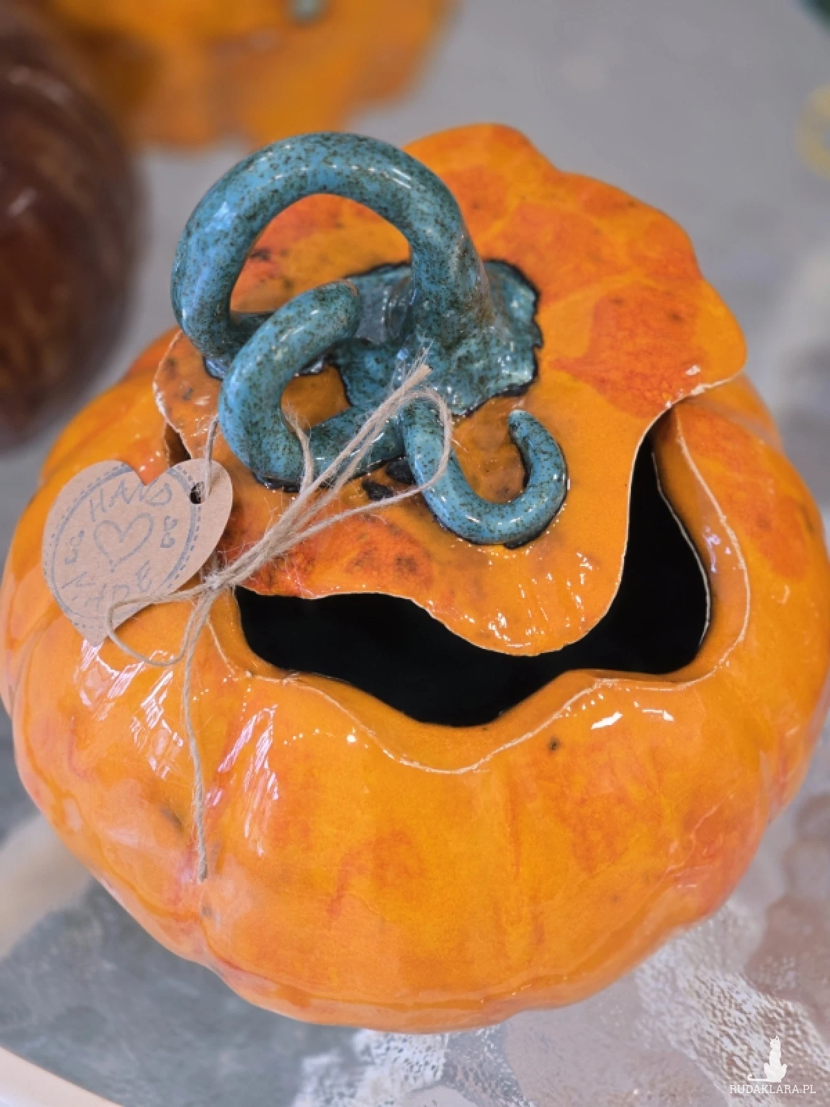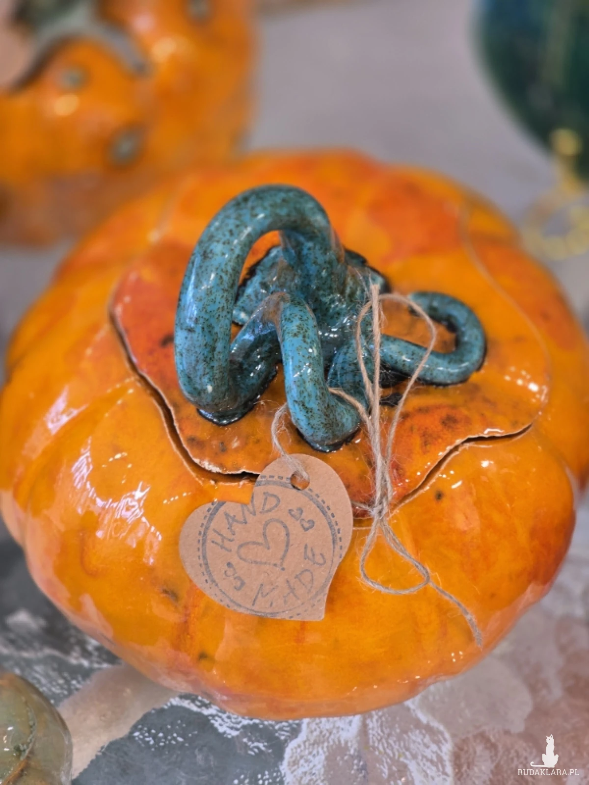 Dynia ceramiczna, wykonana ręcznie, wypalana dwukrotnie w temperaturze 950 stopni na biskwit i w temperaturze 1050 stopni ze szkliwem. Szkliwo w pięknym pomarańczowym kolorze z efektami, wszystkie przetarcia i odcienie są efektem zamierzonym i to stanowi o jego wyjątkowych walorach dekoracyjnych.