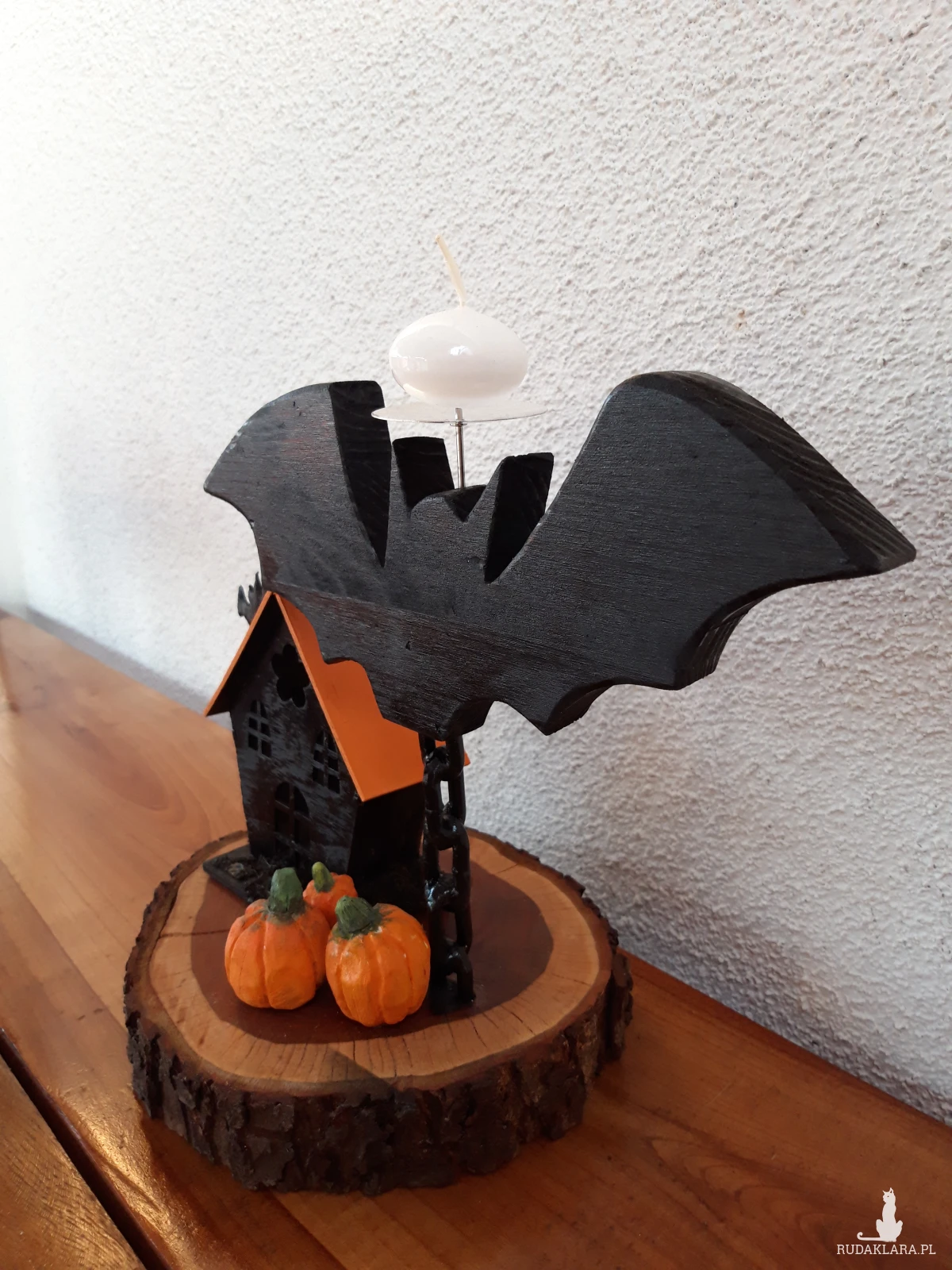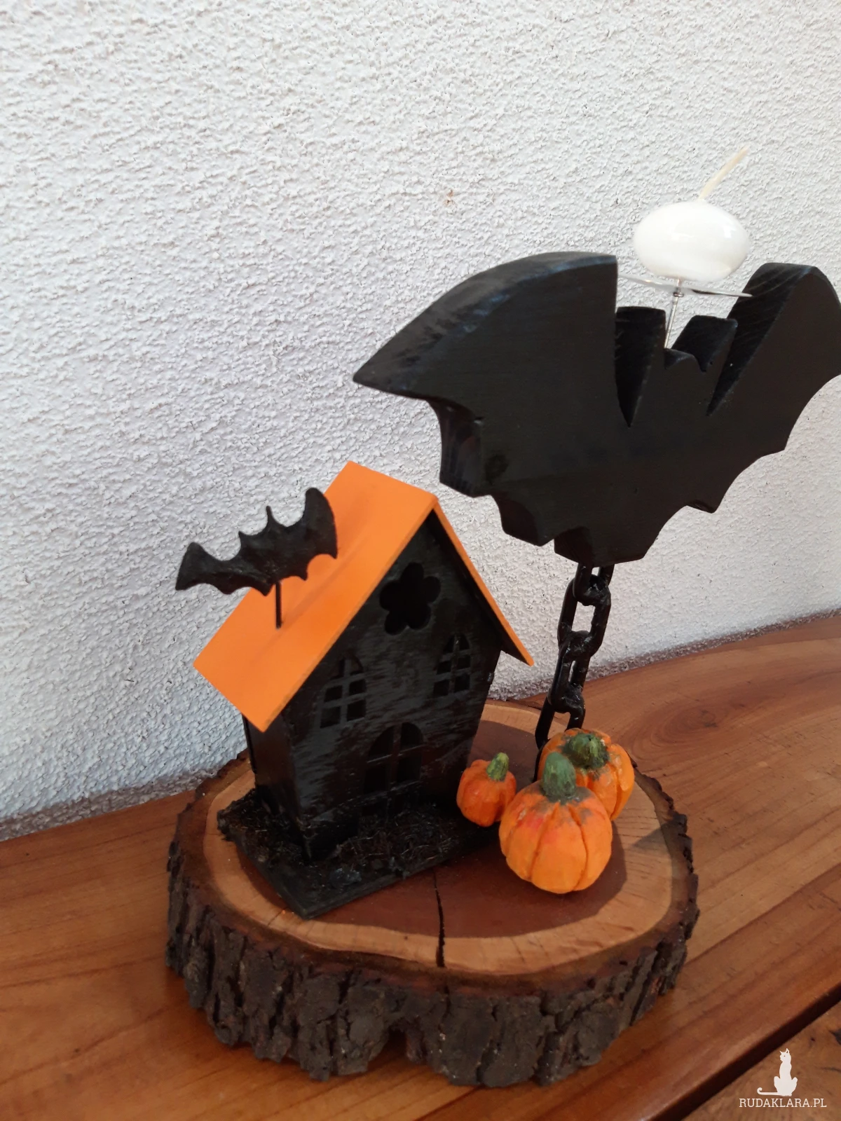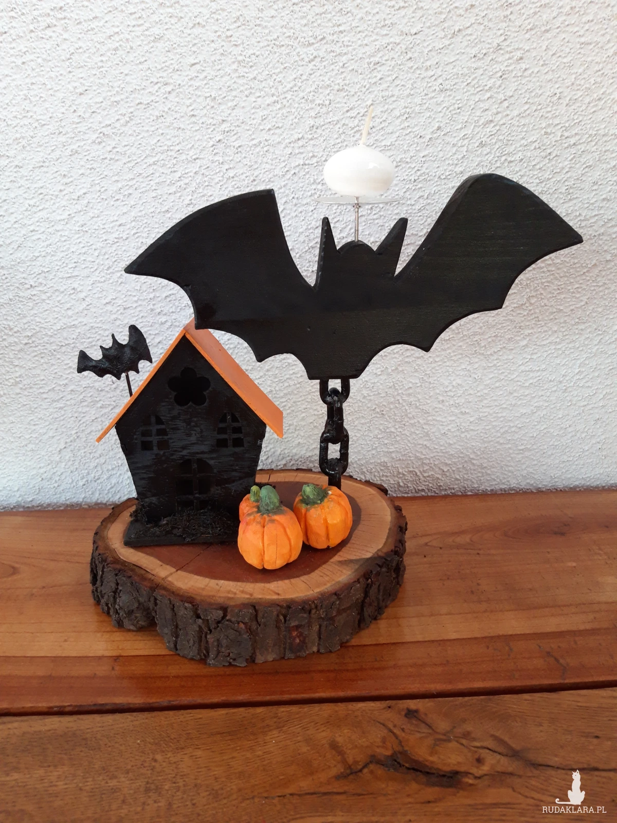 Świecznik- Halloween w kształcie nietoperza na jedną świeczkę śr. 5 cm, na przepięknym ok. 50 letnim plastrze drzewa śliwy, doskonale sprawdzi się jako dekoracja stołu podczas przyjęcia zorganizowanego z okazji tego święta, jak również ozdoba na komodę lub okno. Czarny nietoperz wycięty z drewna sosnowego został osadzony na zespawanych oczkach metalowego łańcucha, mroczny domek i pomarańczowe, wyrzeźbione z drewna dynie nadają całości tajemniczego klimatu.