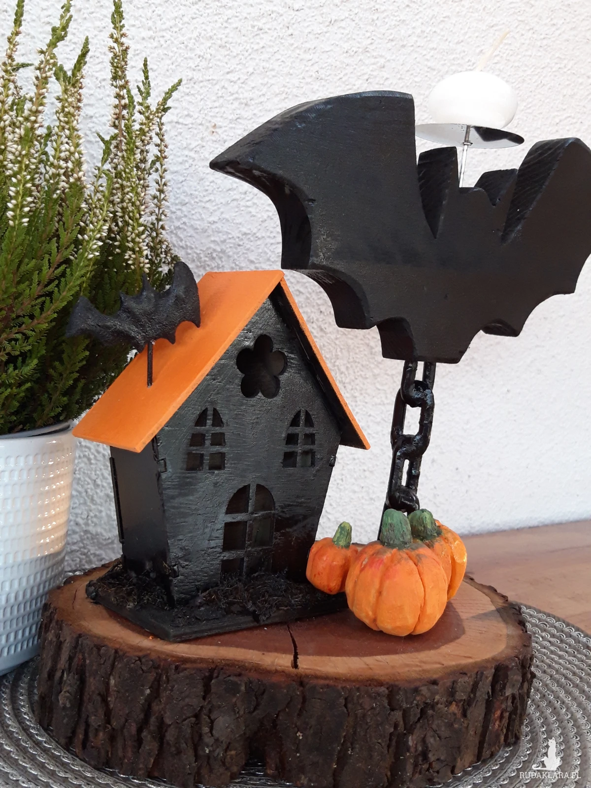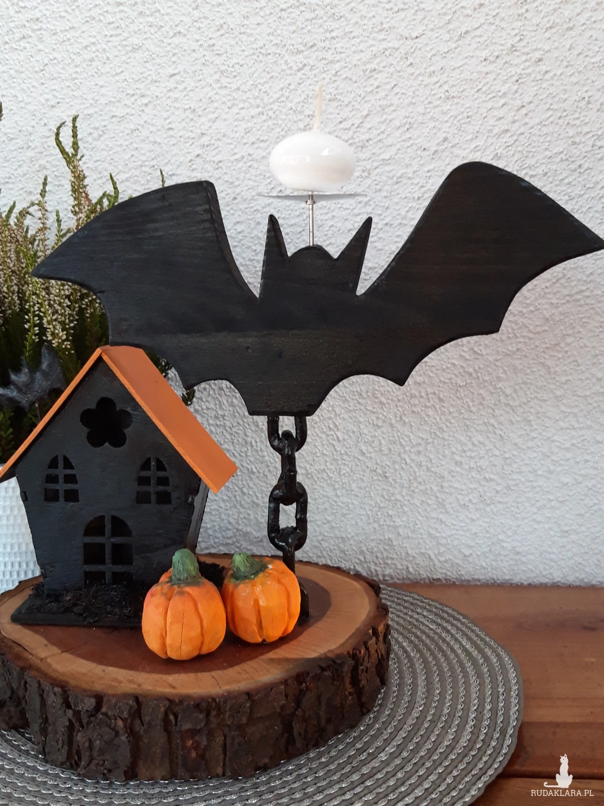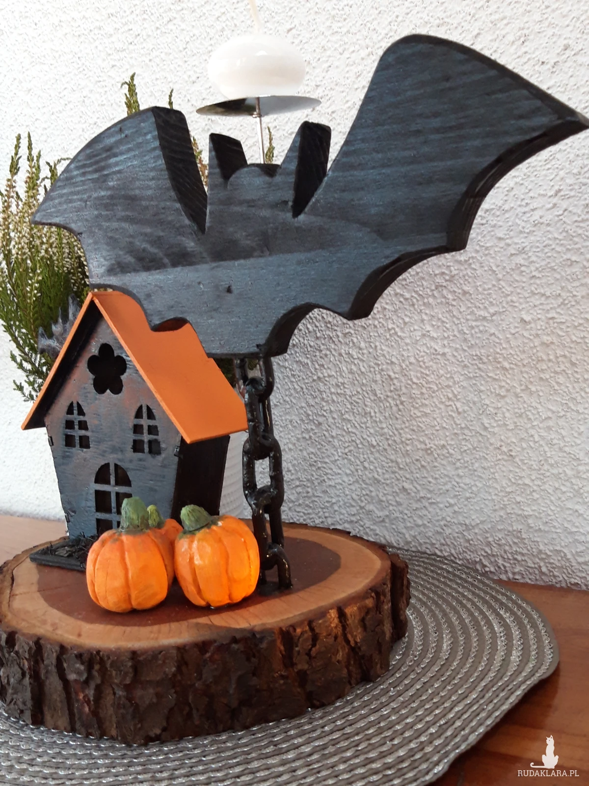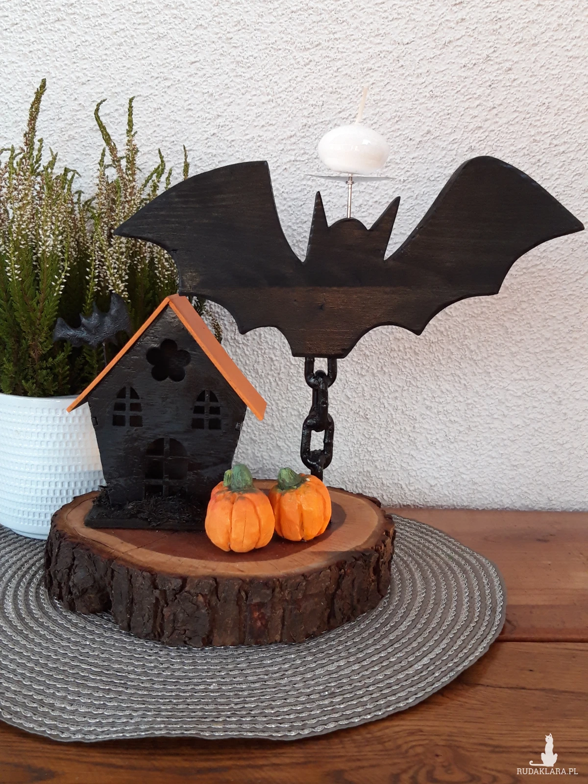 Świecznik- Halloween w kształcie nietoperza na jedną świeczkę śr. 5 cm, na przepięknym ok. 50 letnim plastrze drzewa śliwy, doskonale sprawdzi się jako dekoracja stołu podczas przyjęcia zorganizowanego z okazji tego święta, jak również ozdoba na komodę lub okno. Czarny nietoperz wycięty z drewna sosnowego został osadzony na zespawanych oczkach metalowego łańcucha, mroczny domek i pomarańczowe, wyrzeźbione z drewna dynie nadają całości tajemniczego klimatu.
