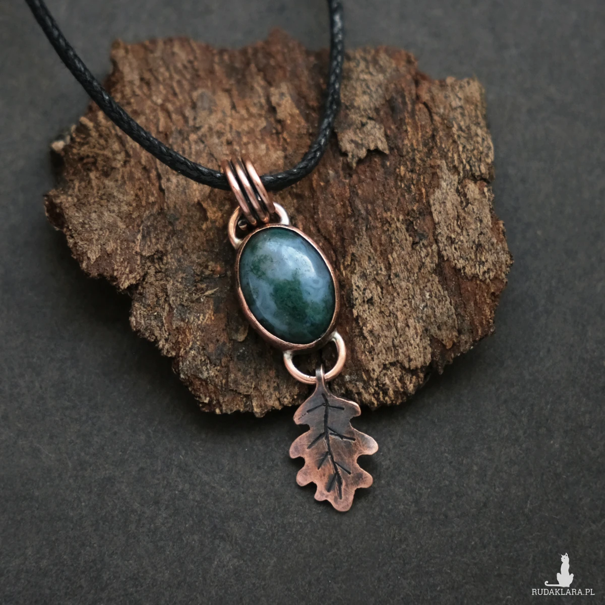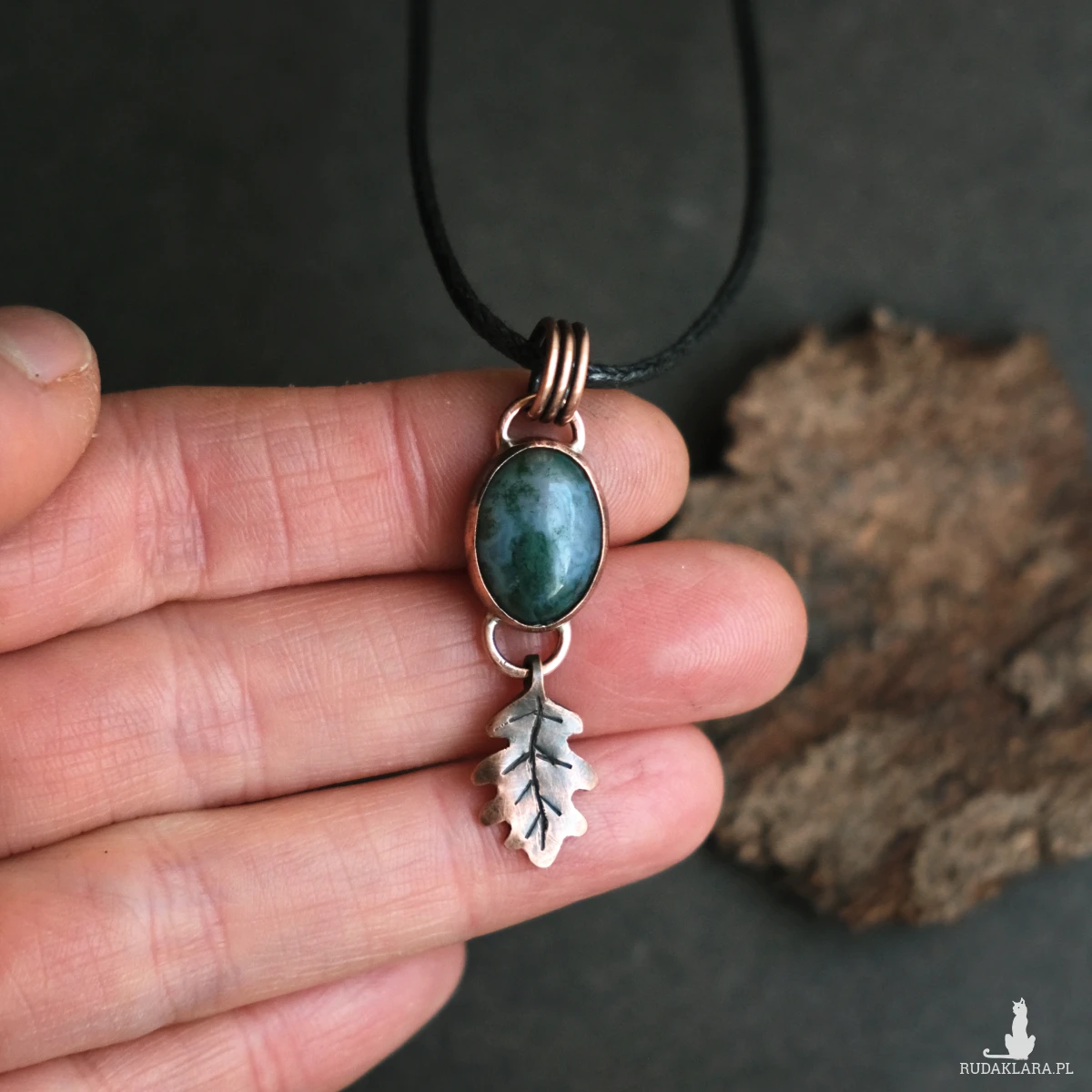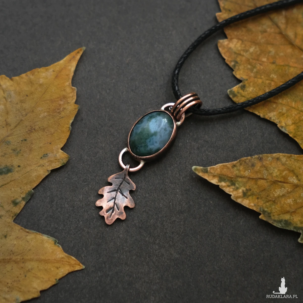 Drobny miedziany wisiorek z listkiem dębu mieści w sobie kamień agatu indyjskiego o delikatnym niebiesko zielonkawym kolorze. Wszystkie elementy zostały stworzone ręcznie, co nadaje mu oryginalnego leśnego charakteru. Wisiorek ma naniesioną patynę. Idealnie sprawdzi się na dekolcie miłośniczki natury, ceniącej wyroby rękodzielnicze oraz delikatną biżuterię.