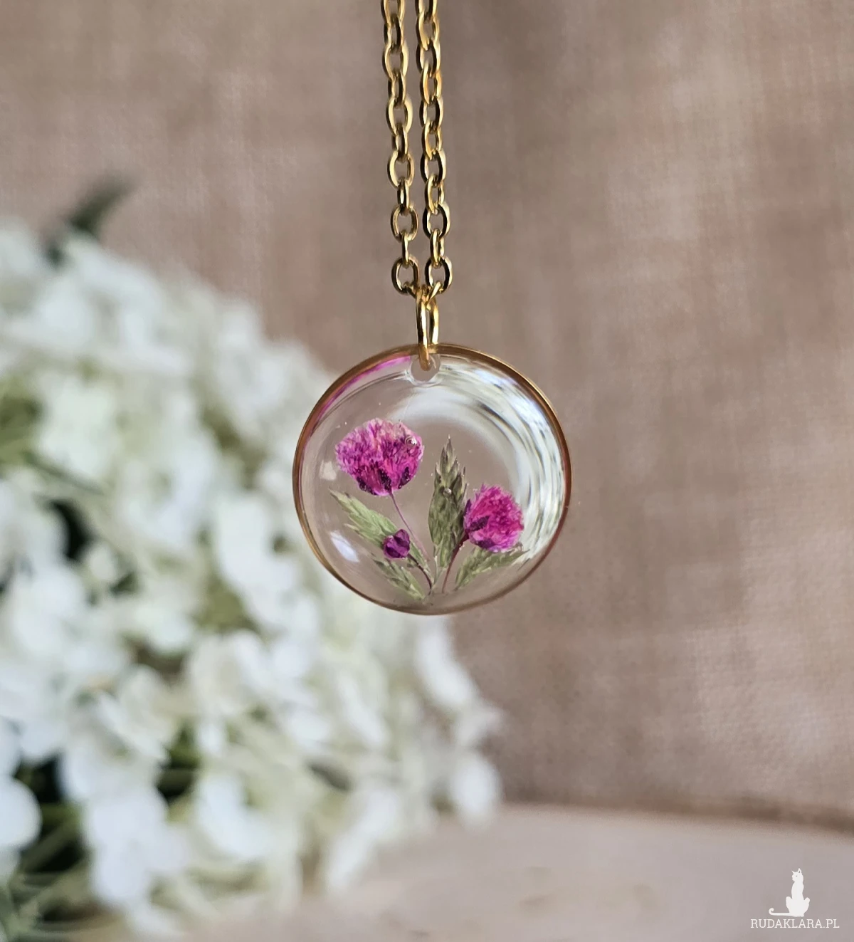 Oferuję Państwu unikalną biżuterię. Zawieszka jest wykonana z suszonych kwiatów i żywicy epoksydowej. Biżuteria jest wspaniałym i oryginalnym prezentem na lata.