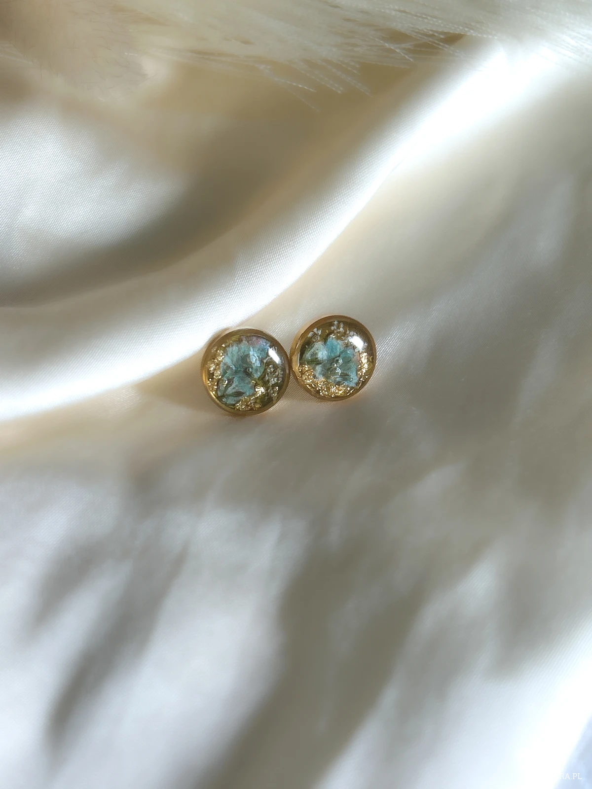 ✨ Ręcznie robione kolczyki wkrętki z prawdziwymi kwiatami zatopionymi w lśniącej żywicy. Całość oprawiona w złote kółeczko ✨