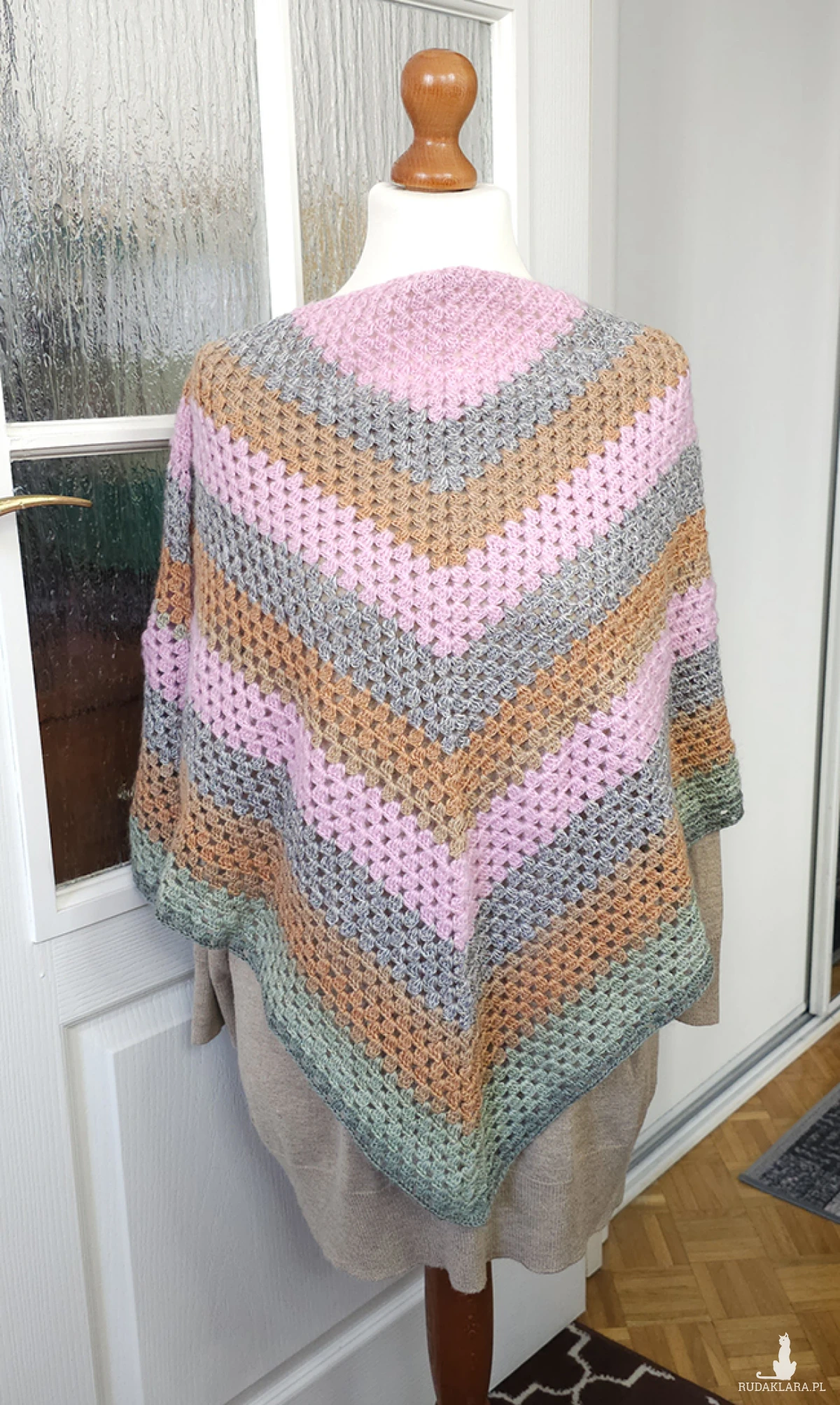 Wzór opiera się na klasycznym, otwartym ściegu typu "granny", tworząc charakterystyczne trójkątne pasy.