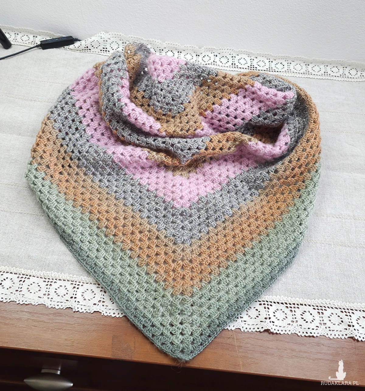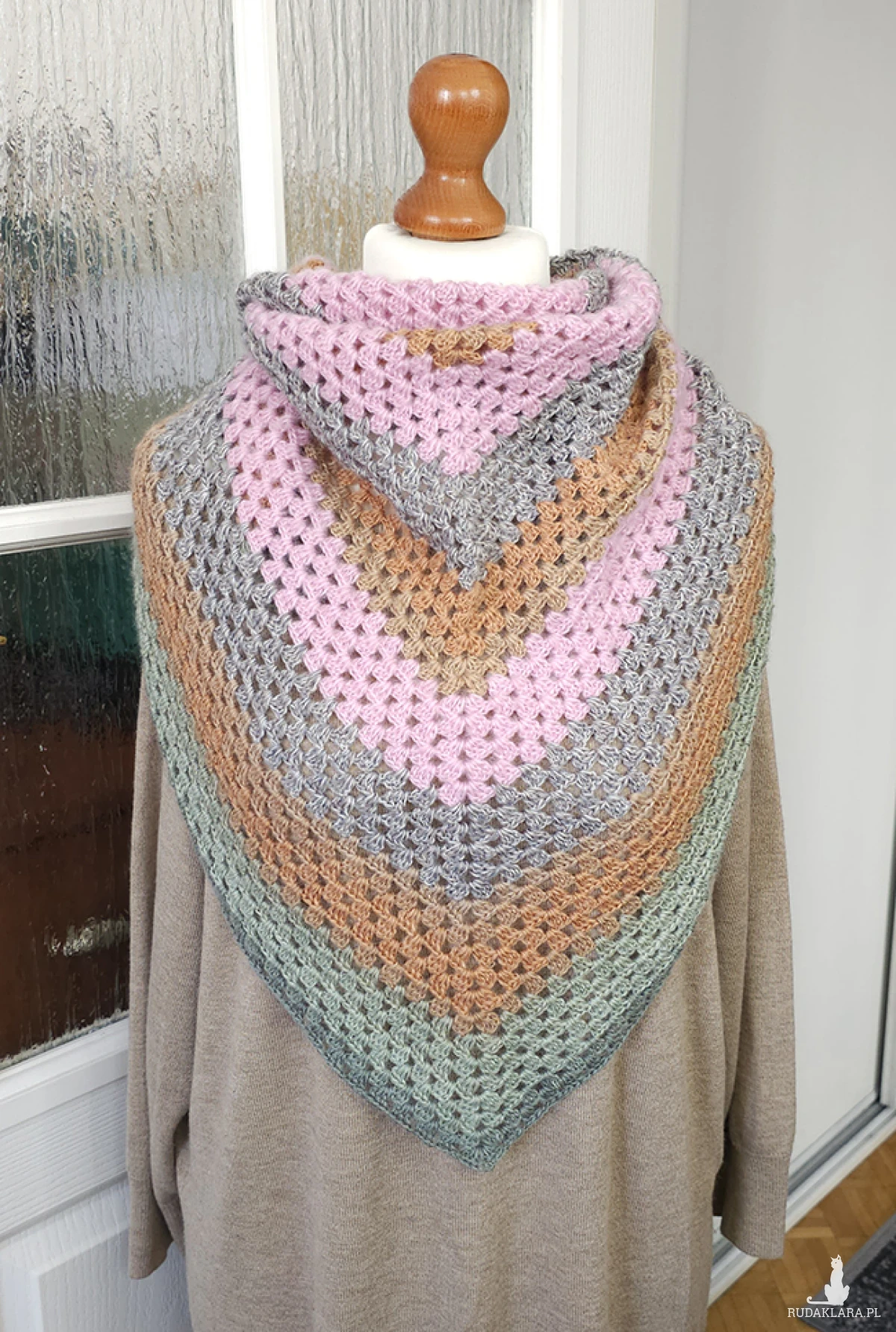 Użycie cieniowanej włóczki o pastelowej kolorystyce (róż, szary, beż/brąz i szałwiowa zieleń) sprawia, że chusta jest nowoczesna i łatwo dopasuje się do różnych ubrań.