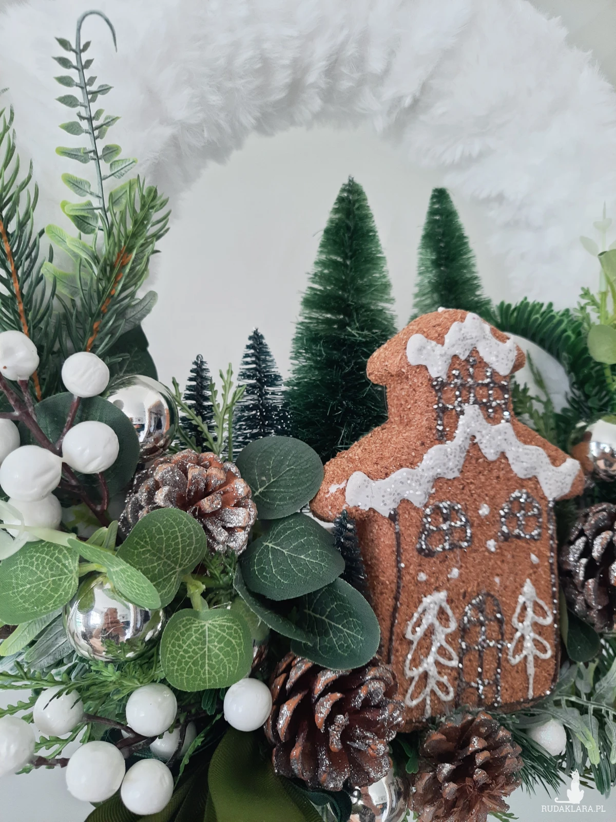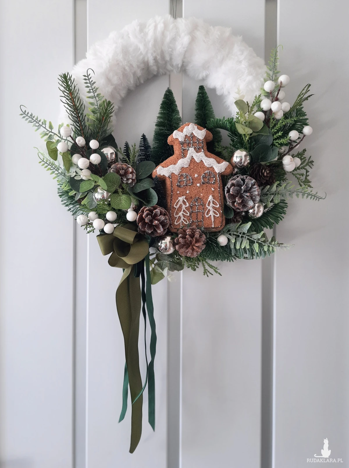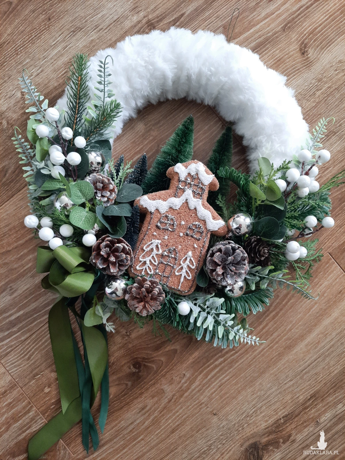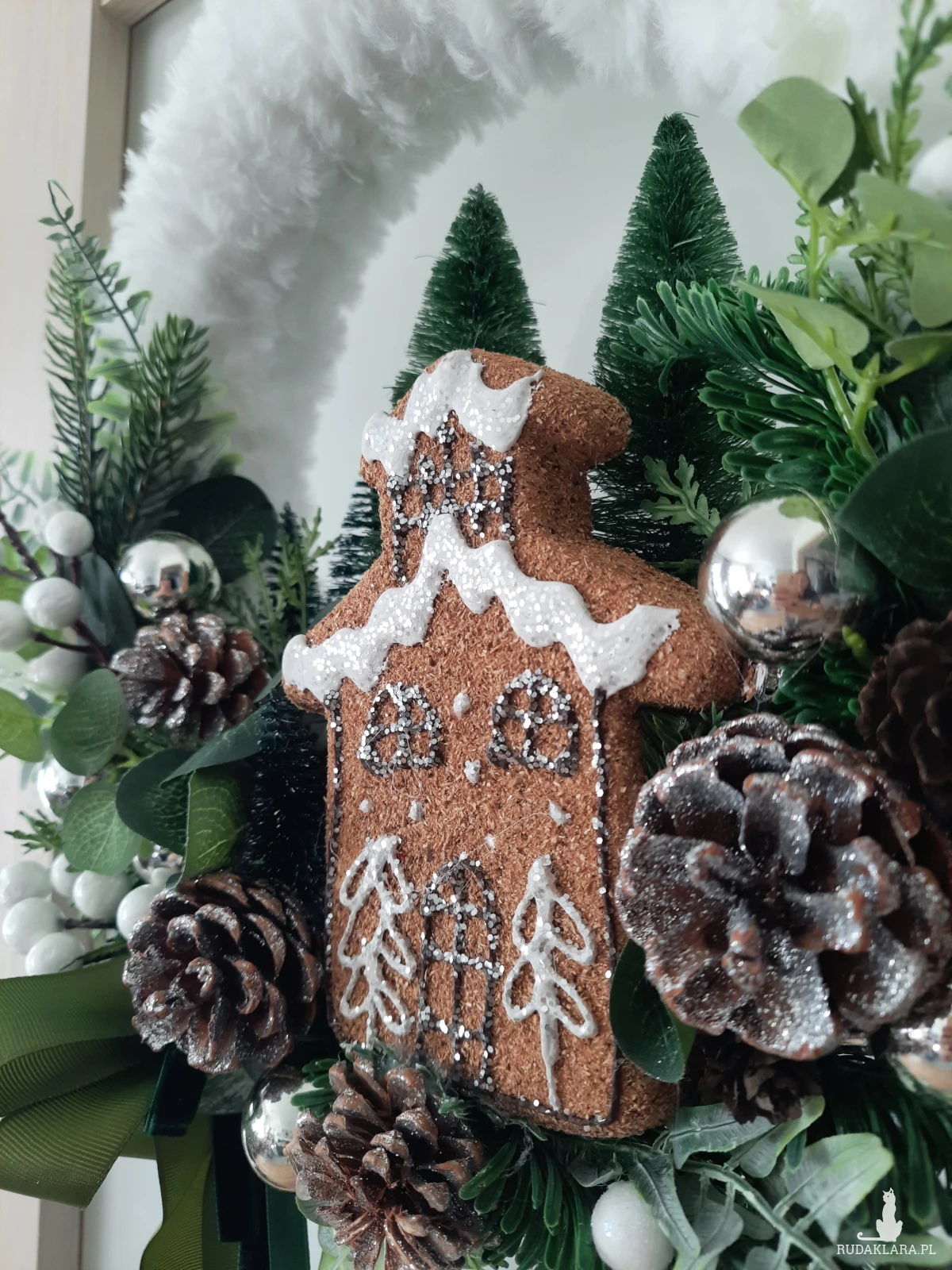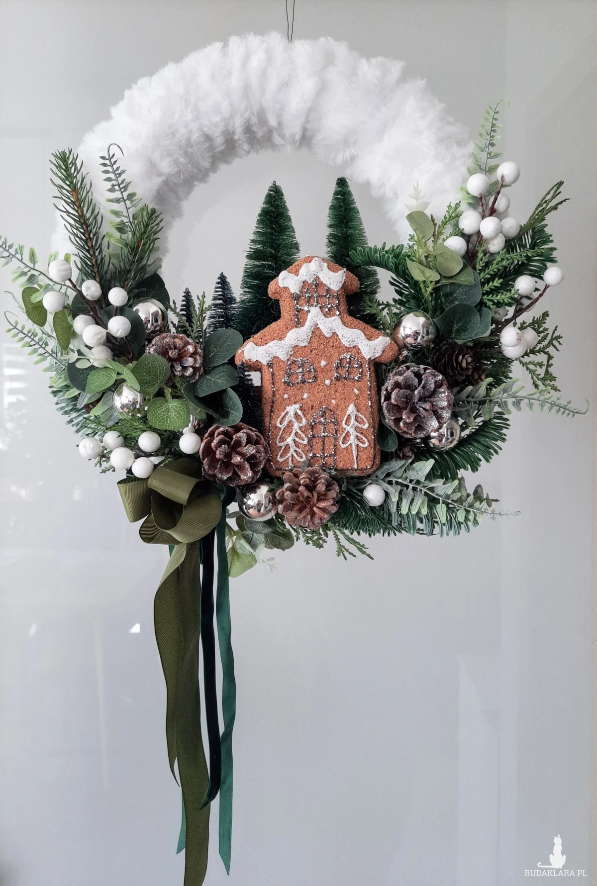 Puszysty wianek w odcieniach bieli I zieleni. Srebrne akcenty. W roli głównej pierniczkowy domek. Średnica w najbardziej wystających punktach 35cm+zwisająca wstążka