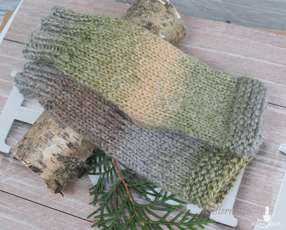 Krótkie mitenki z wełną w pięknych barwach: zielenie, delikatne szarości, brązy i zgaszone żółcie. Wykonane ręcznie, bezszwowo. Skład: 30% owcza wełna, 70% akryl. Mitenki są ciepłe, miękkie, niegryzące. Miłe w dotyku. Dopasowują się do dłoni. Nie powinny się mechacić. Dł. ok. 21 cm. Rozmiar uniwersalny. Zalecane pranie ręczne w temp. do 30 stopni. Nie wirować.