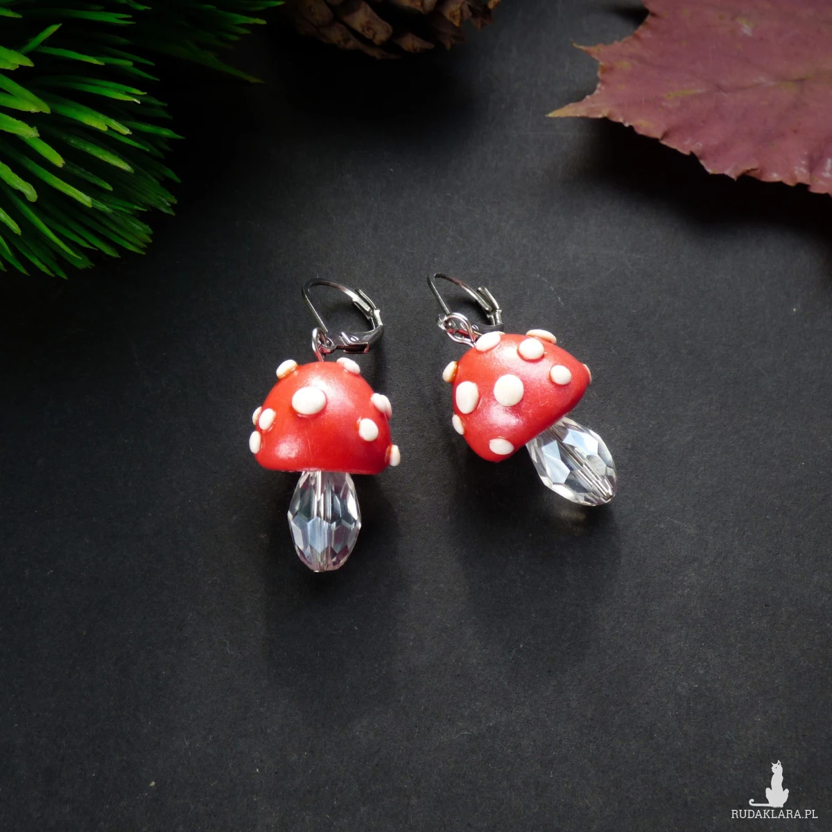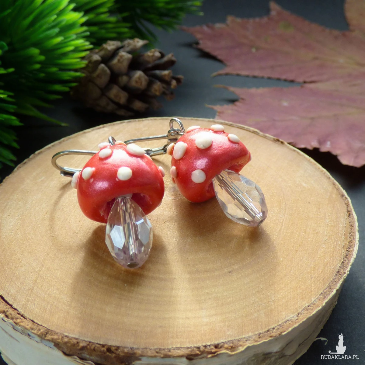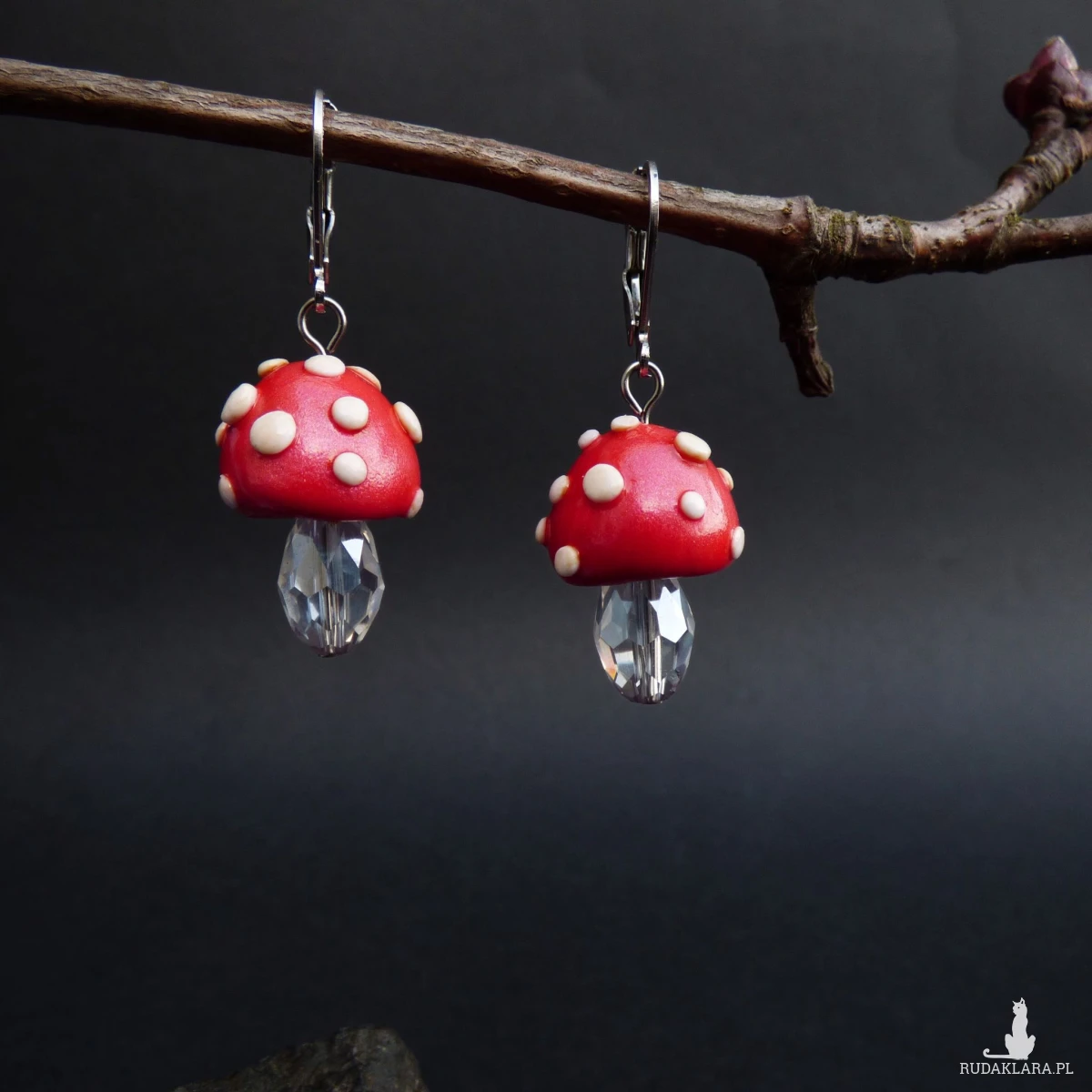 Urocze, autorskie kolczyki inspirowane muchomorem czerwonym, modelowane ręcznie z glinki polimerowej. Baśniowe grzybki z kryształową nóżką, niby kropla rosy. Czapeczki muchomorków mają soczystą czerwień z lekko metalicznym połyskiem i wypukłe białe kropeczki. Pod spodem zawiesiłam fasetowane, bezbarwne krople szkła kryształowego – dodają lekkości i pięknie łapią światło. Całość jest lekka i subtelnie mieni się przy każdym ruchu.