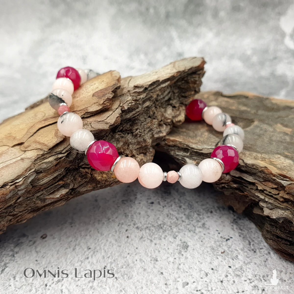 Wykonana z kul opalowego jadeitu, jadeitu fuksja oraz rodonitu.