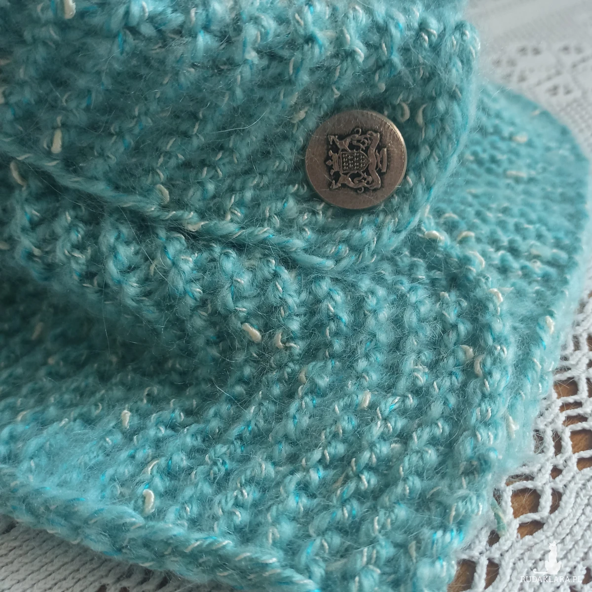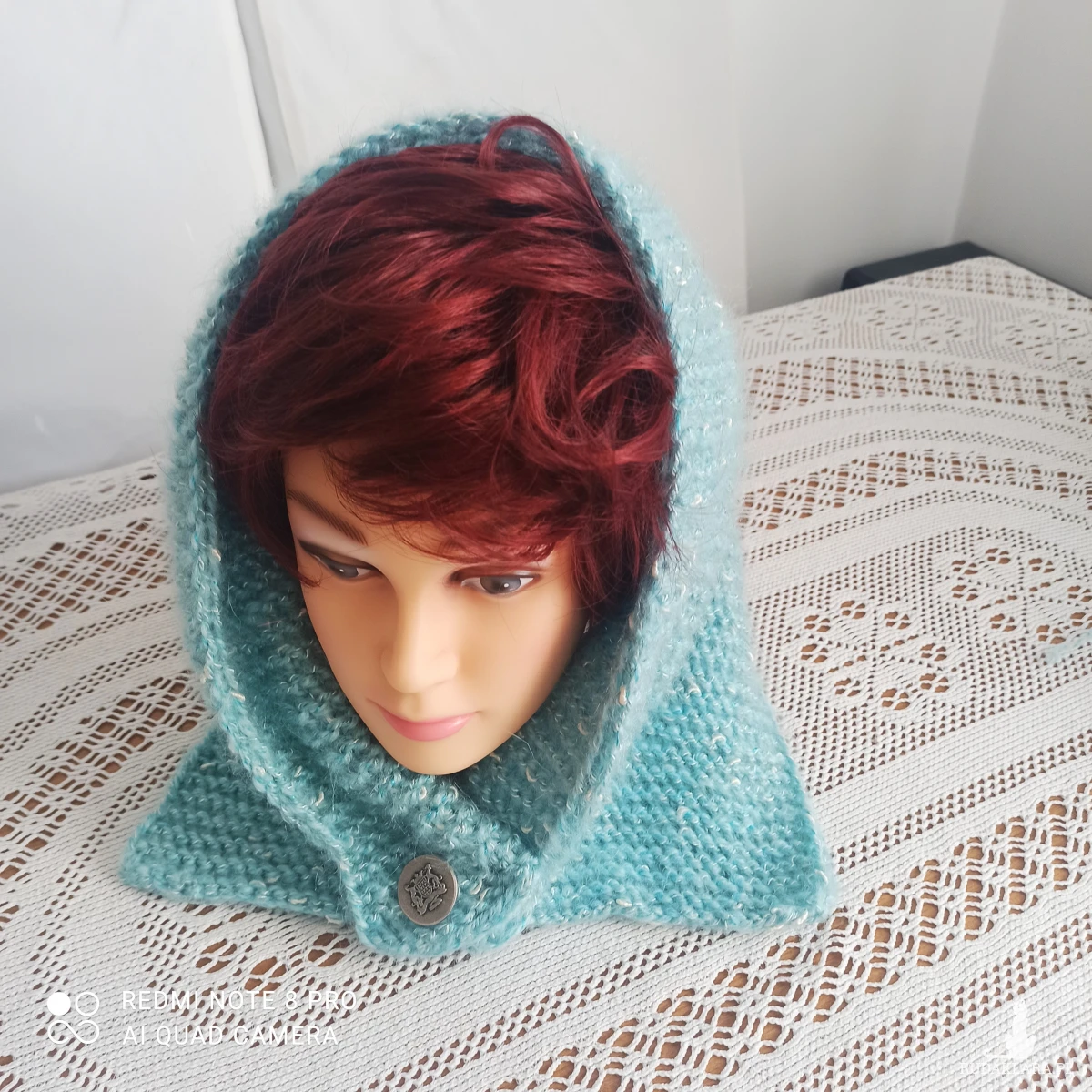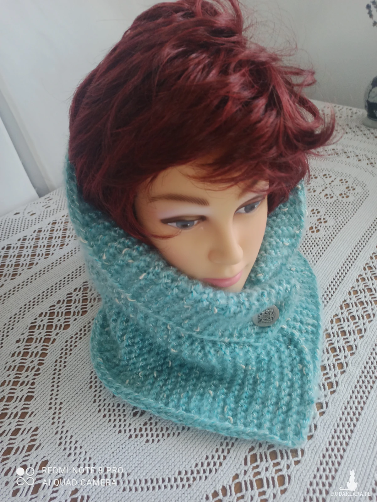 Komin w kolorze pudrowego niebieskiego wykonany handmade ściegiem francuskim z wełny moherowej Yorn z domieszką 20% akrylu, 20% poliamidu z niewidocznym zapięciem na zatrzask, ozdobiony efektownym guzikiem. Zapięcie jest praktyczne i wygodne w użyciu, można obwód dopasować do własnych potrzeb. Bardzo miękki, mięsisty w dotyku, wełna wysokiej jakości. Wyrób z tych grubszych. Skutecznie zatrzymuje ciepło, przepuszcza powietrze, łatwo przylega do ciała. Można wywinąć do góry by osłonić głowę lub po prostu na nią nałożyć, duża szerokość na to pozwala. Nie rozciąga się na trwałe lecz elastycznie pozwala regulować długość. Kolor modny w tym sezonie. Jedyny taki!!!