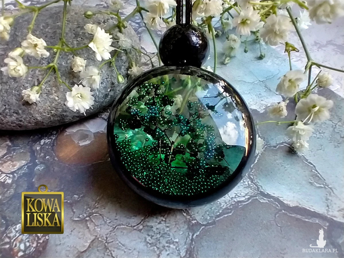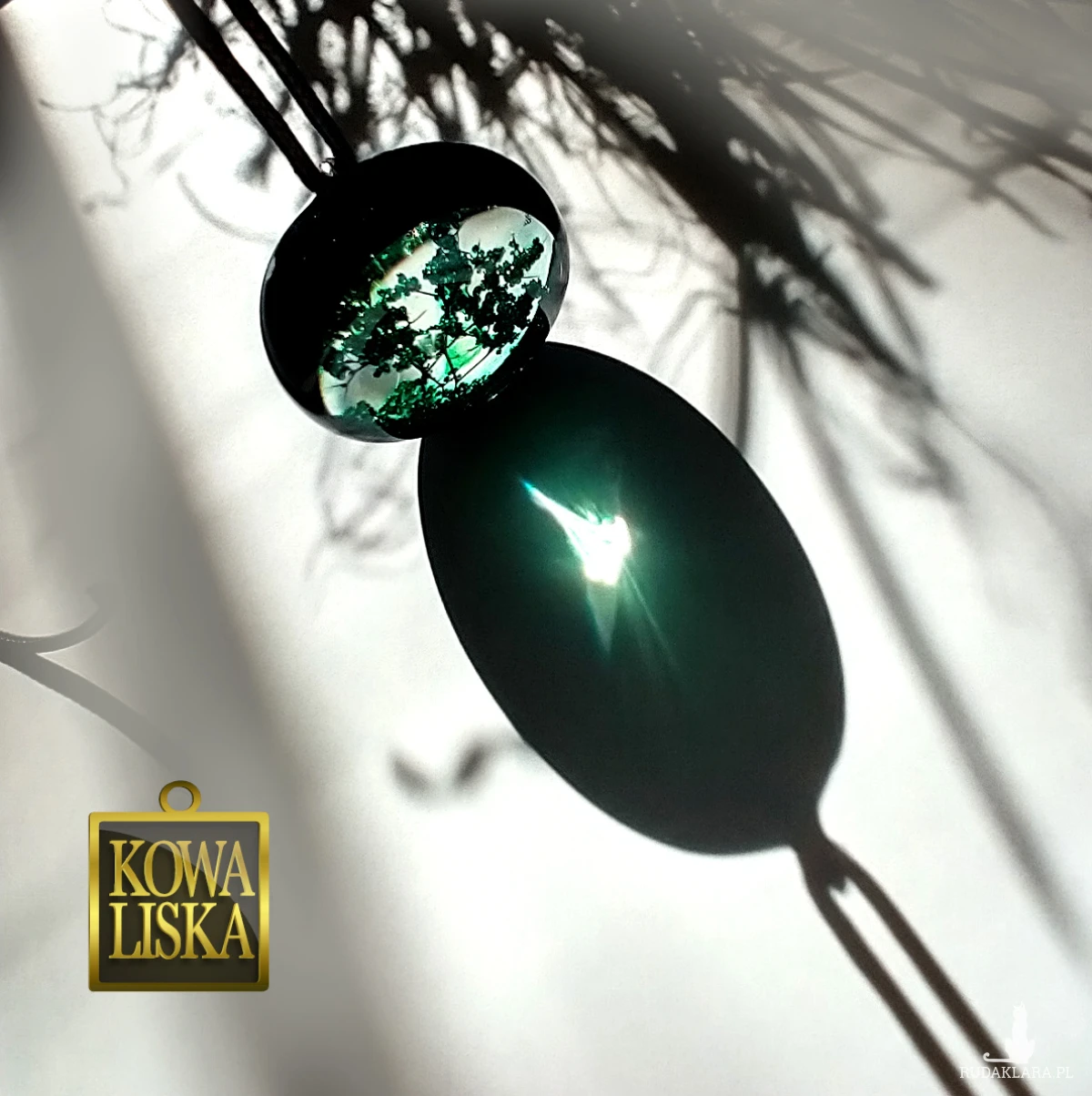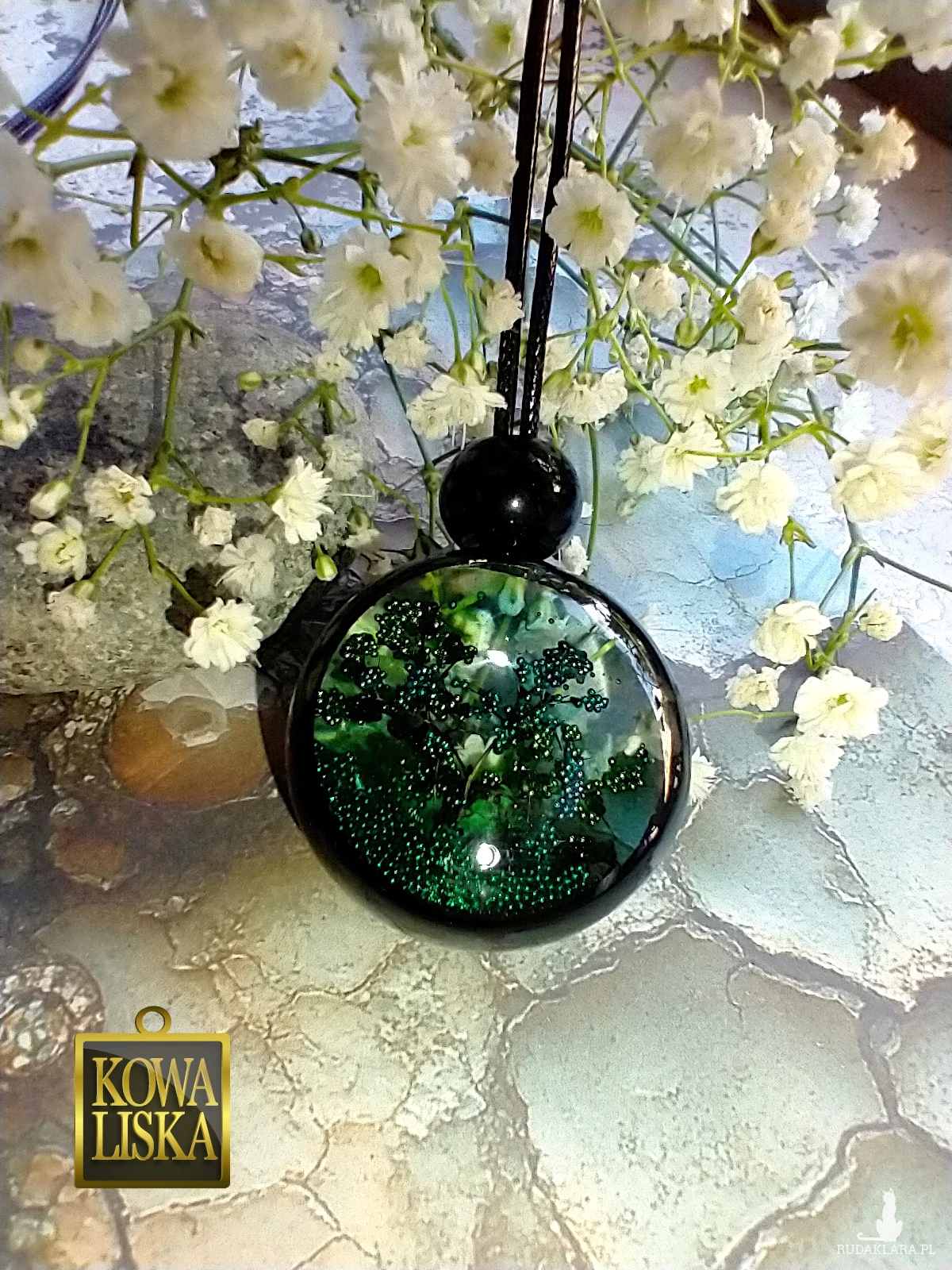 Długi, duży medalion z żywicy. Drzewko "kwitnące" turkusowo-zielonymi owocami w lekkiej poświacie, stanowi bardzo efektowne wnętrze czarnej ramki. Medalion został w całości oblany żywicą, co spotęgowało wrażenie trójwymiarowości.