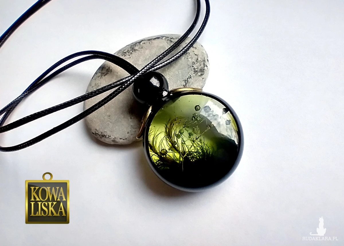 Długi, duży medalion z żywicy. Leśne, roślinne motywy umieszczone w oliwkowej poświacie, stanowią bardzo efektowne wnętrze czarnej ramki. Medalion został w całości oblany żywicą, co spotęgowało wrażenie trójwymiarowości. Listki w kolorze starego brązu pięknie oprawiają całość.