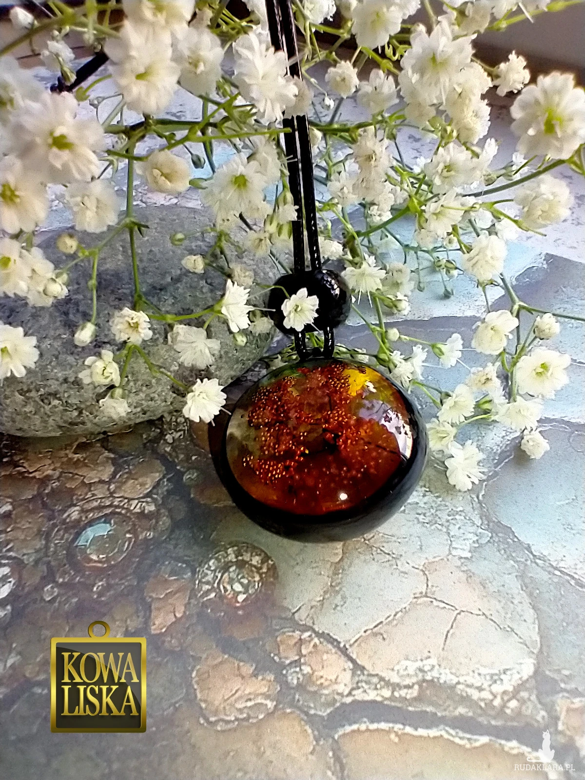 Długi, duży medalion z żywicy. Jesienne, złocisto-bursztynowe drzewka umieszczone w ognistej poświacie, stanowią bardzo efektowne wnętrze czarnej ramki. Medalion został w całości oblany żywicą, co spotęgowało wrażenie trójwymiarowości.