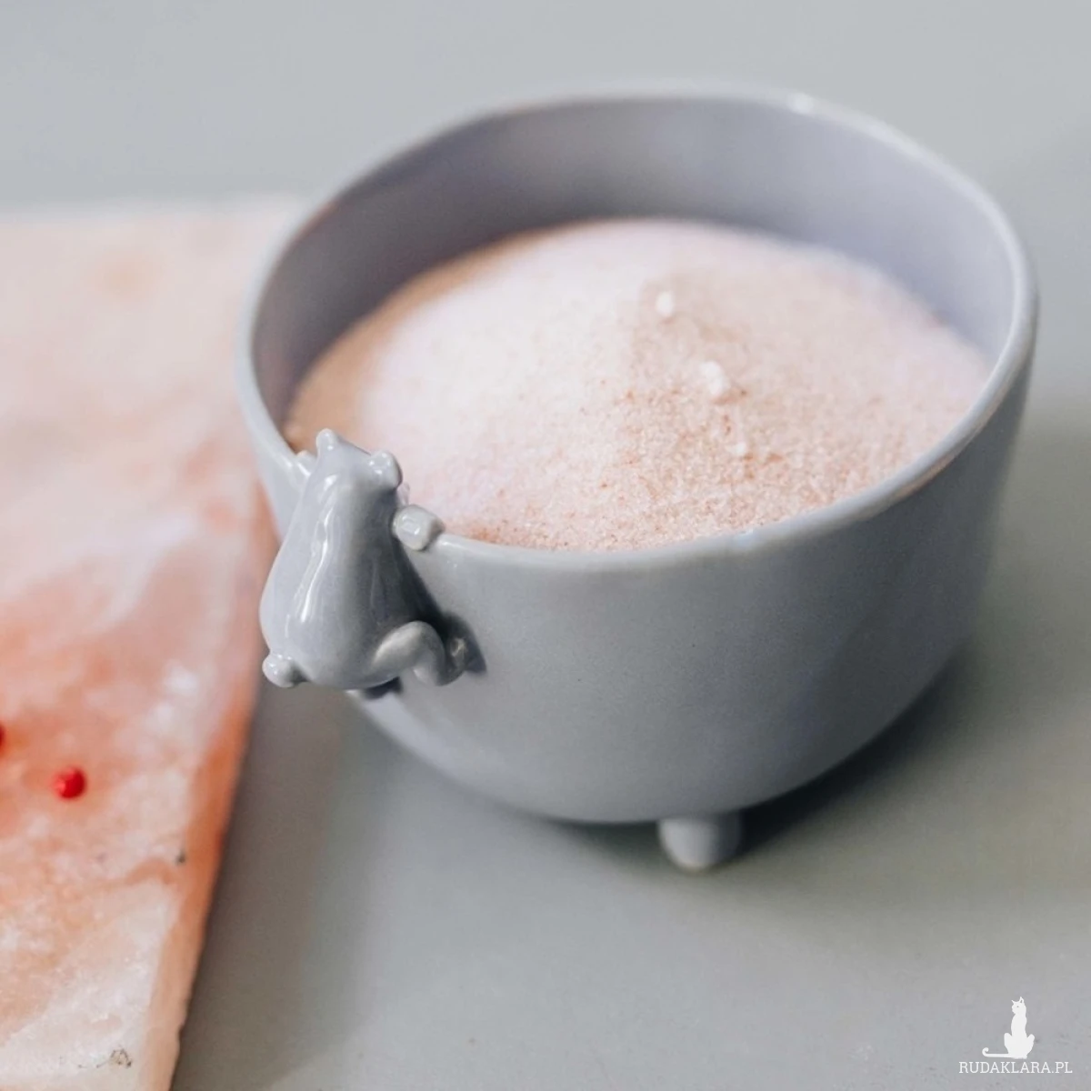 Ręcznie robiona, szara miseczka ceramiczna, po której wspina się uroczy miś. Miseczka śniadaniowa, w której możesz przechowywać owoce, słodycze. Może schować w niej swoje drobiazgi, czy wykorzystać ją jako ozdobę.