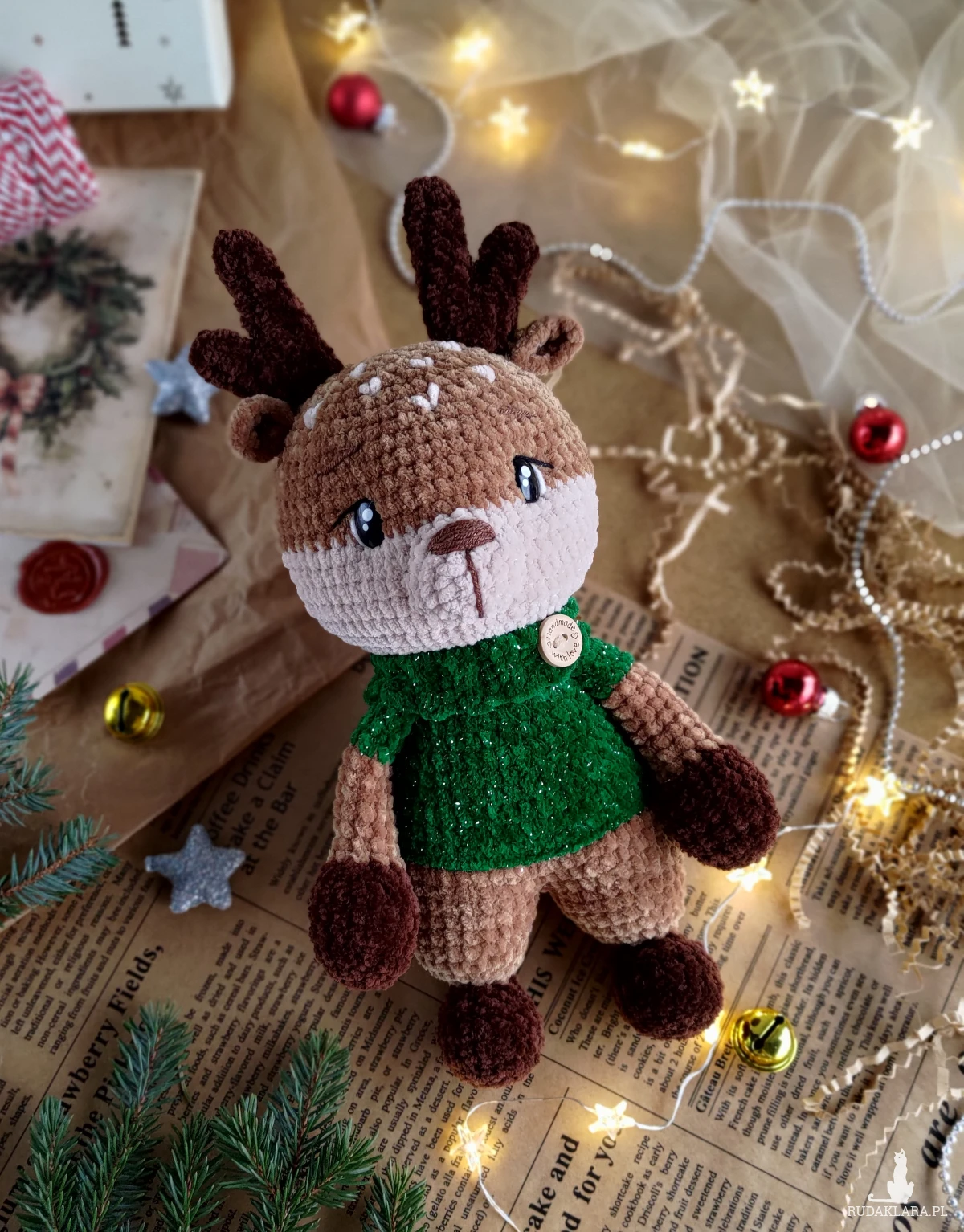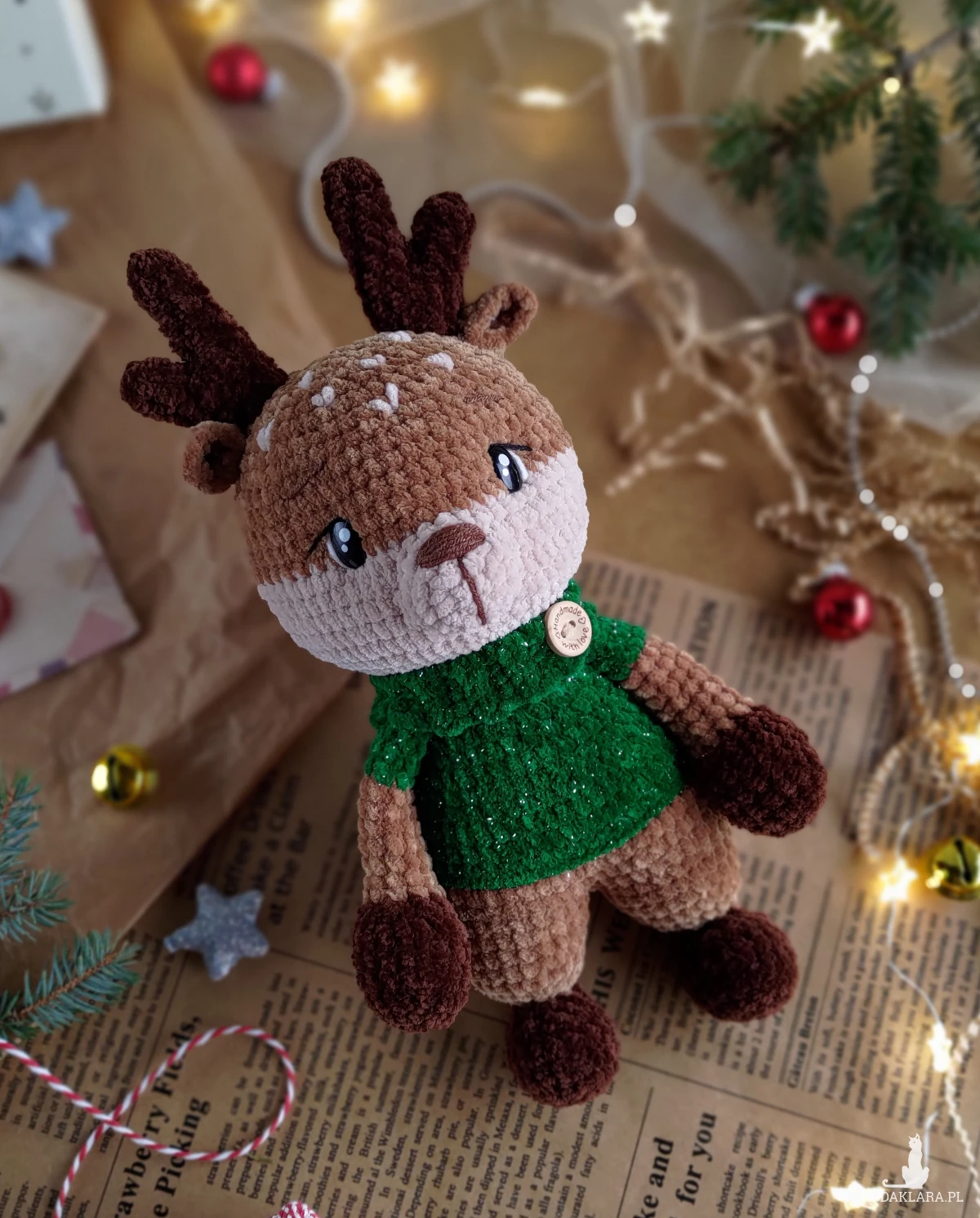 • Renifer jest ubrany w sweterek (nie jest zdejmowany) w kolorze szmaragdowym z błyszczącą nicią.