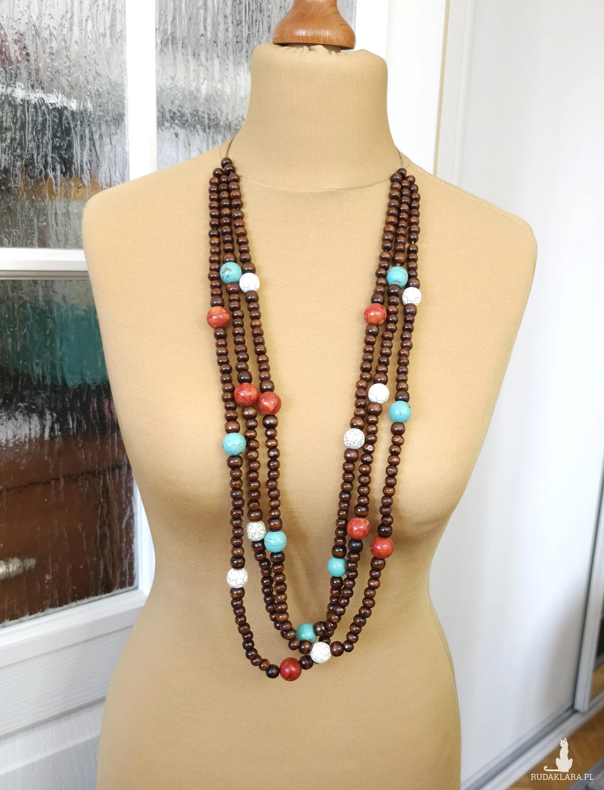 Ten wyjątkowy, długi naszyjnik, wykonany z ciepłego drewna,
