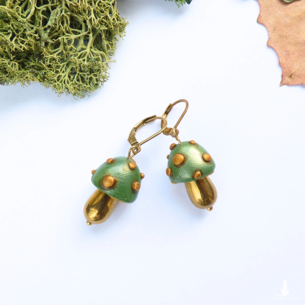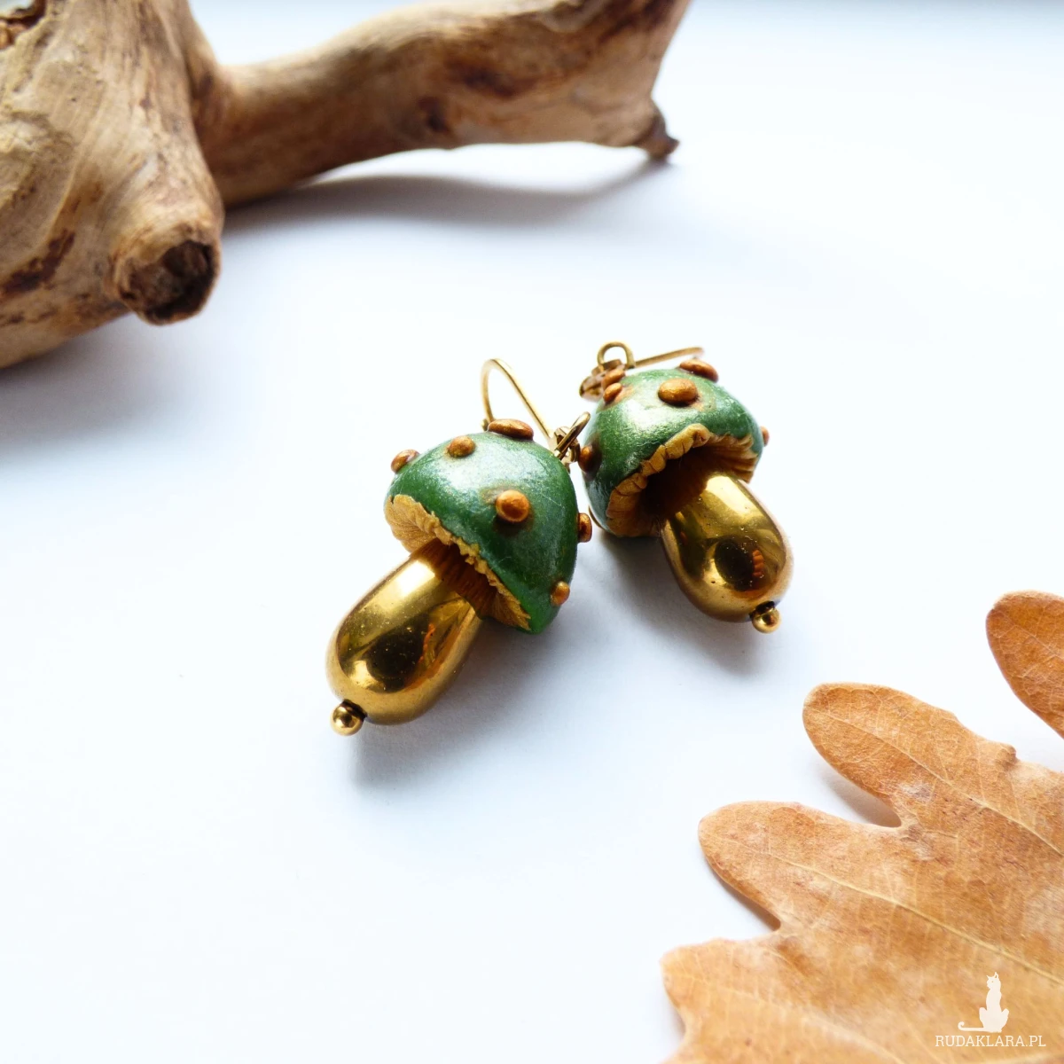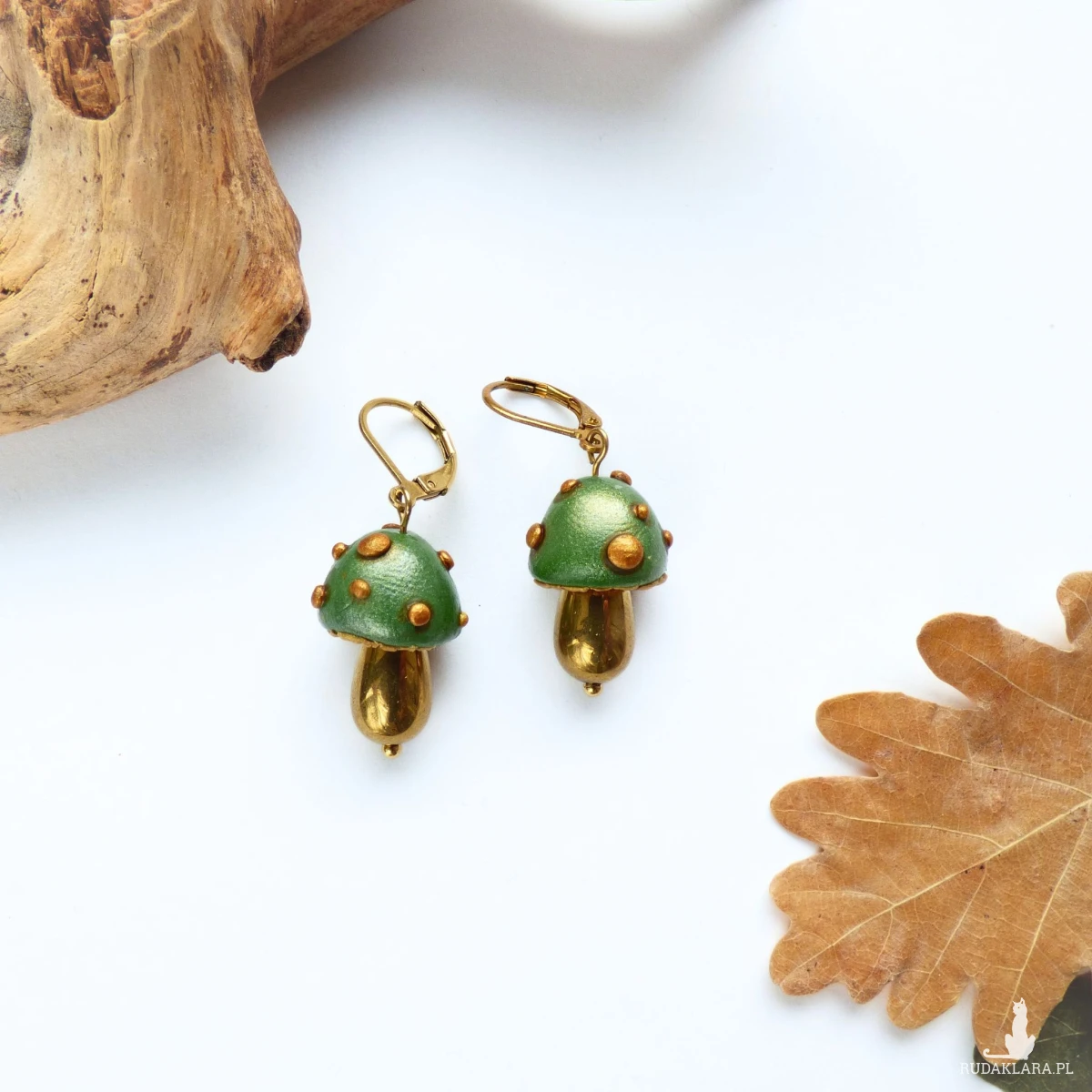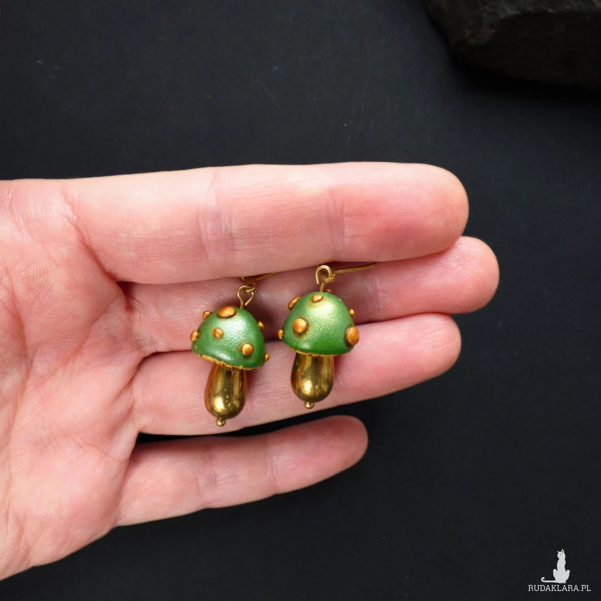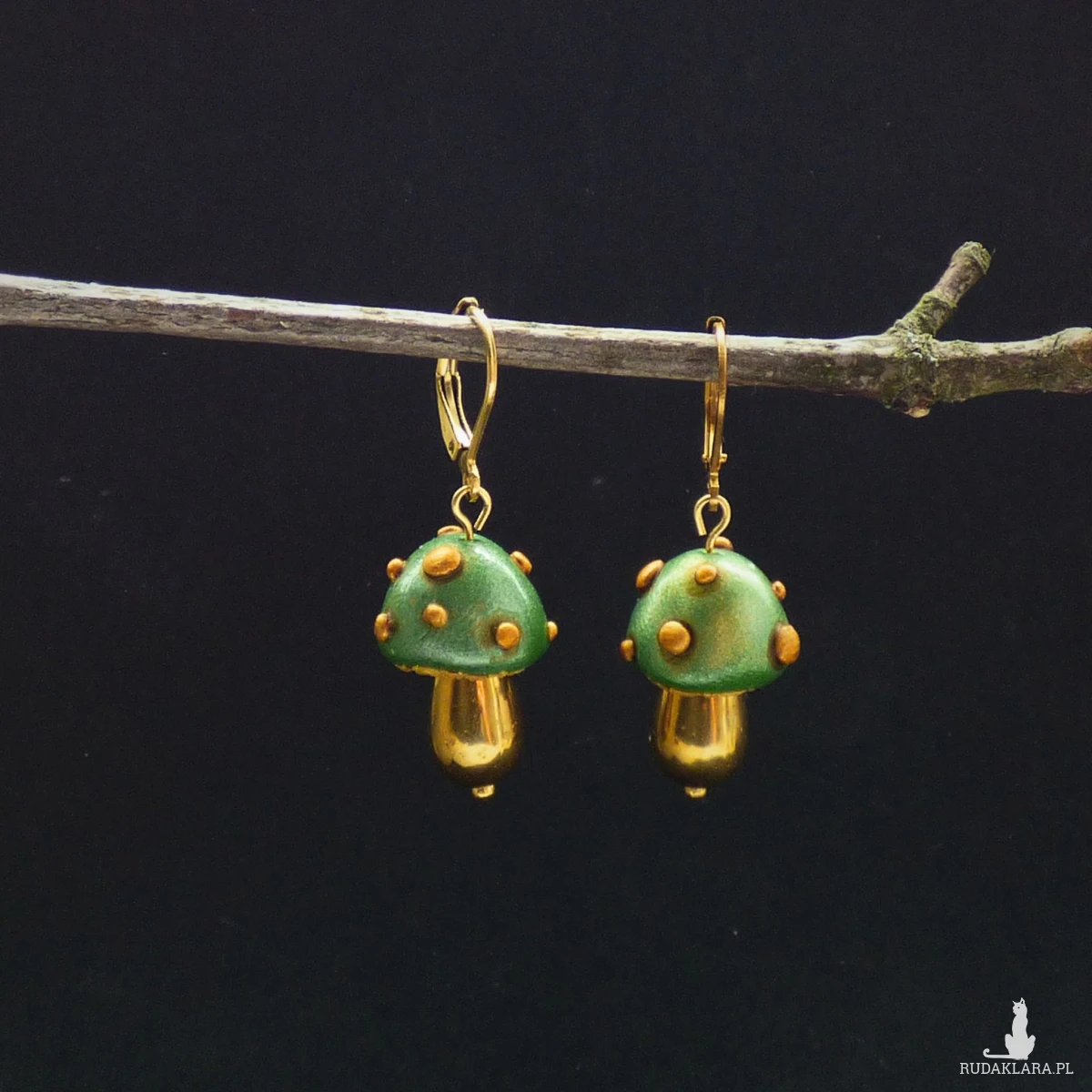 Ręcznie rzeźbione i modelowane kolczyki z glinki polimerowej w kształcie małych grzybków. Kapelusze w kolorze leśnej zieleni zdobią wypukłe złote kropeczki, a „nóżka” to szklana kropla w kolorze złotym, która ładnie odbija światło. Lekkie, wygodne i bardzo efektowne – idealne na prezent dla miłośniczek lasu i starych baśni, a także wyjątkowej biżuterii.