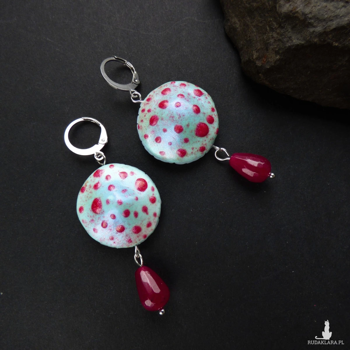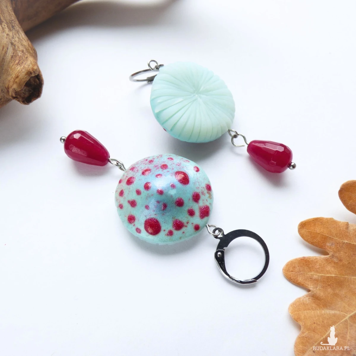 Ręcznie rzeźbione i modelowane kolczyki z glinki polimerowej w formie wypukłych „kapeluszy” grzybków. Miętowa baza z niebieskim perłowym połyskiem ozdobiona jest czerwonymi delikatnie mieniącymi się kropeczkami. Od spodu wyrzeźbiłam delikatne „blaszki” w kolorze transparentnym miętowym. Całość dopełnia fasetowana kropla z malinowego jadeitu, która dodaje lekkości i pięknie pracuje w ruchu. Lekkie, przyciągające wzrok i delikatnie mieniące się kolczyki.