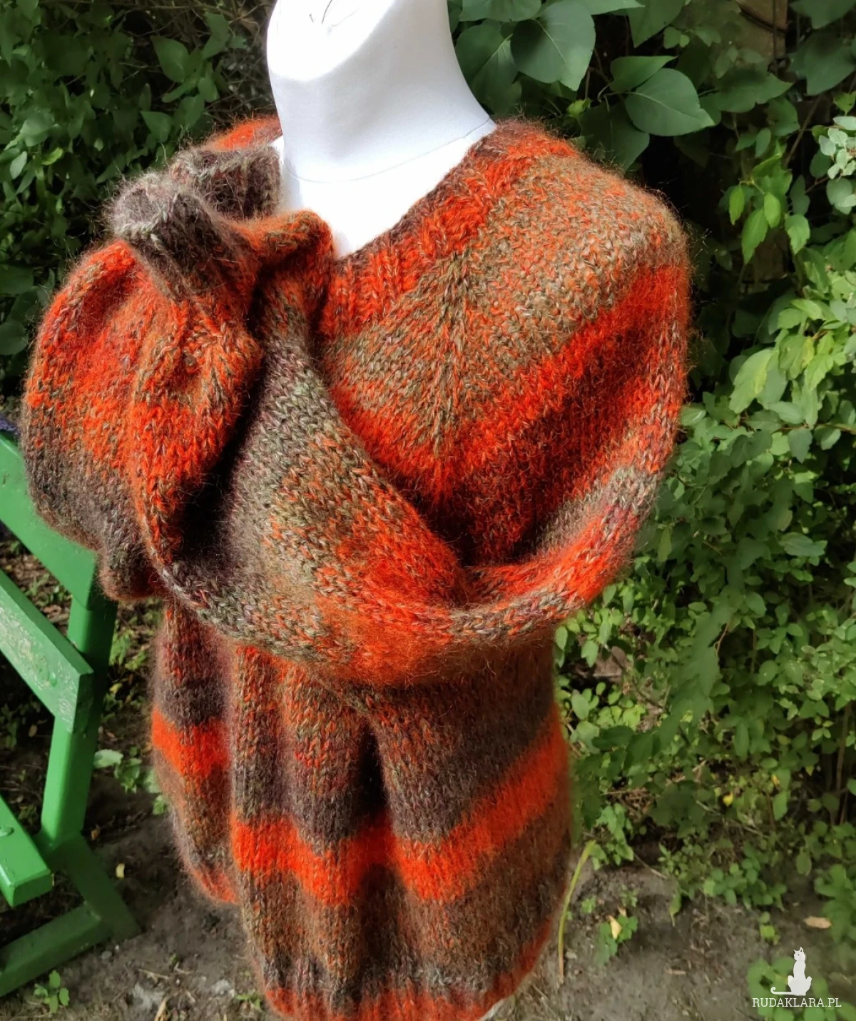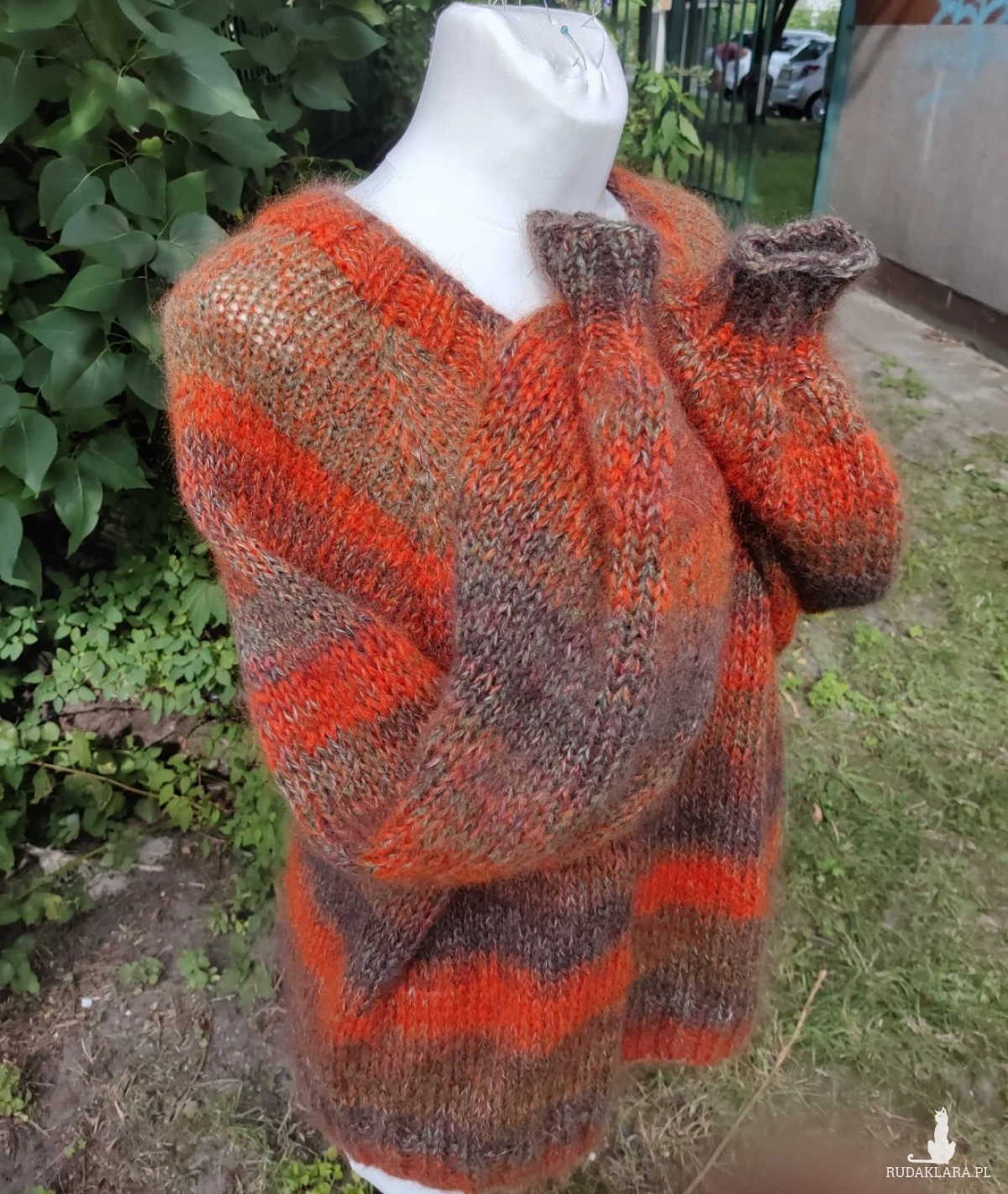 kolory oliwki i pomarańczy intuicyjnie zmieniane nitki wełny w tym swetrze dają niebywały efekt który trudno oddać poprzez fotografie
