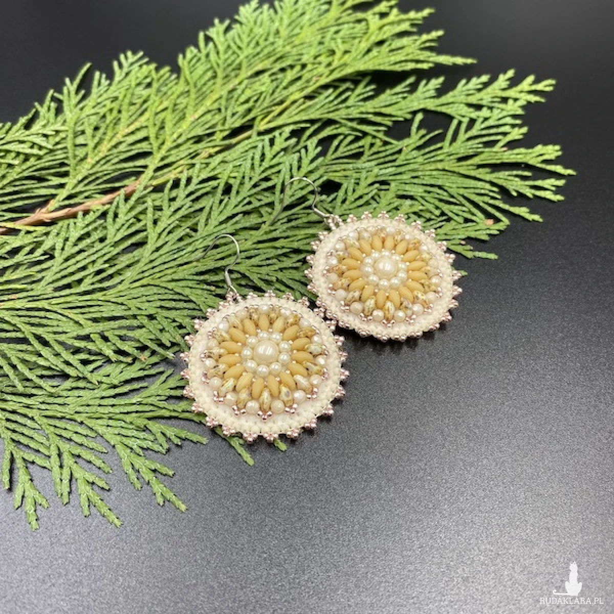 Okrągłe kolczyki wykonane zostały techniką haftu koralikowego z drobnych koralików Toho, Fire Polish i SuperDuo w 100% wyszyte ręcznie. Spód kolczyków podszyty jest jasno beżową eko skórką. Bigle otwarte ze stali chirurgicznej.