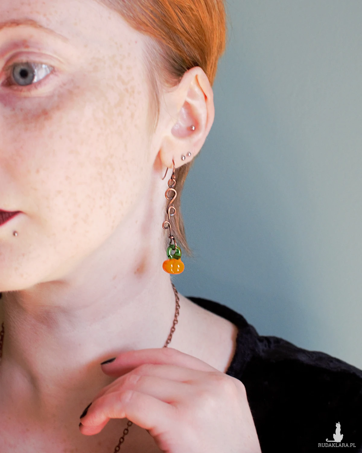 Naturalna miedź została uformowana na kształt dyniowych zawijasów, a na końcu cieszy oko soczysto pomarańczowa zawieszka w kształcie dyni.