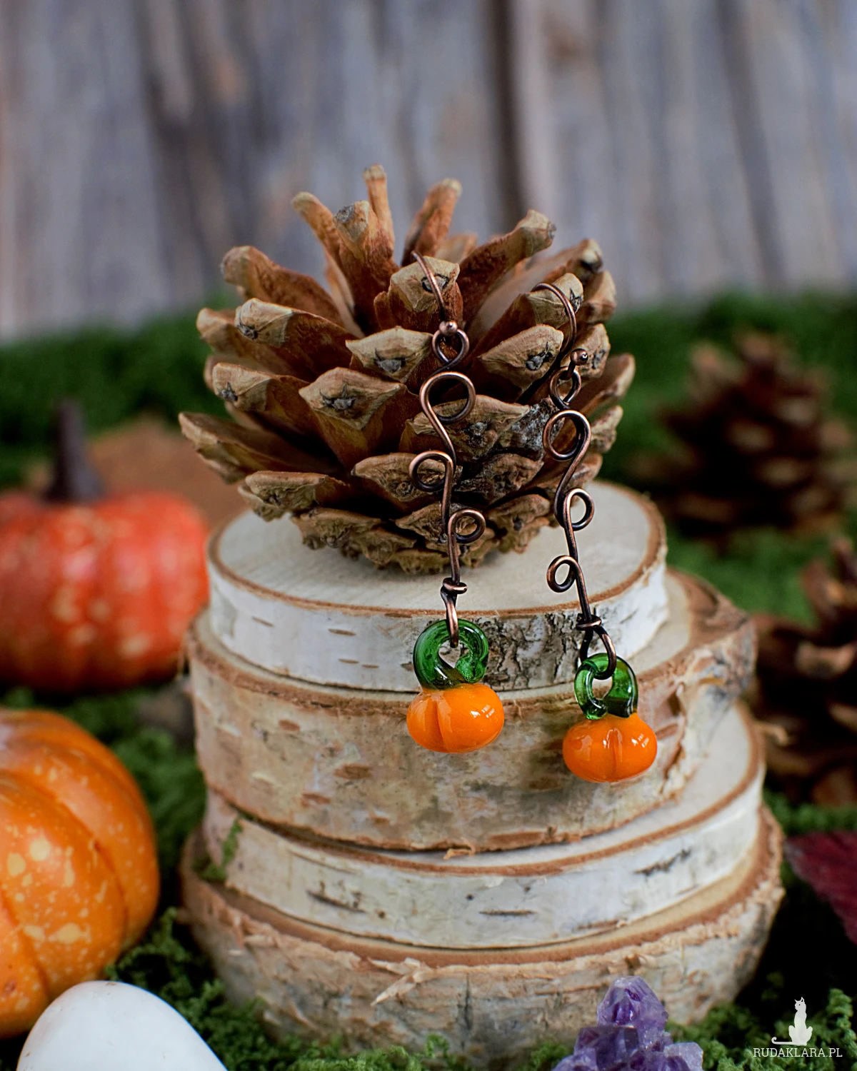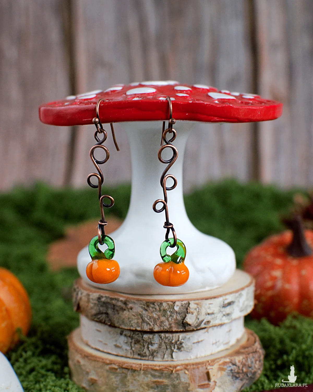 Przepiękne kolczyki ręcznie wykonane z użyciem naturalnej miedzi i szklanych zawieszek w kształcie dyni.