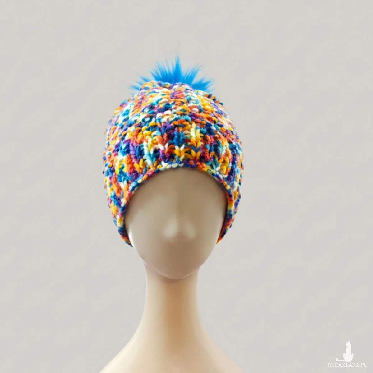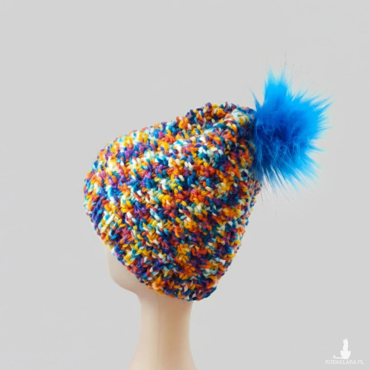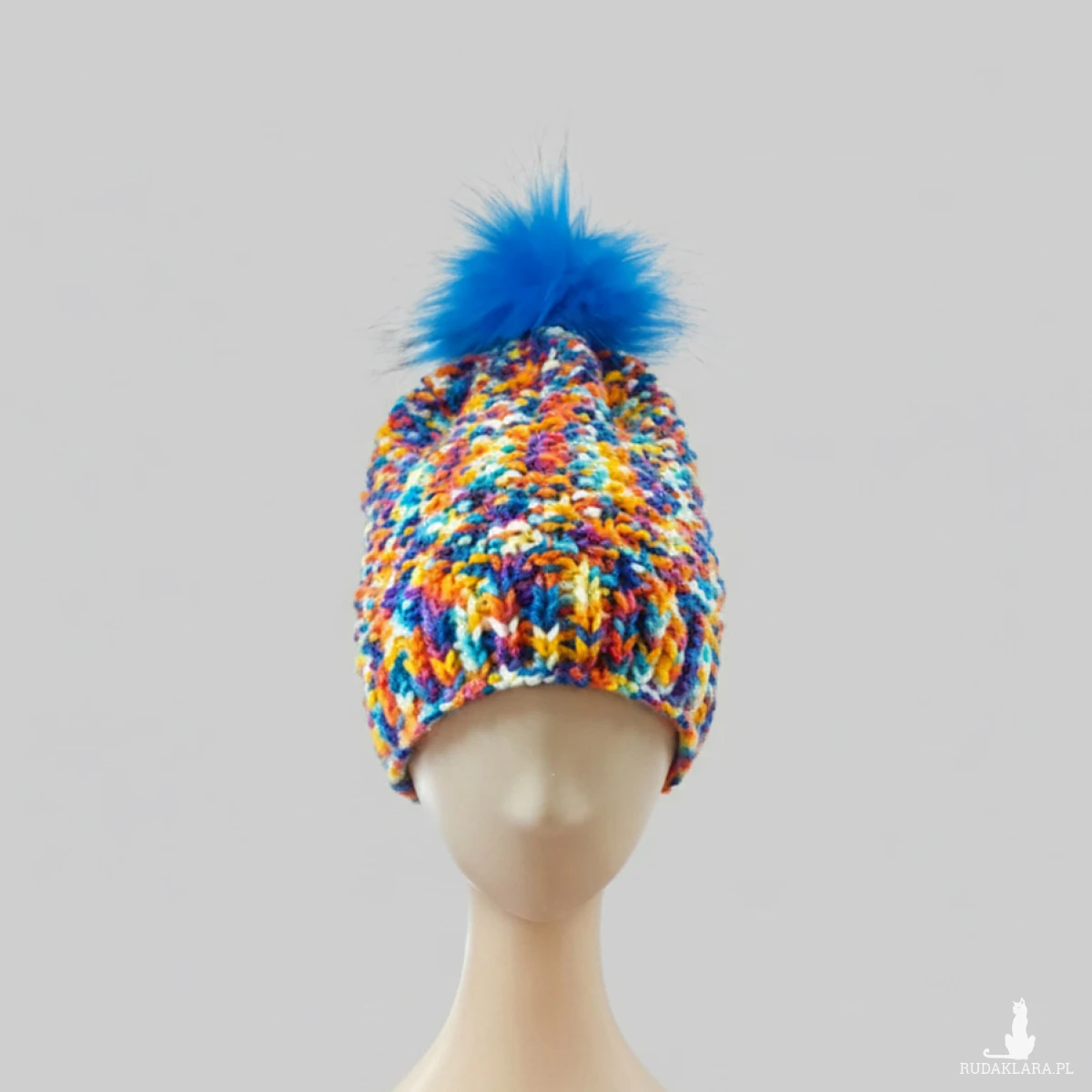 6899 Wesoła Czapka Zimowa Multikolor z Futerkiem - Ciepła i Modna, ręcznie robiona czapka z pomponem