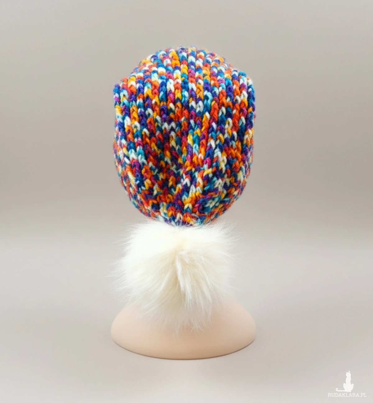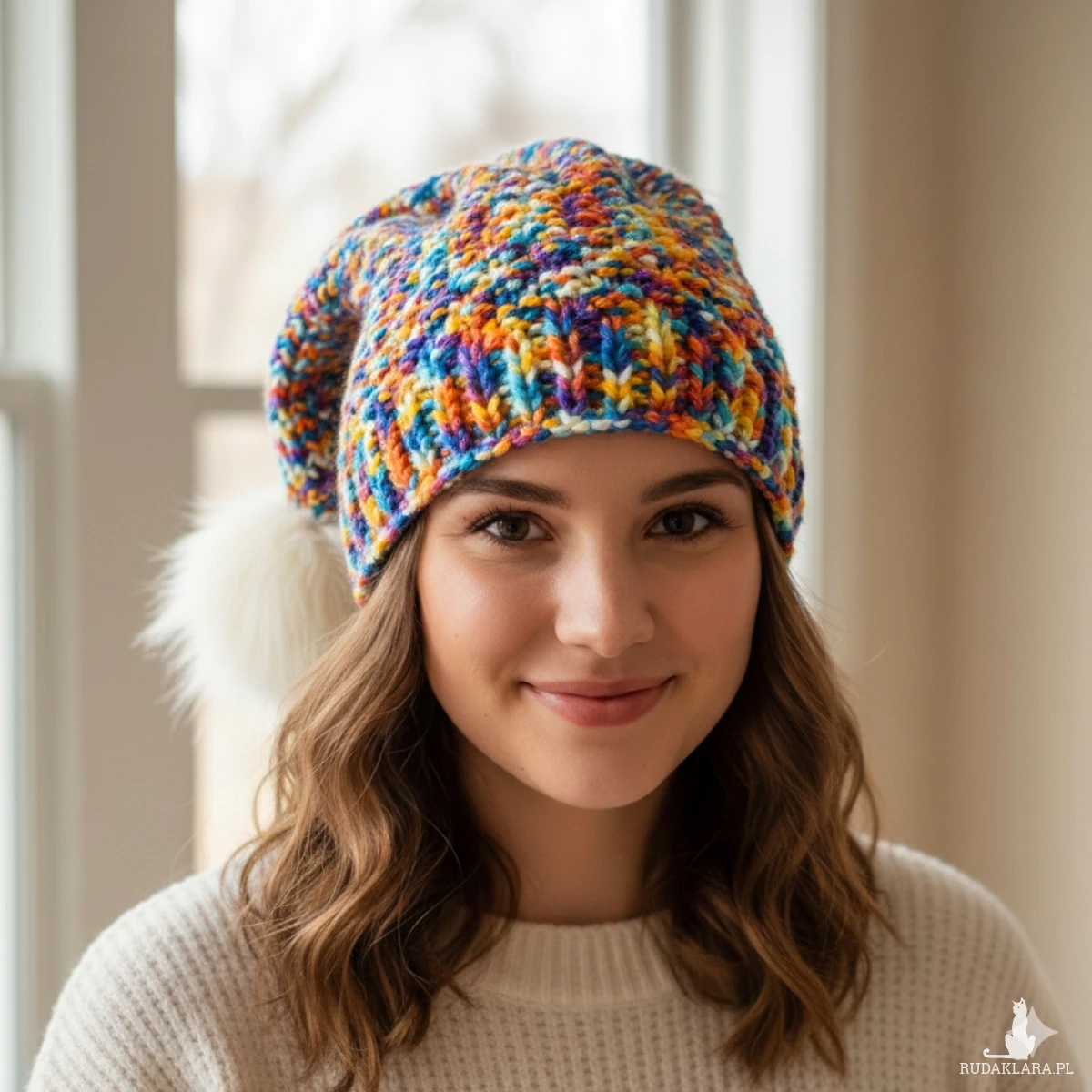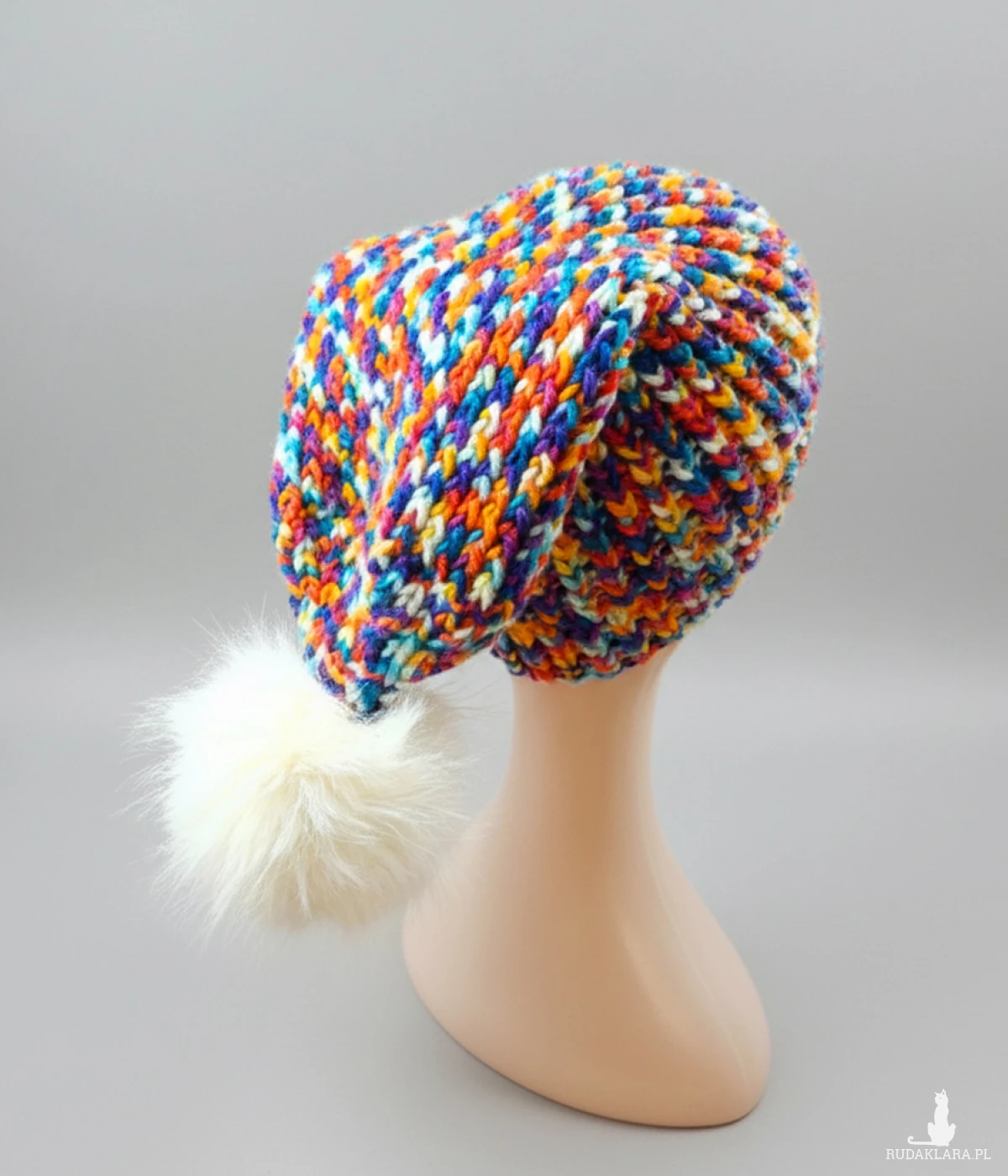 6900 Wesoła Czapka Zimowa Multikolor z Futerkiem - Ciepła i Modna, ręcznie robiona czapka z pomponem; czapka krasnal, długa czapka