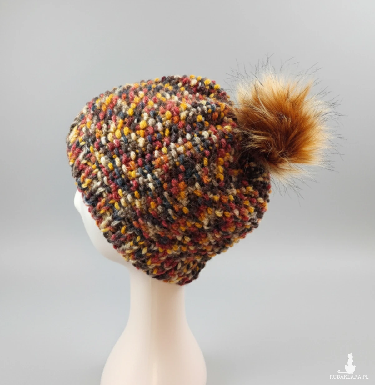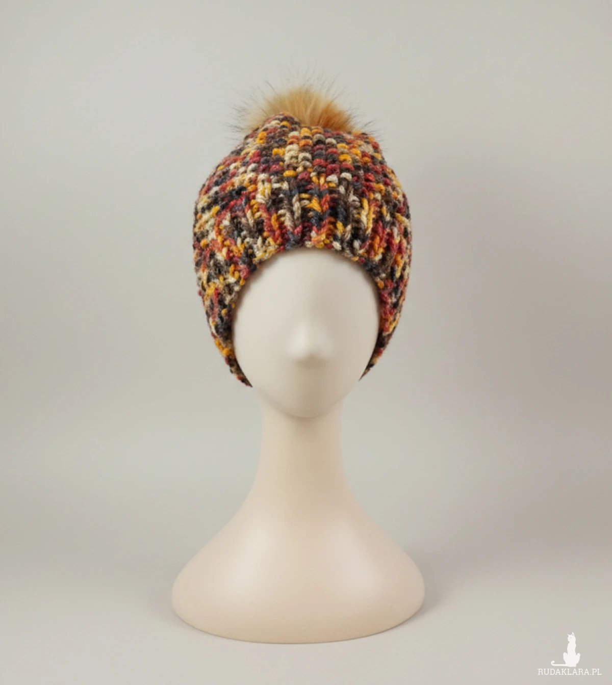 6901 Ciepła Czapka Multikolor Melanżowa z Pomponem - Styl Beanie, ręcznie robiona, brązowa czapka z pomponem