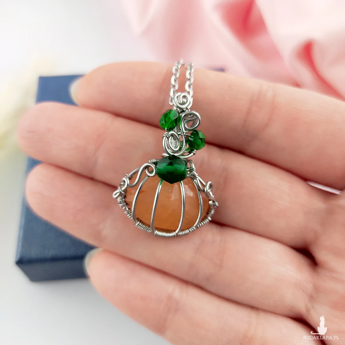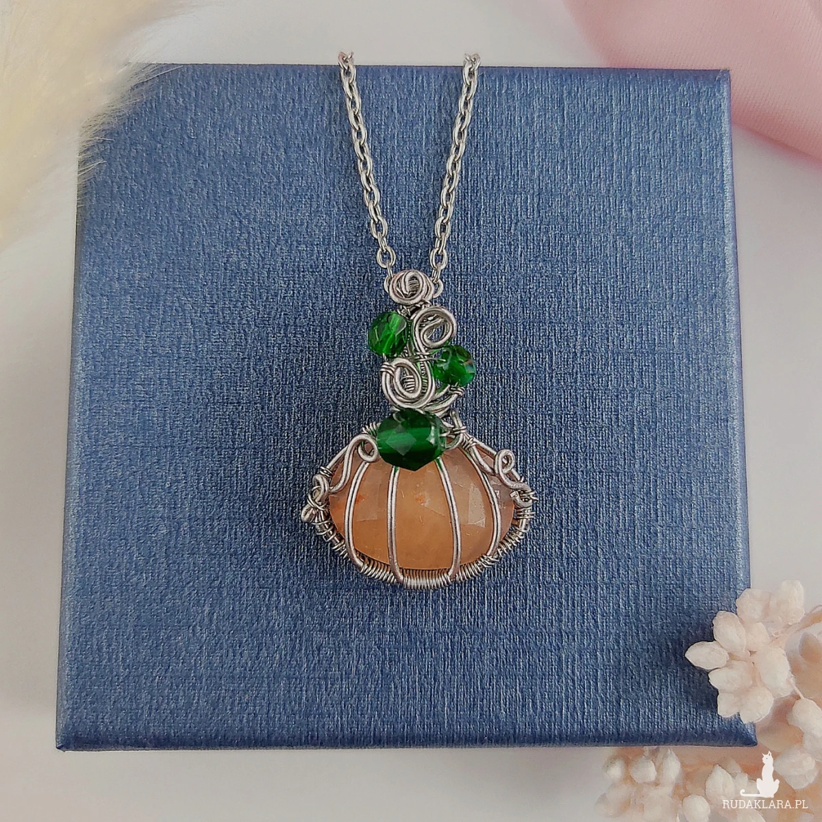 Naszyjnik Dynia Jadeit ręcznie robiony. Wykonany techniką wire wrapping z drutów ze stali chirurgicznej.