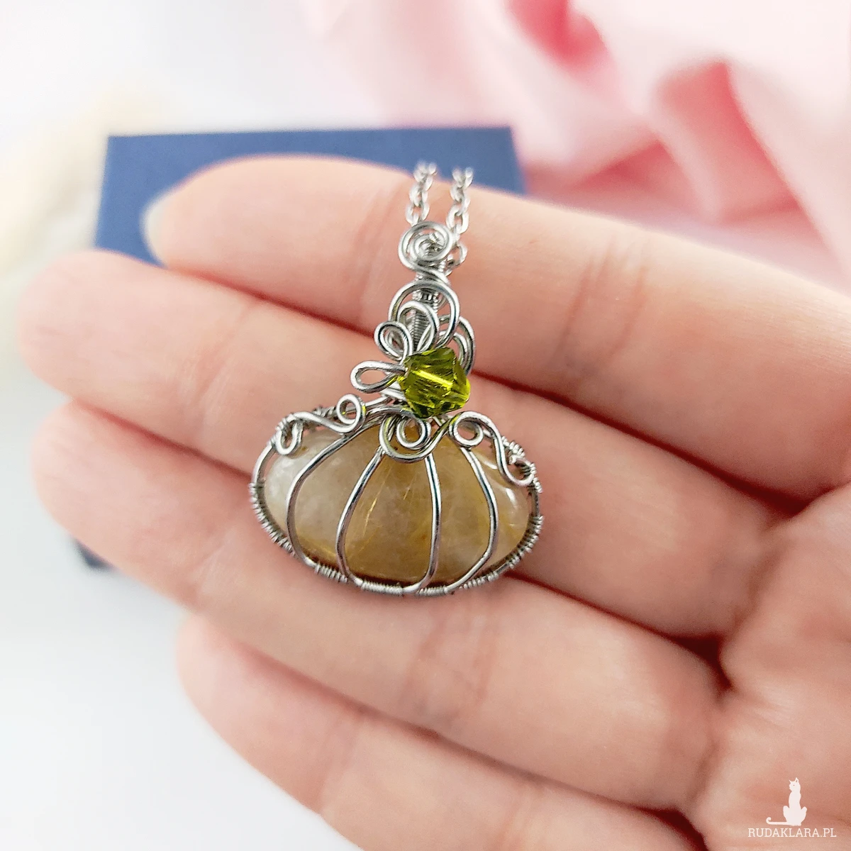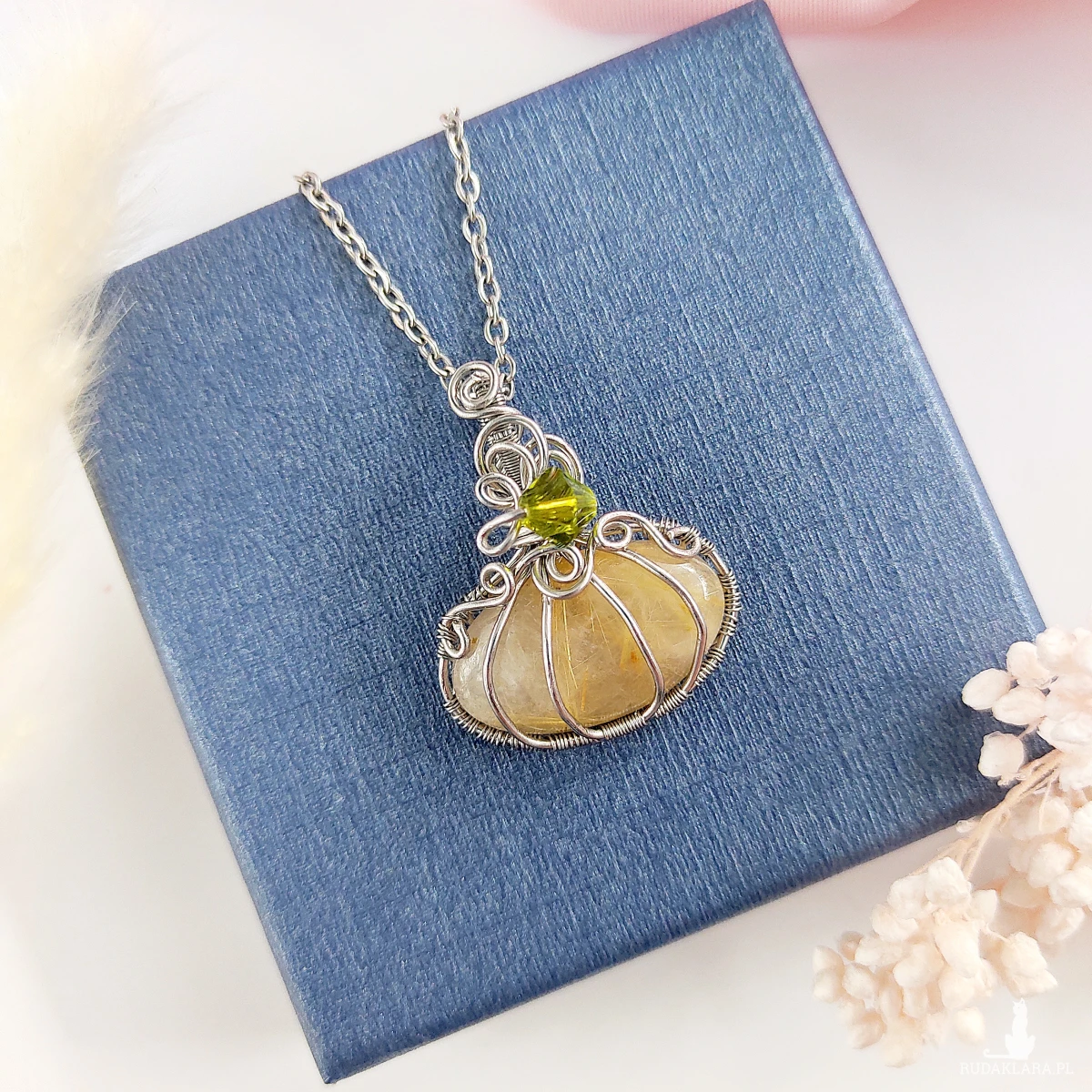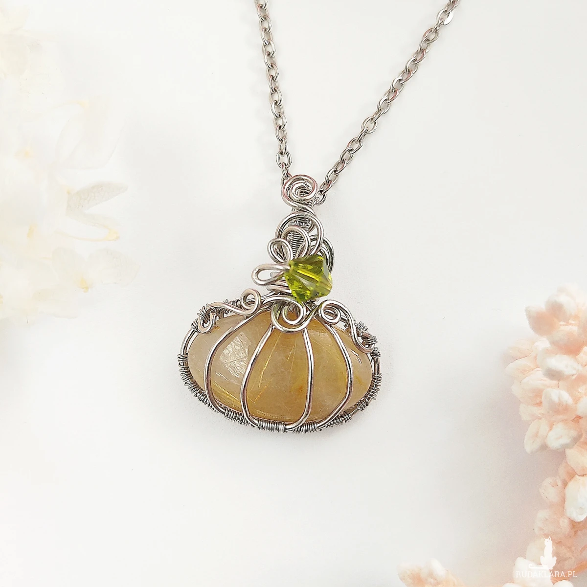 Naszyjnik Dynia Kwarc Rutylowy ręcznie robiony. Wykonany techniką wire wrapping z drutów ze stali chirurgicznej.