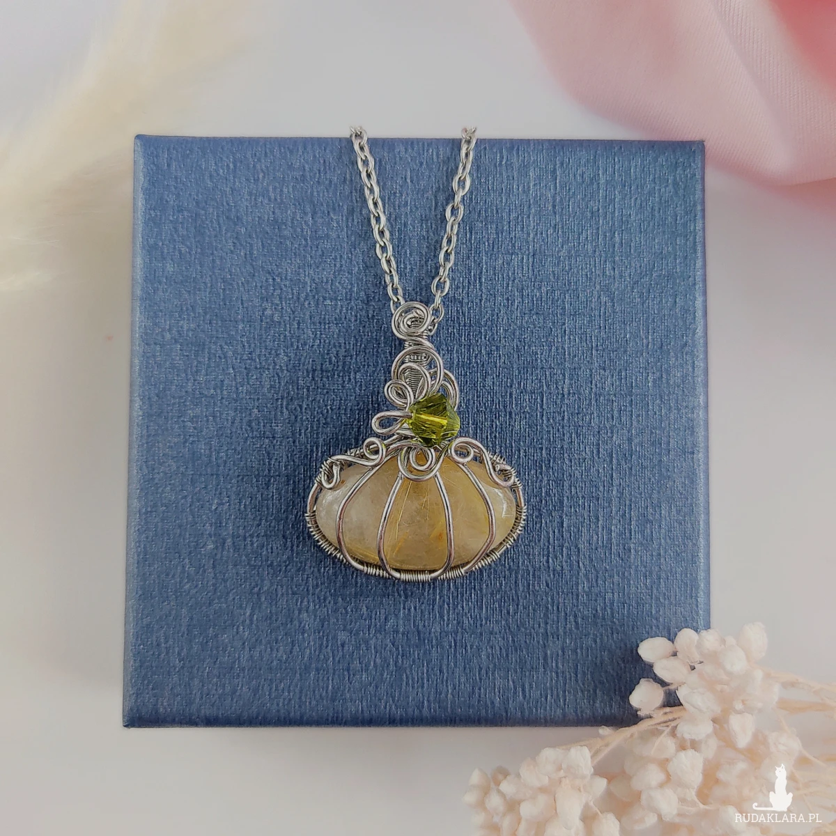 Naszyjnik Dynia Kwarc Rutylowy zapakowany jest w ozdobne pudełko lub woreczek na biżuterię.