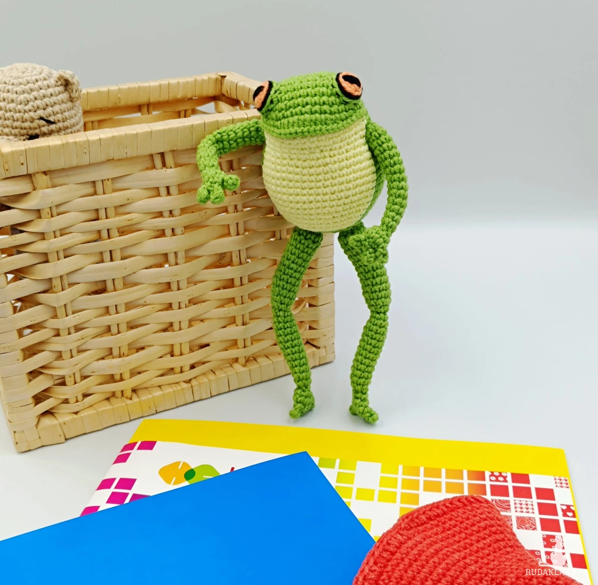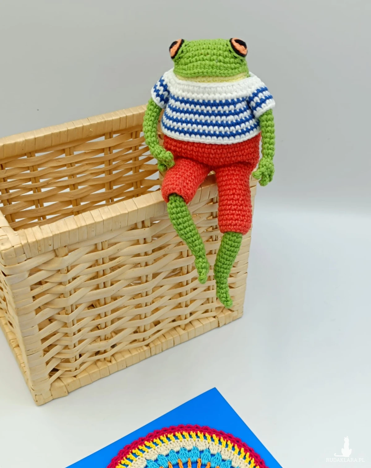 Żabka wykonana jest ręcznie szydełkiem. Bardzo równiutko, z dużą starannością, niezwykle precyzyjnie i z ogromną dbałością o każdy szczegół. Oczka są wyszyte ręcznie.
