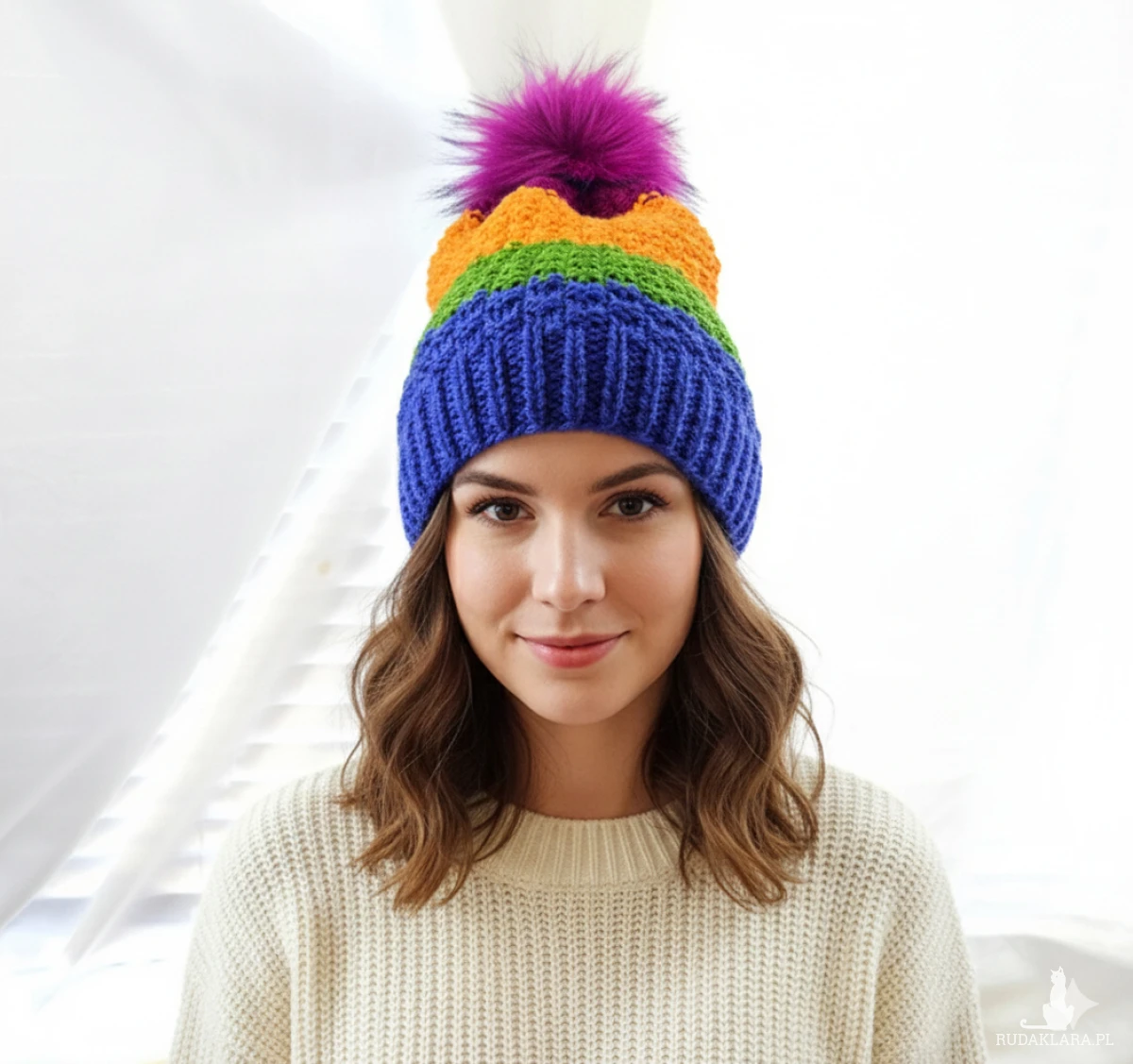 6904 Energetyczna Czapka Beanie w Żywe Pasy z Fuksjowym Pomponem - ciepła, kolorowa efektowna, ręcznie robiona czapka