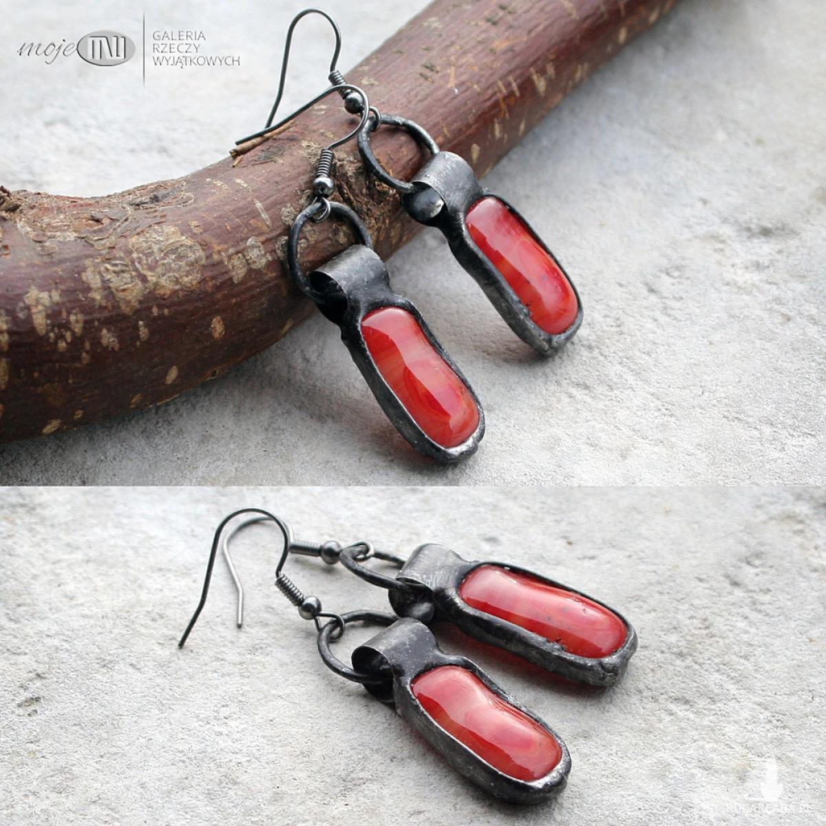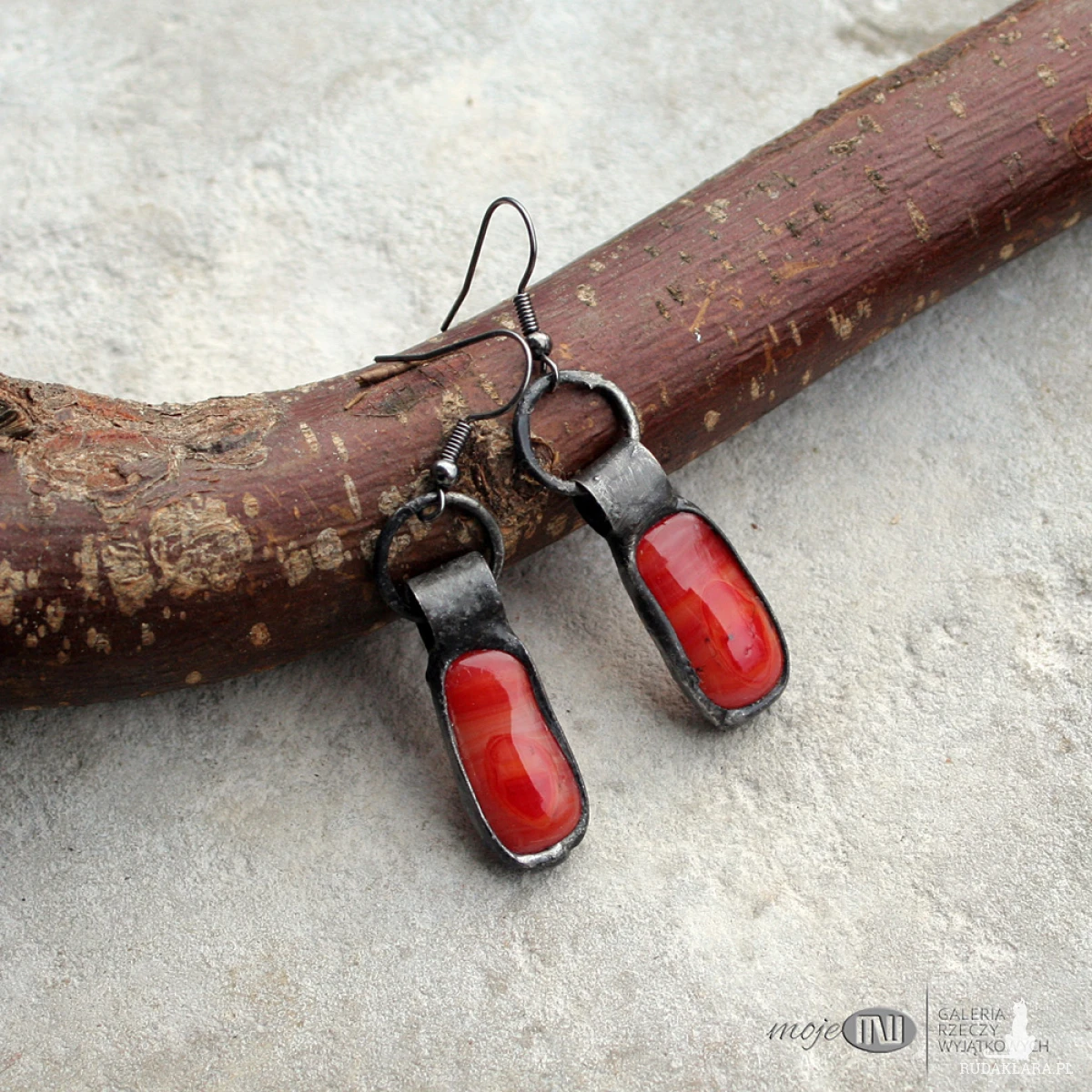 Kolczyki ze szklanego cynobrowo-czerwonego paluszka, wytopionego przeze mnie metodą fusingu w temperaturze min. 800 stopni. Całość oprawiona w miedź - cynowaną, patynowaną i przecieraną.