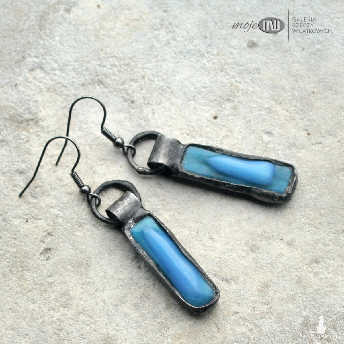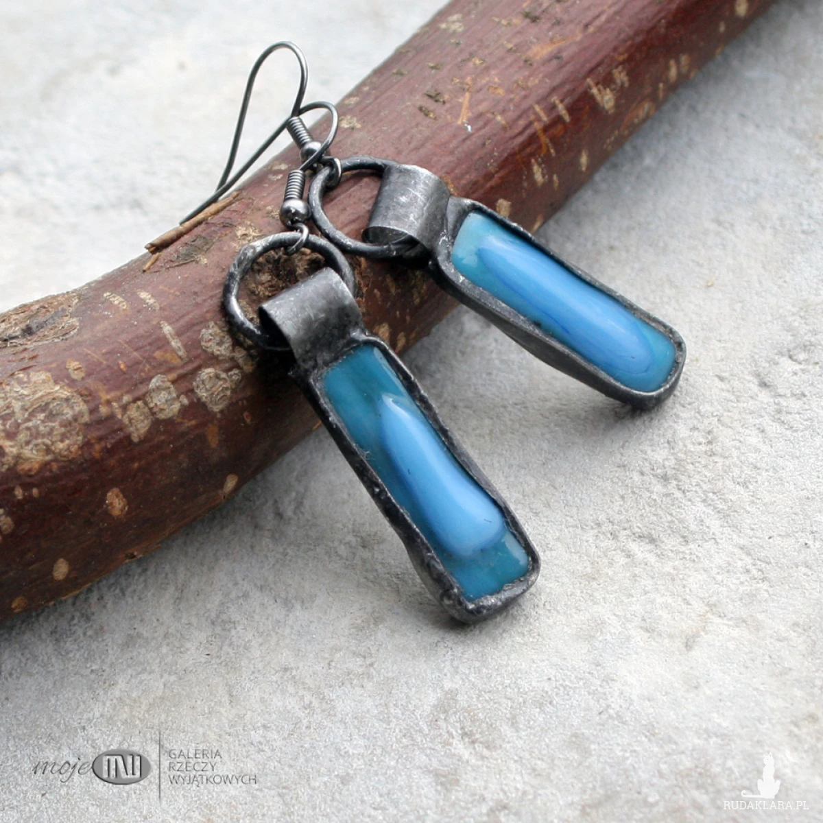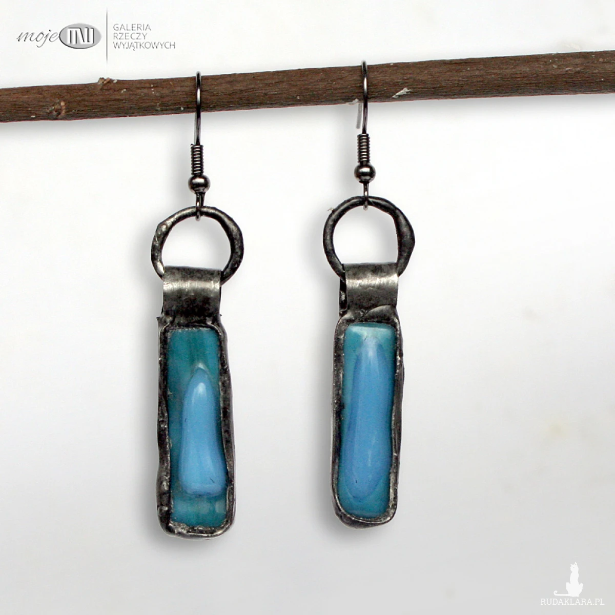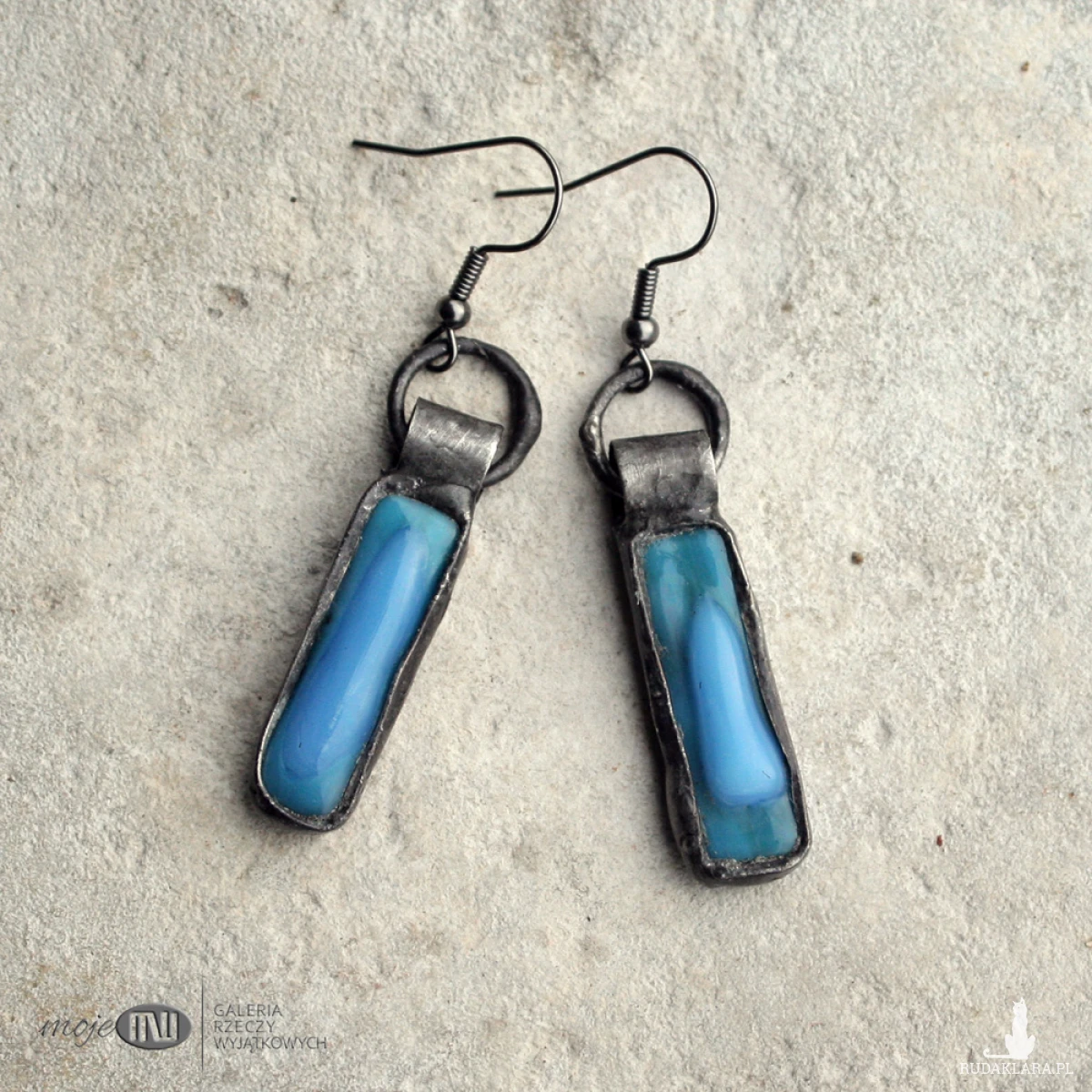 Kolczyki ze szklanego morsko-niebieskiego paluszka, wytopionego przeze mnie metodą fusingu w temperaturze min. 800 stopni. Całość oprawiona w miedź - cynowaną, patynowaną i przecieraną.