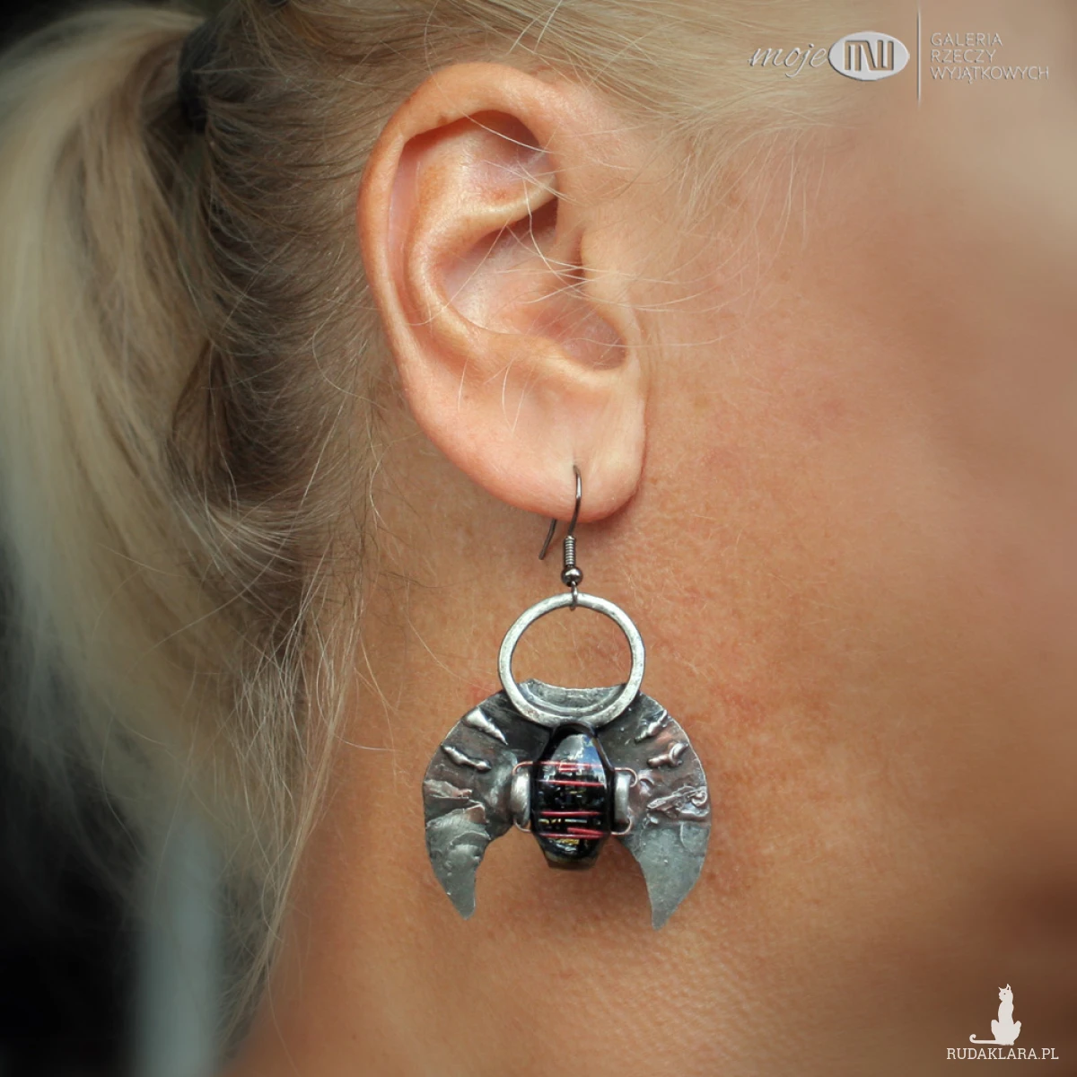 Księżycowe kolczyki z miedzi pokrytej cyną, patynowanej i przecieranej. Zdobią je kaboszony, które wytopiłam ze szkła dichroicznego, które delikatnie połyskuje wewnątrz. Zawieszone na metalowych biglach w kolorze grafitowym.