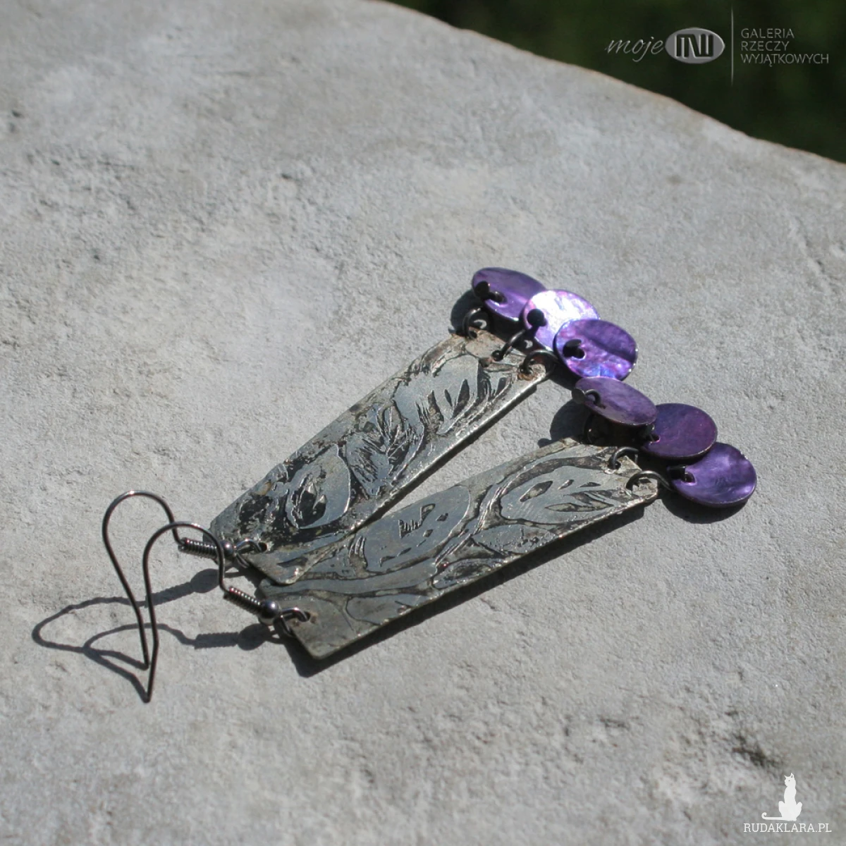 Długie kolczyki z prostokątnej blaszki z alpaki z wytrawionymi florystycznymi wzorami. Zdobią je plasterki fioletowej masy perłowej. Blaszka jest patynowana i częściowo polerowana dla wydobycia rysunku. Zawieszone są na metalowych biglach w kolorze grafitowym.