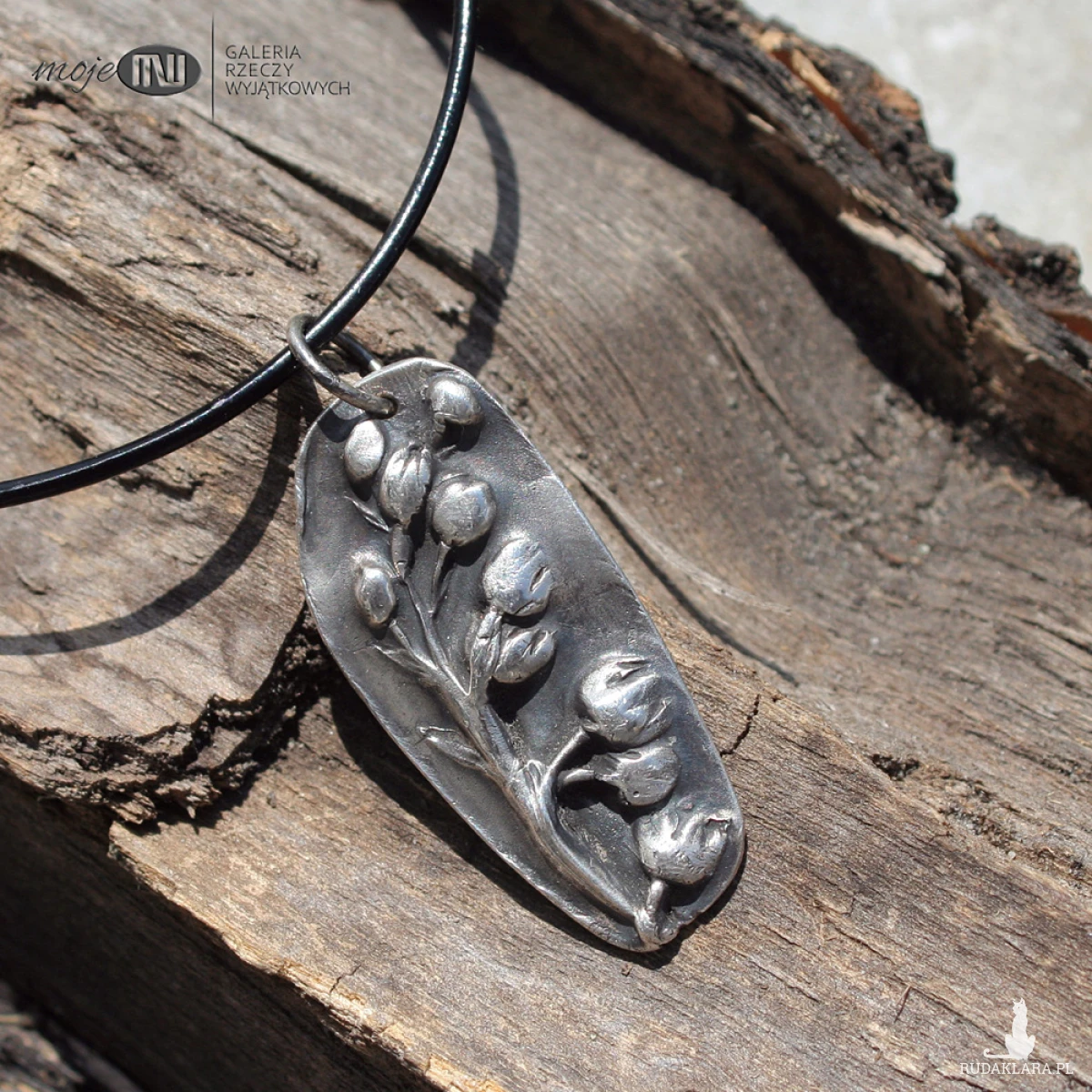 Wisior ze srebra wysokiej próby (nawet 999) z wizerunkiem wiosennych kwiatów konwalii. Srebro jest oksydowane i przetarte dla wydobycia rysunku, częściowo polerowane.