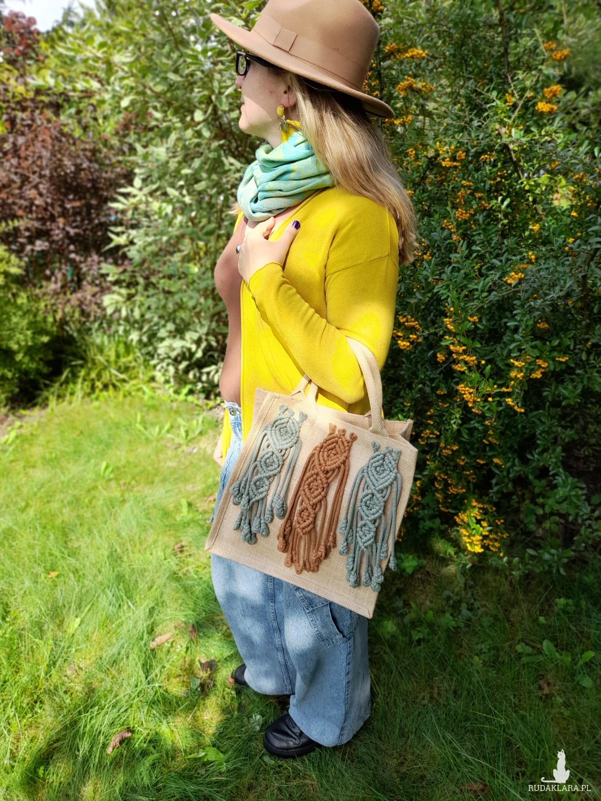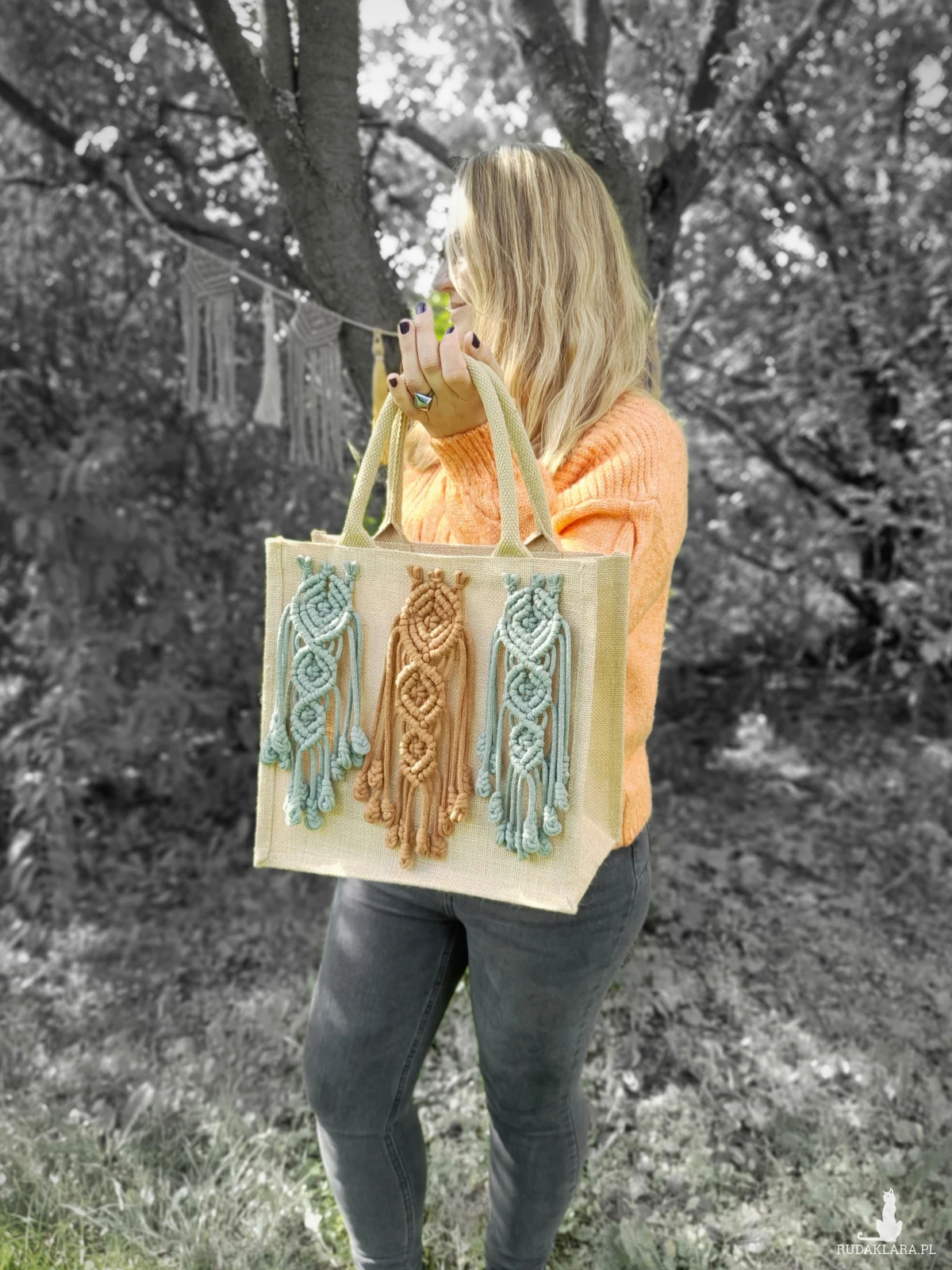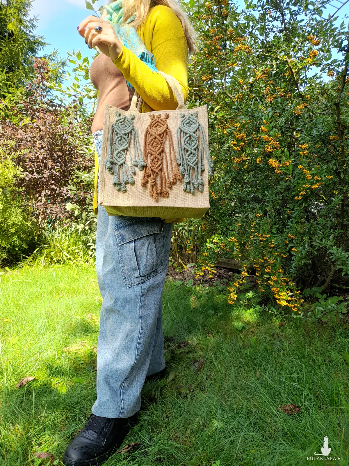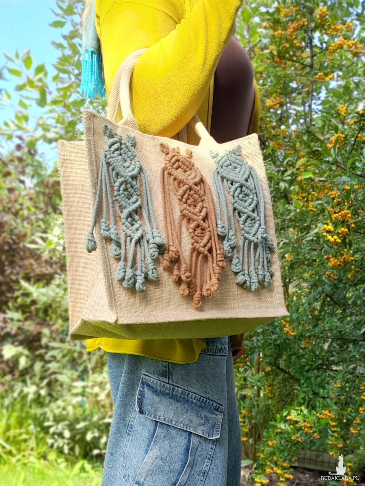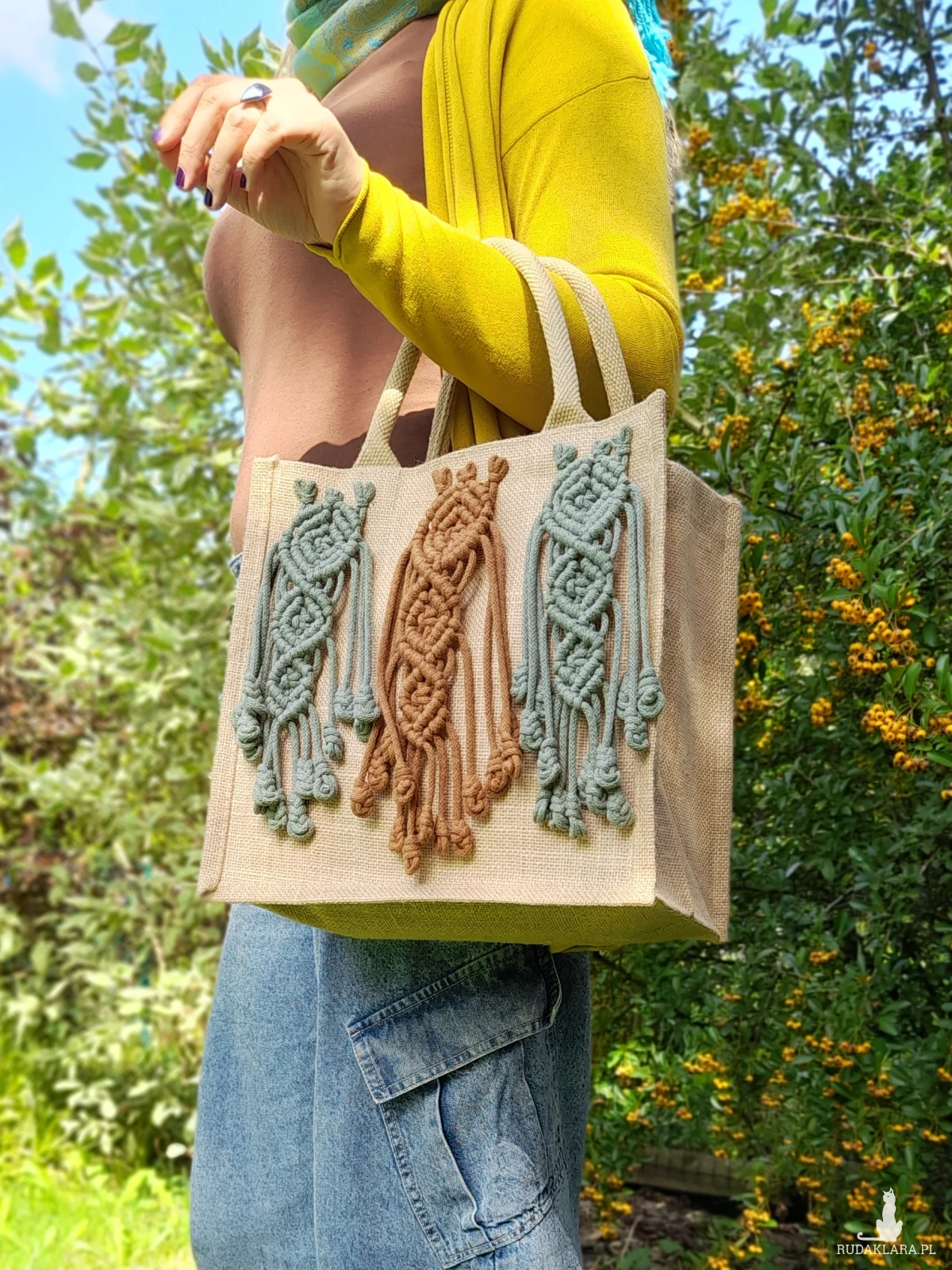 Ta wyjątkowa i trwała torba została wykonana z mocnej juty i ozdobiona ręcznie plecionymi elementami makramy w odcieniach cynamonu i szałwii. Każdy detal powstał z recyklingowych sznurków bawełnianych produkowanych w Polsce, z miękkim wypełnieniem z poliestru, które nadaje makramie objętości i wytrzymałości. 🌿