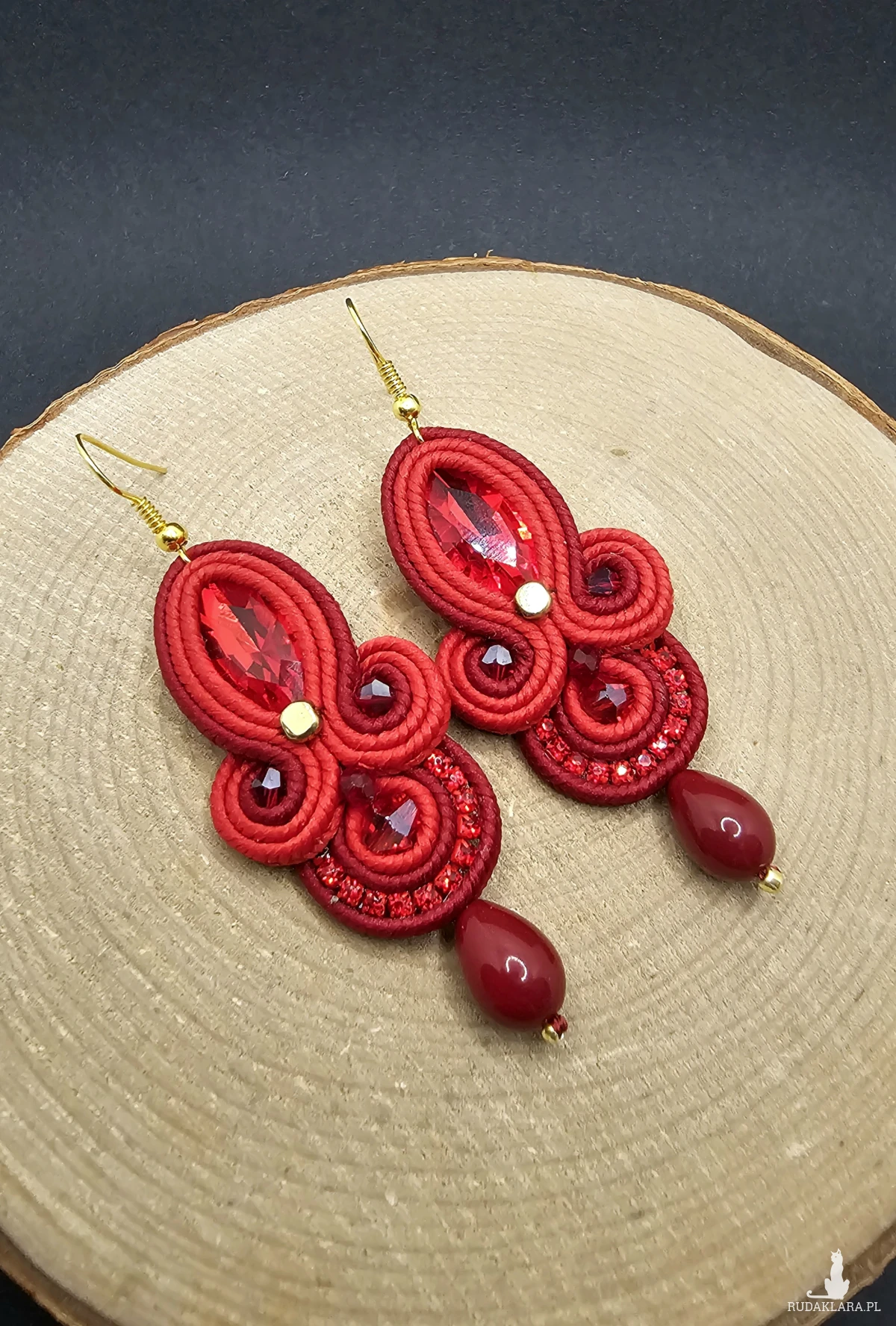 Czerwone fasetowane kryształki otoczone polskimi sznurkami sutasz, szklanymi koralikami w odcieniach bordo i czerwieni o różnych wielkościach. Dopełnieniem kolczyków jest pięknie błyszcząca taśma cyrkoniowa. Dół kolczyków zakończony szklanymi kroplami. Kolczyki zawieszone na klasycznych biglach w kolorze złota.