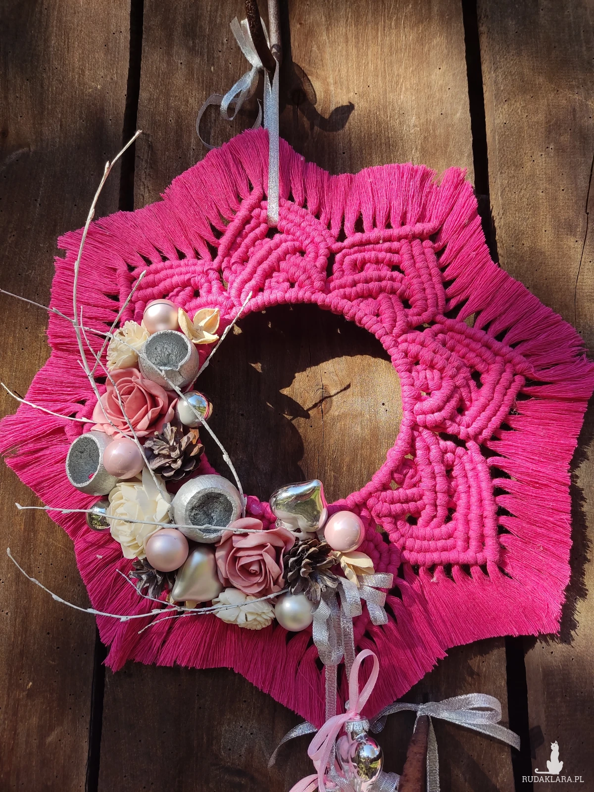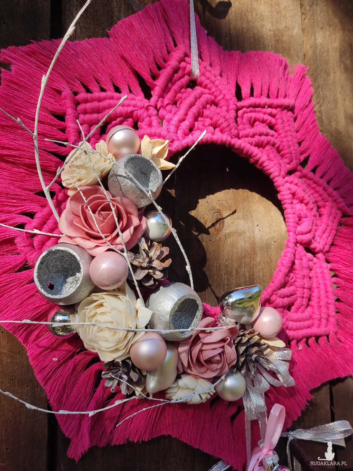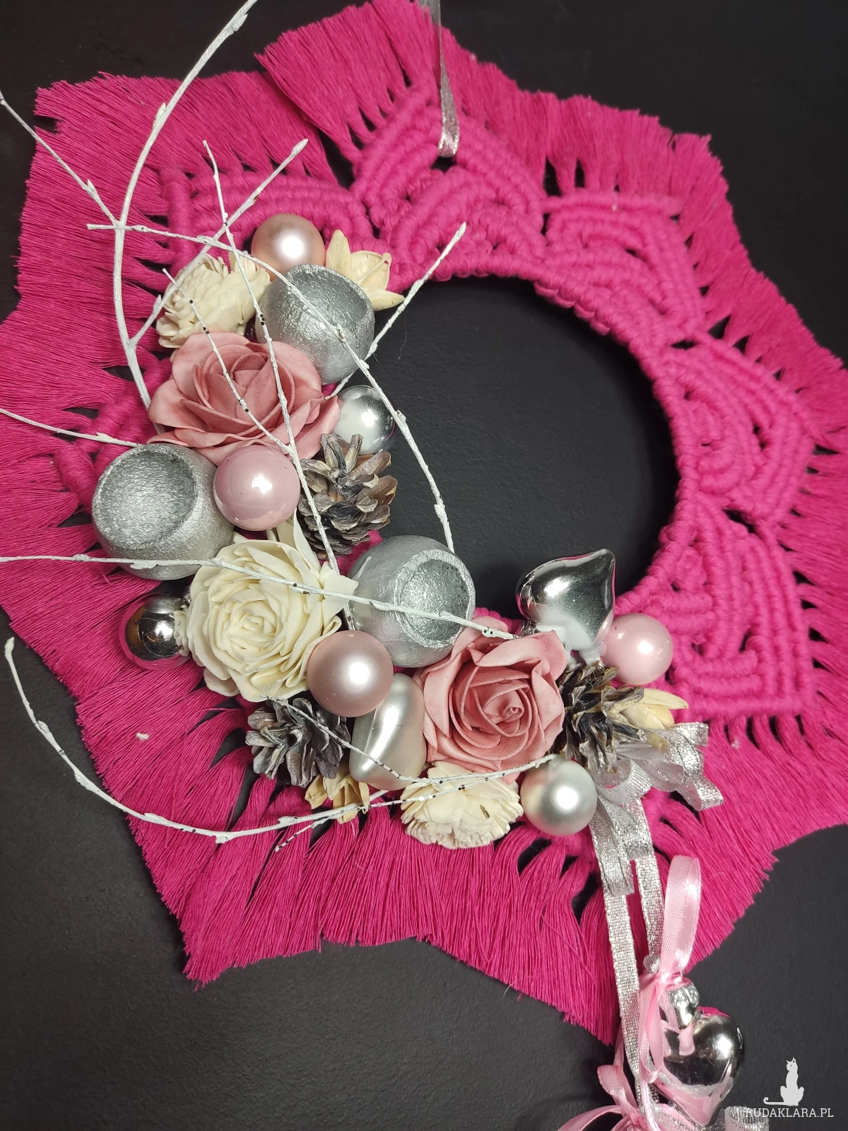 Sprzedam ręcznie wykonaną mandalę w stylu Boho wypleciona ze sznurka 5 mm w kolorze różowym o całkowitej średnicy 40 cm. Mandala została wykonana w tonacji świątecznej w kolorach różu, beżu oraz srebra.
