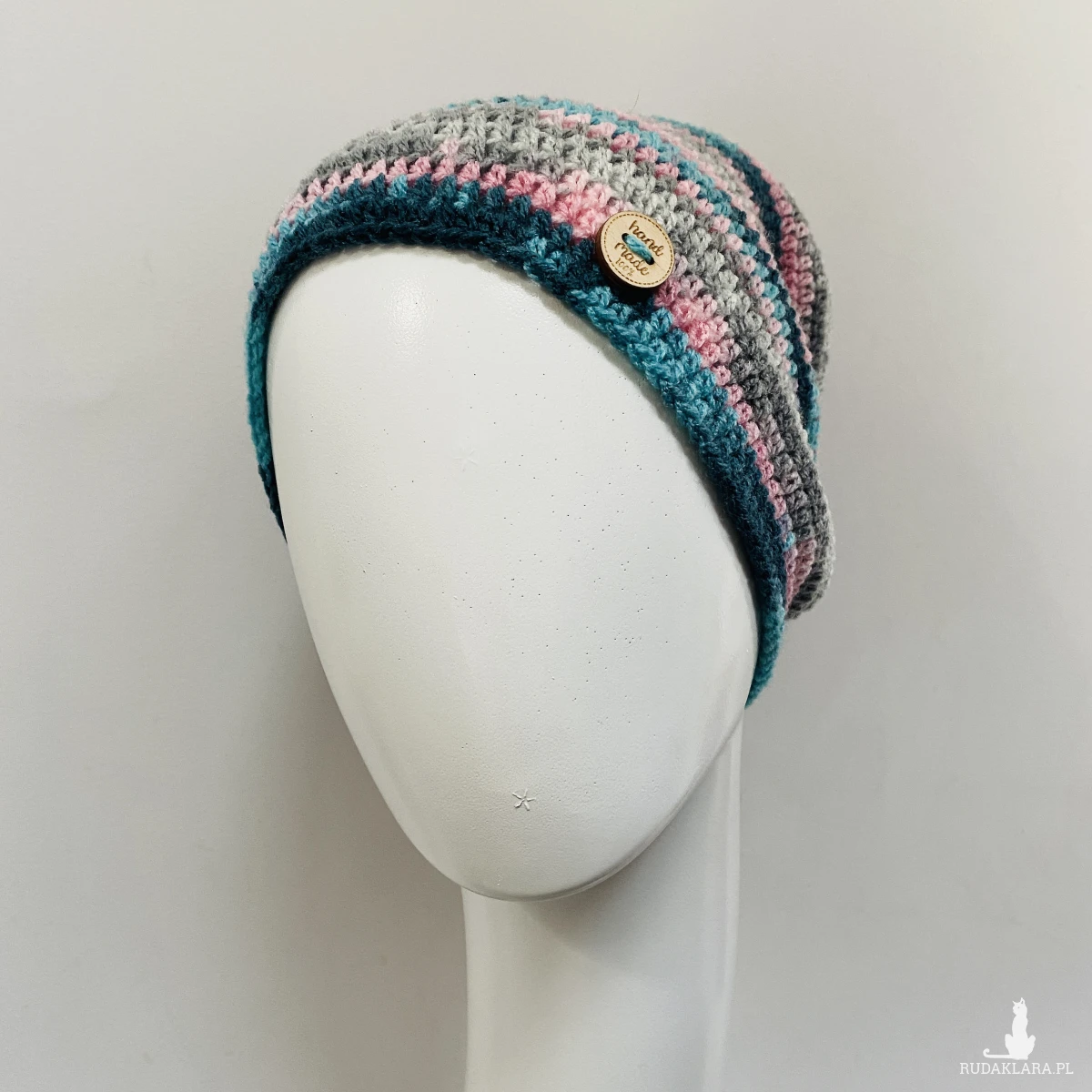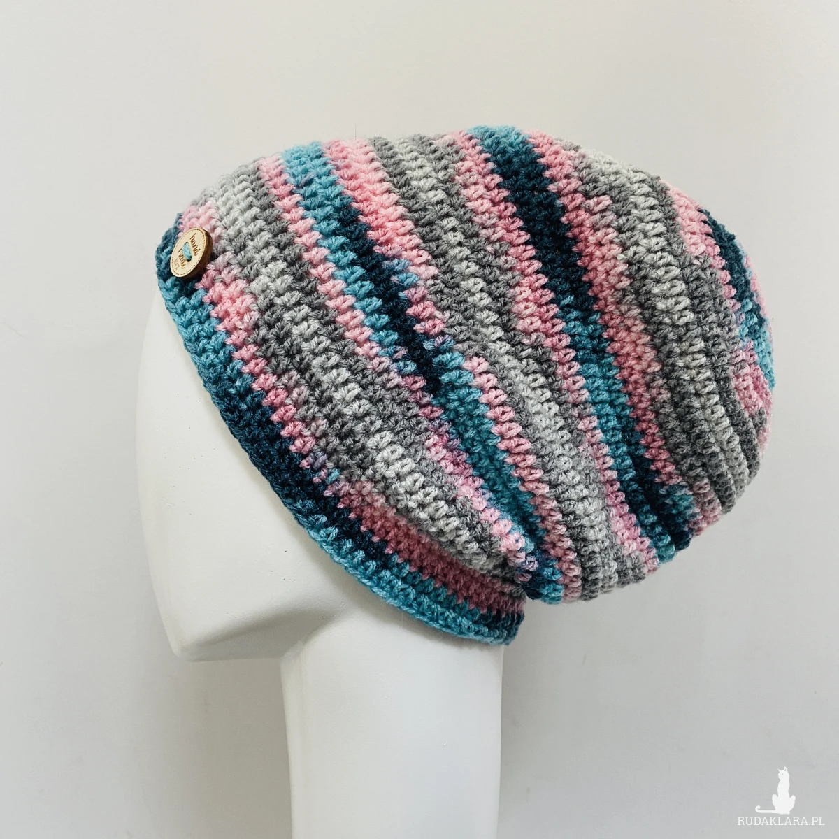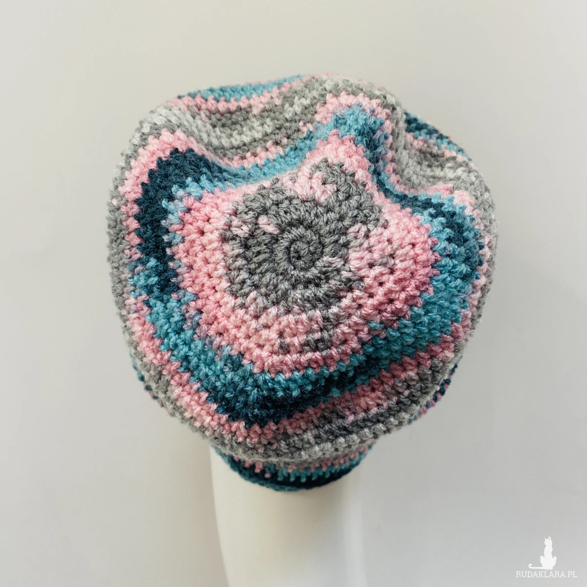 Czapkę wykonałam na szydełku z wysokiej jakości kolorowej włóczki akrylowej, z certyfikatem OEKO-TEX® Standard 100, który potwierdza, że jest bezpieczna dla zdrowia i nie zawiera niebezpiecznych substancji.