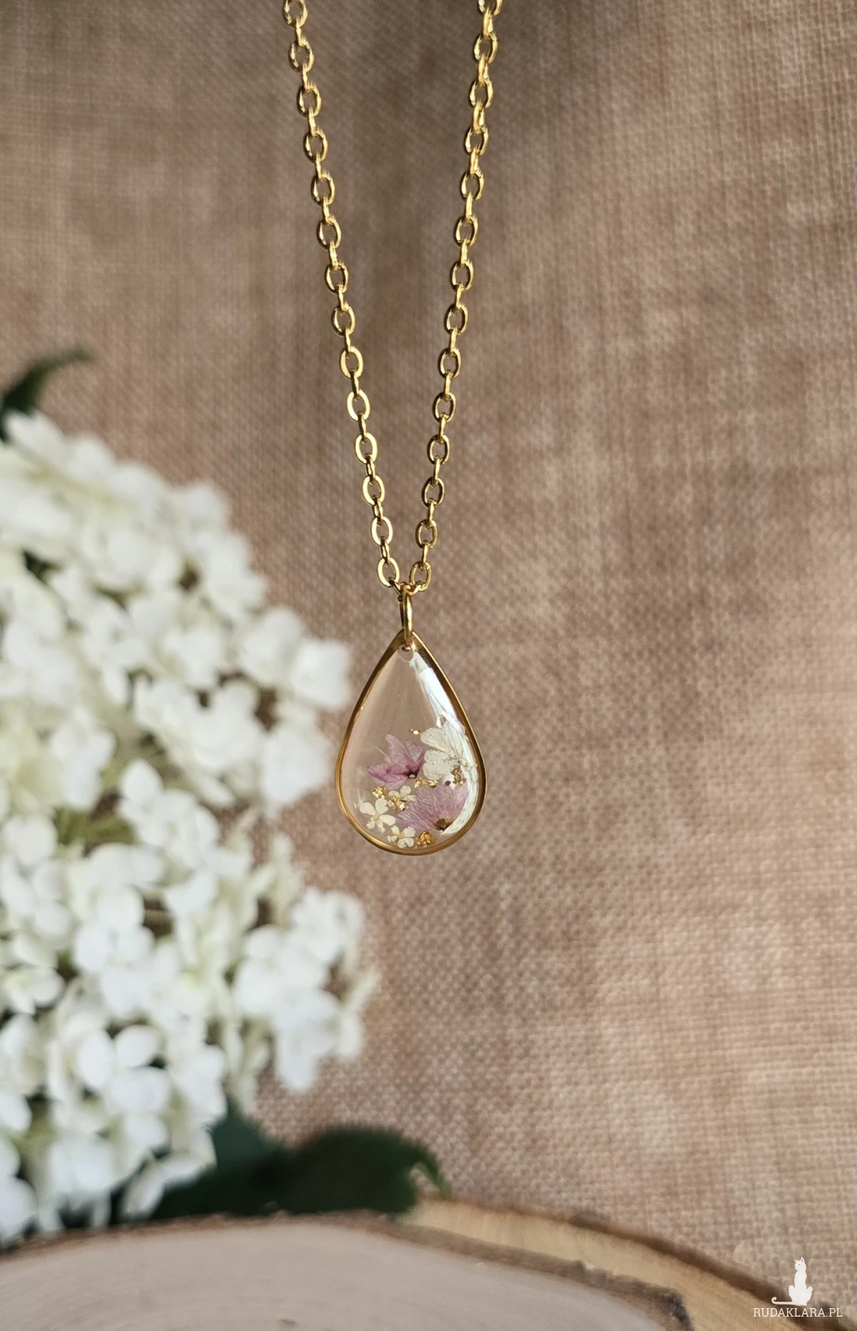 Oferuję Państwu unikalną biżuterię. Zawieszka jest wykonana z suszonych kwiatów i żywicy epoksydowej. Biżuteria jest wspaniałym i oryginalnym prezentem na lata.