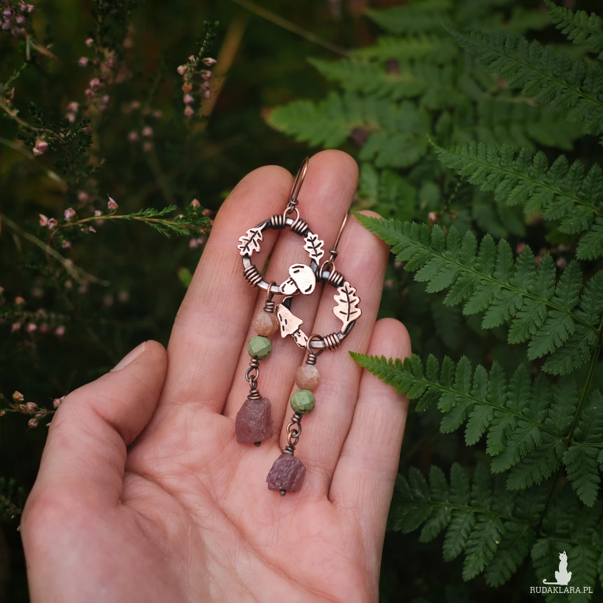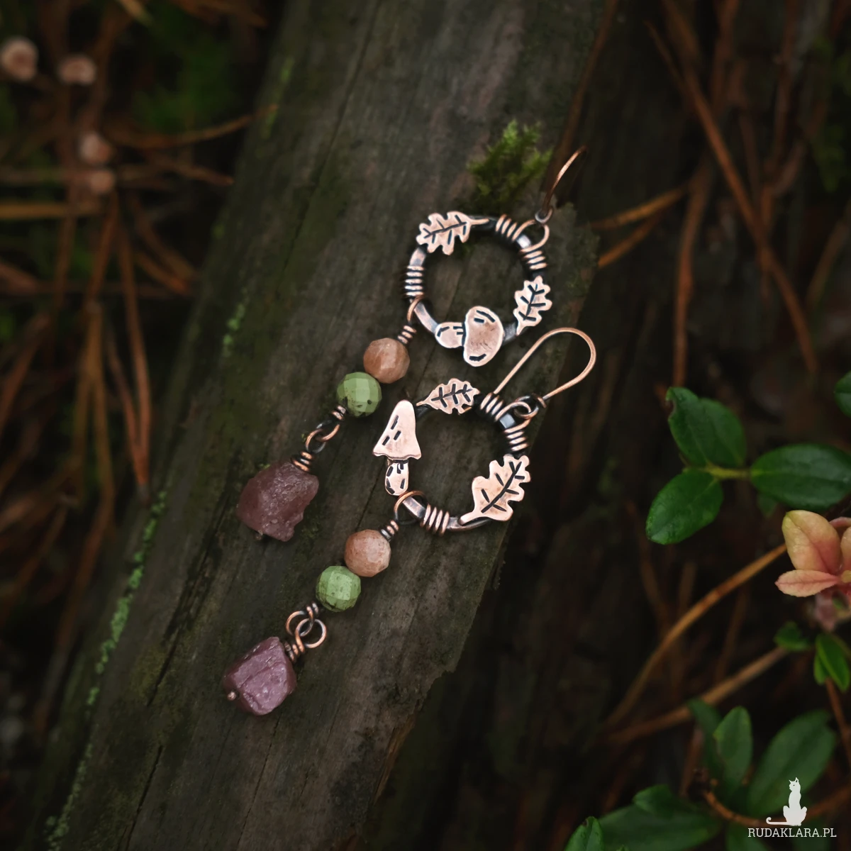 Miedziane unikatowe kolczyki kółka z grzybkami i liśćmi. Urocze i delikatne w bajkowym leśnym klimacie, posiadają kamienie słoneczne, turkus oraz różowe bryłki turmalinu. Sprawdzą się na co dzień jak i na większe okazje. Idealna propozycja dla fanek przyrody, grzybobrania i leśnych wojaży :-)