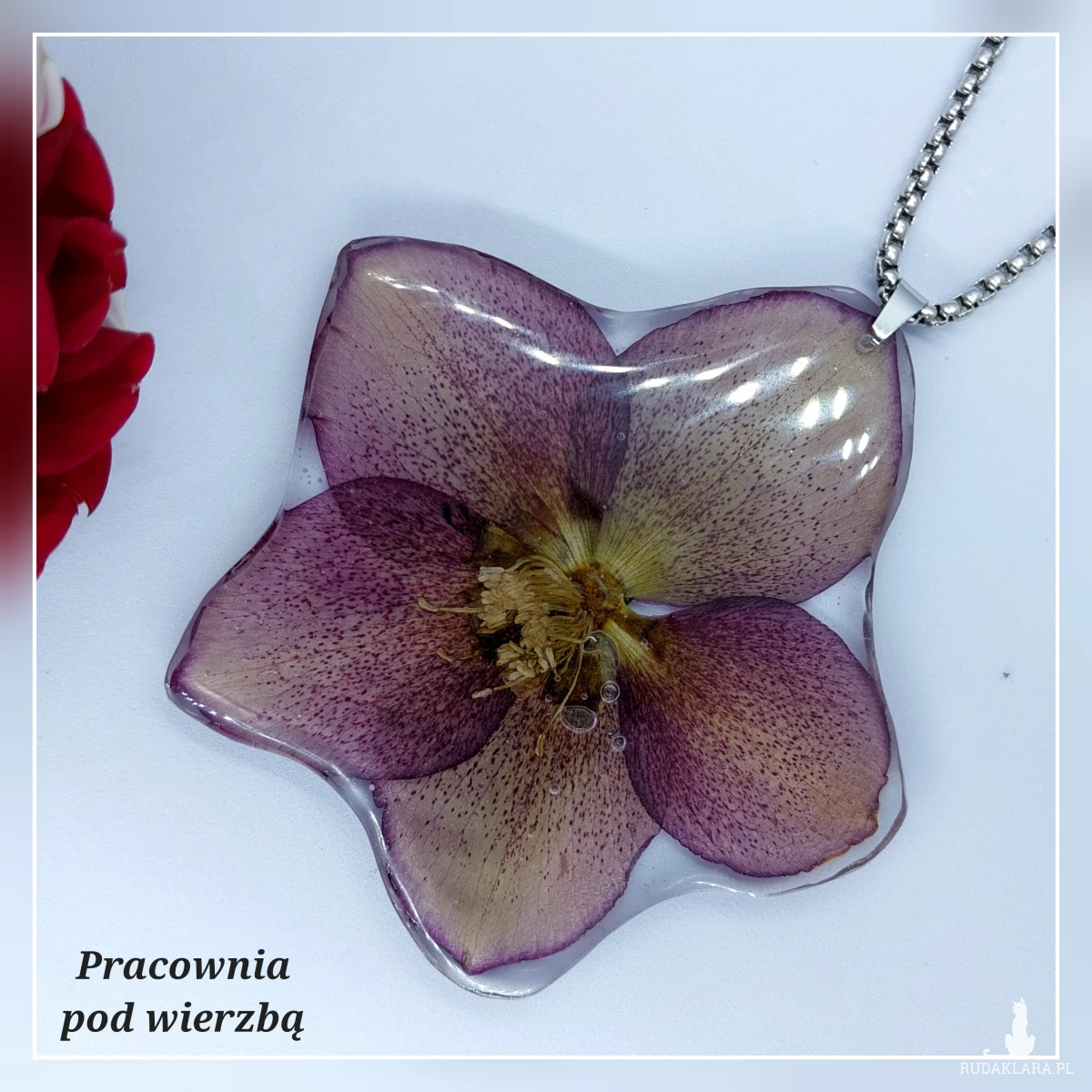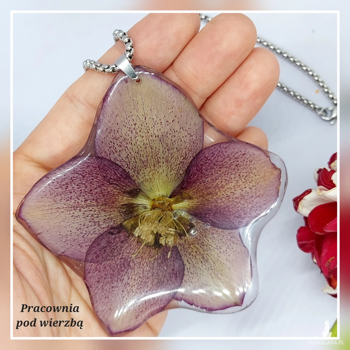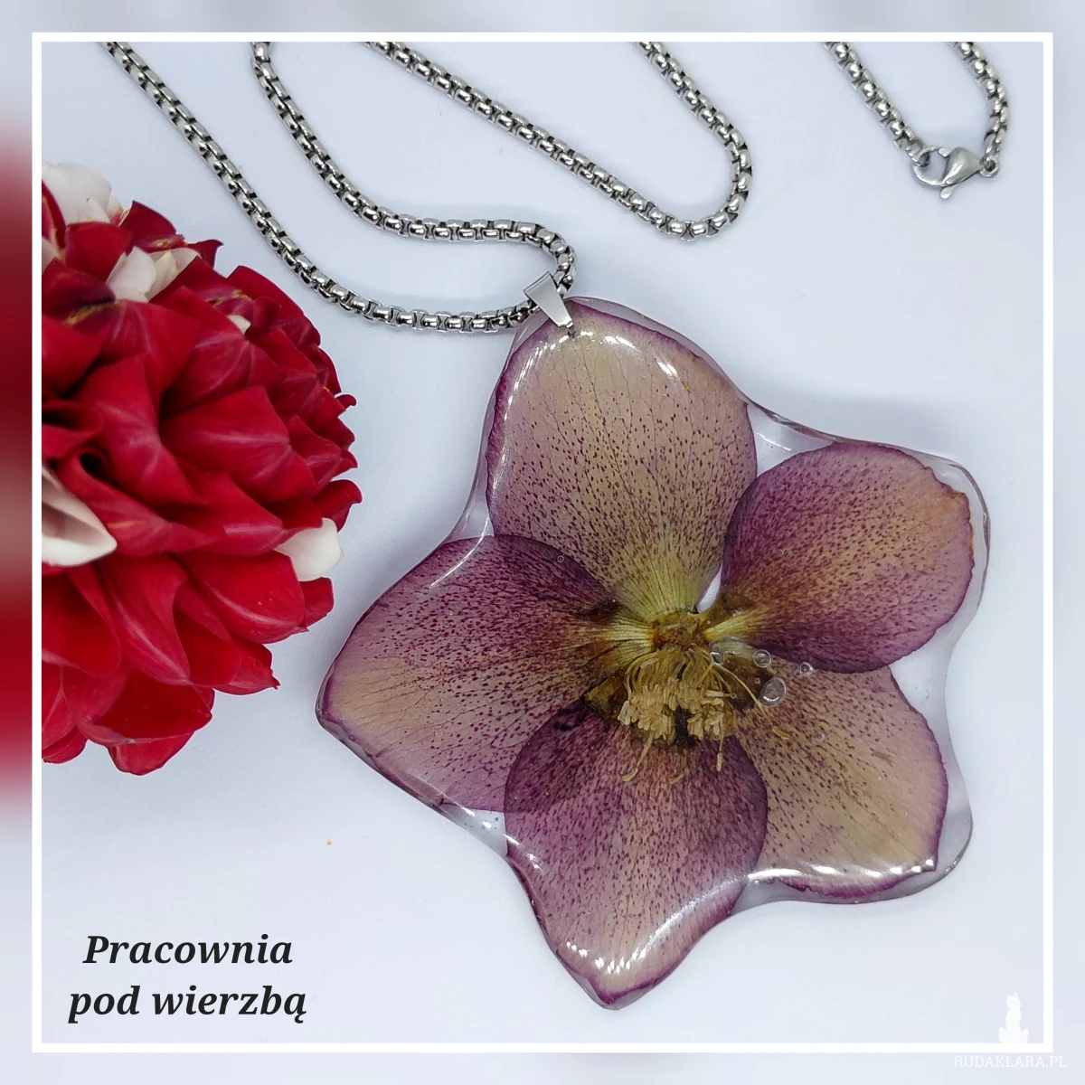 Wyjątkowy duży naszyjnik z prawdziwym kwiatem ciemiernika.