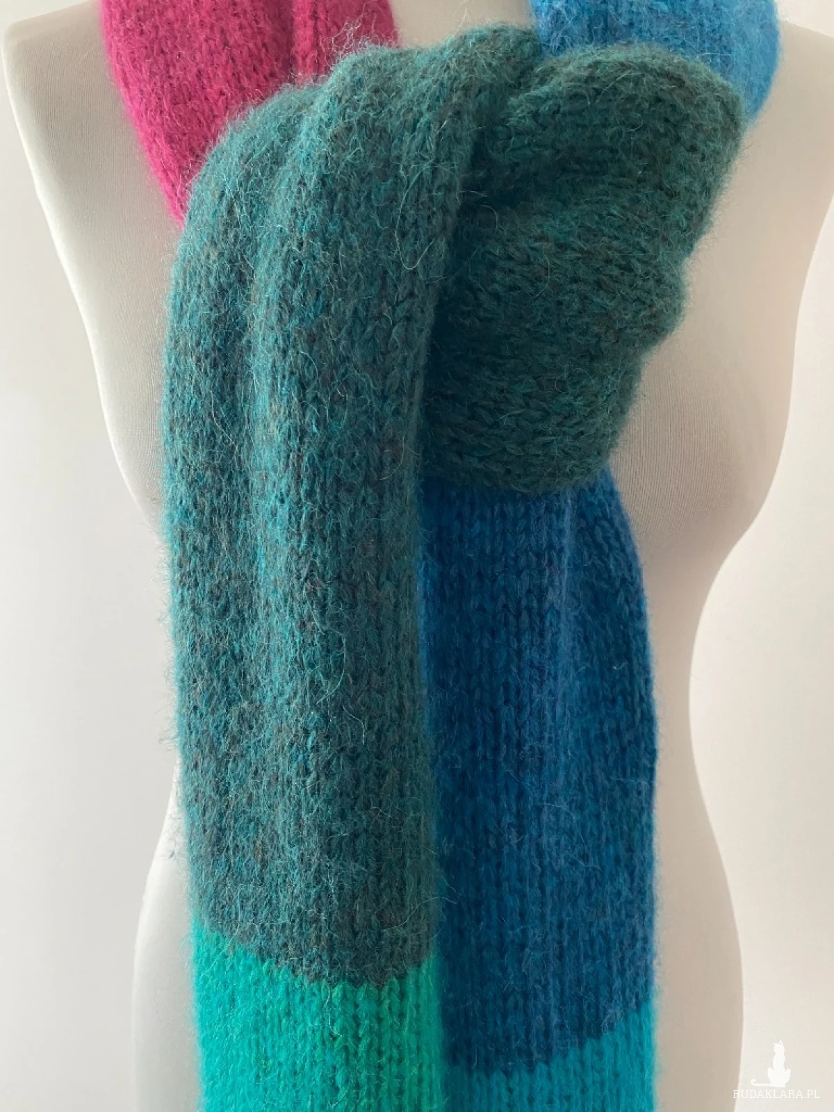 Długi wełniany szal, wykonany ręcznie przeze mnie. Bardzo delikatny, miękki i ciepły szal w wielokolorowej kolorystyce.